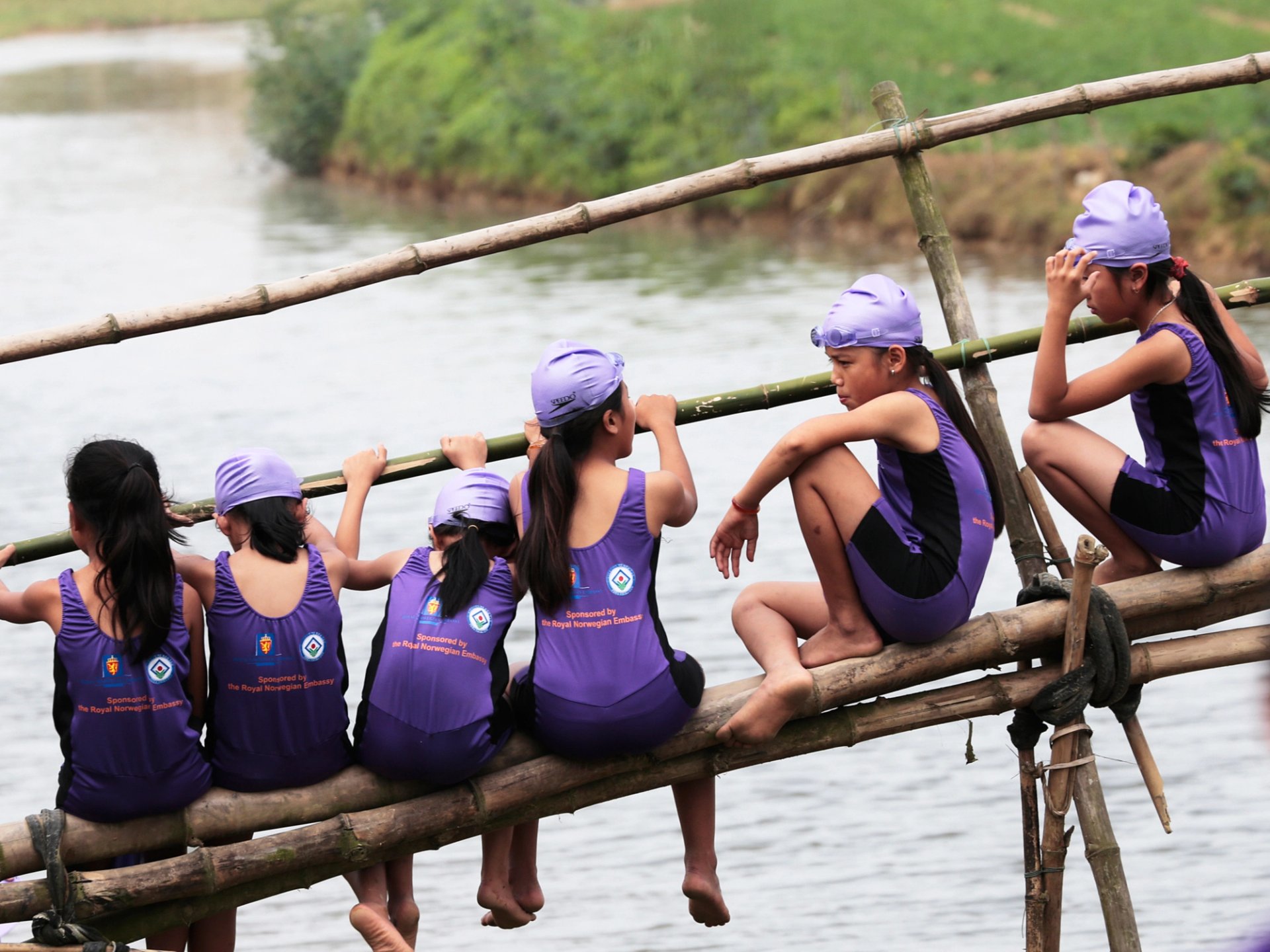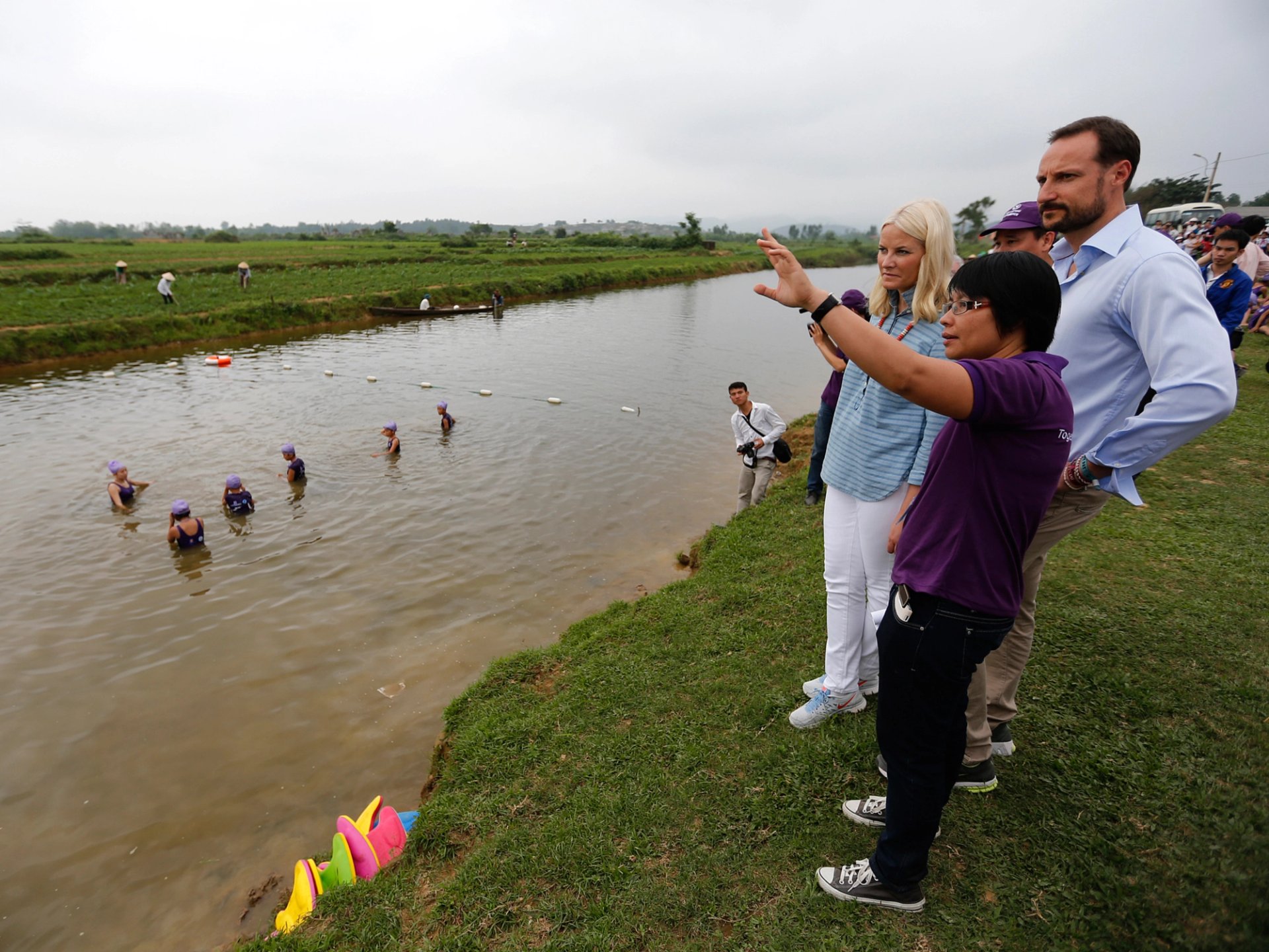 Flere hundre barn med vietnamesiske og norske flagg møtte Kronprinsparet da de kom for å lære mer om prosjektet. Barna demonstrerte trening og svømmeøvelser både på land og i elven like ved.