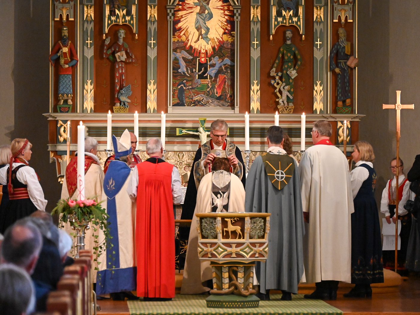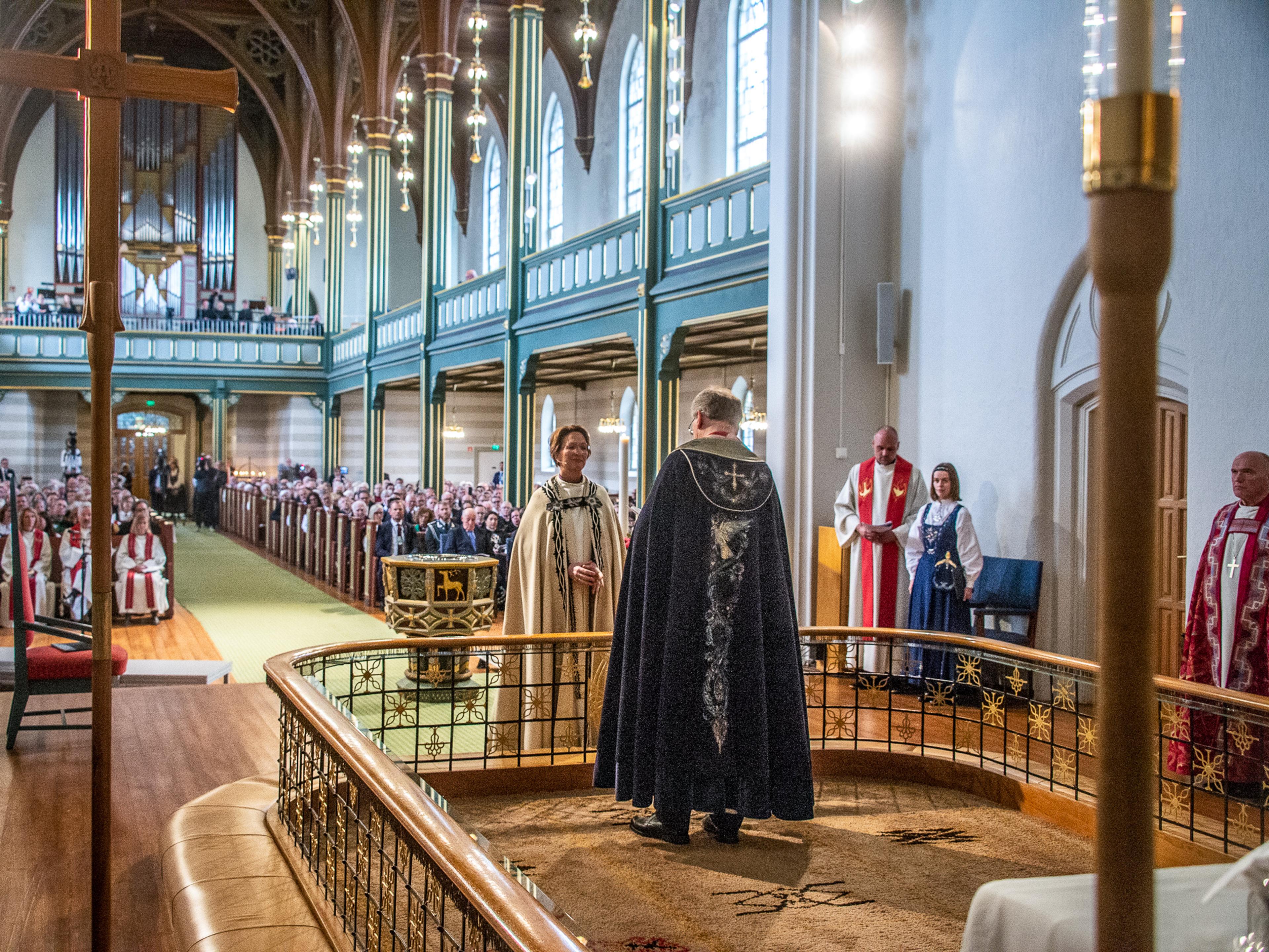 Biskoper og prester fra inn- og utland deltok i forbønnen. Kari Mangrud Alvsvåg avla bispeløftet for preses, som la bispekorset rundt halsen hennes som et synlig tegn på at hun nå er vigslet til biskop i Den norske kirke.