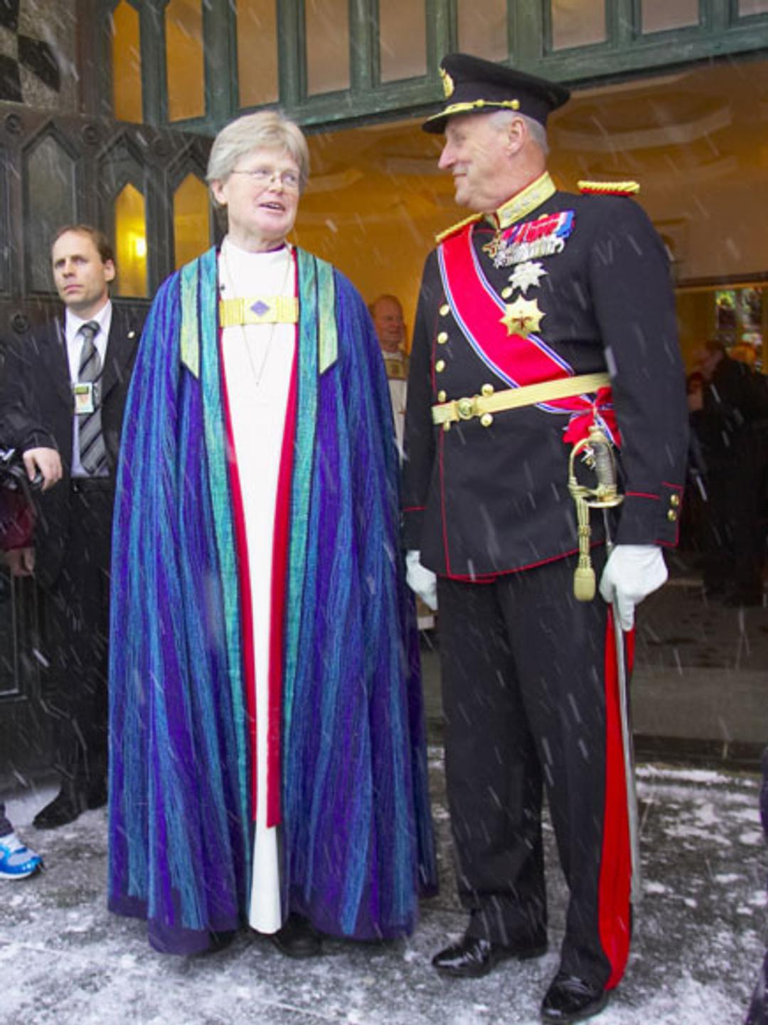 Foruten Kongen var også statsråd Trond Giske og mange fremtredende kirkeledere til stede under vigslingsgudstjenesten.