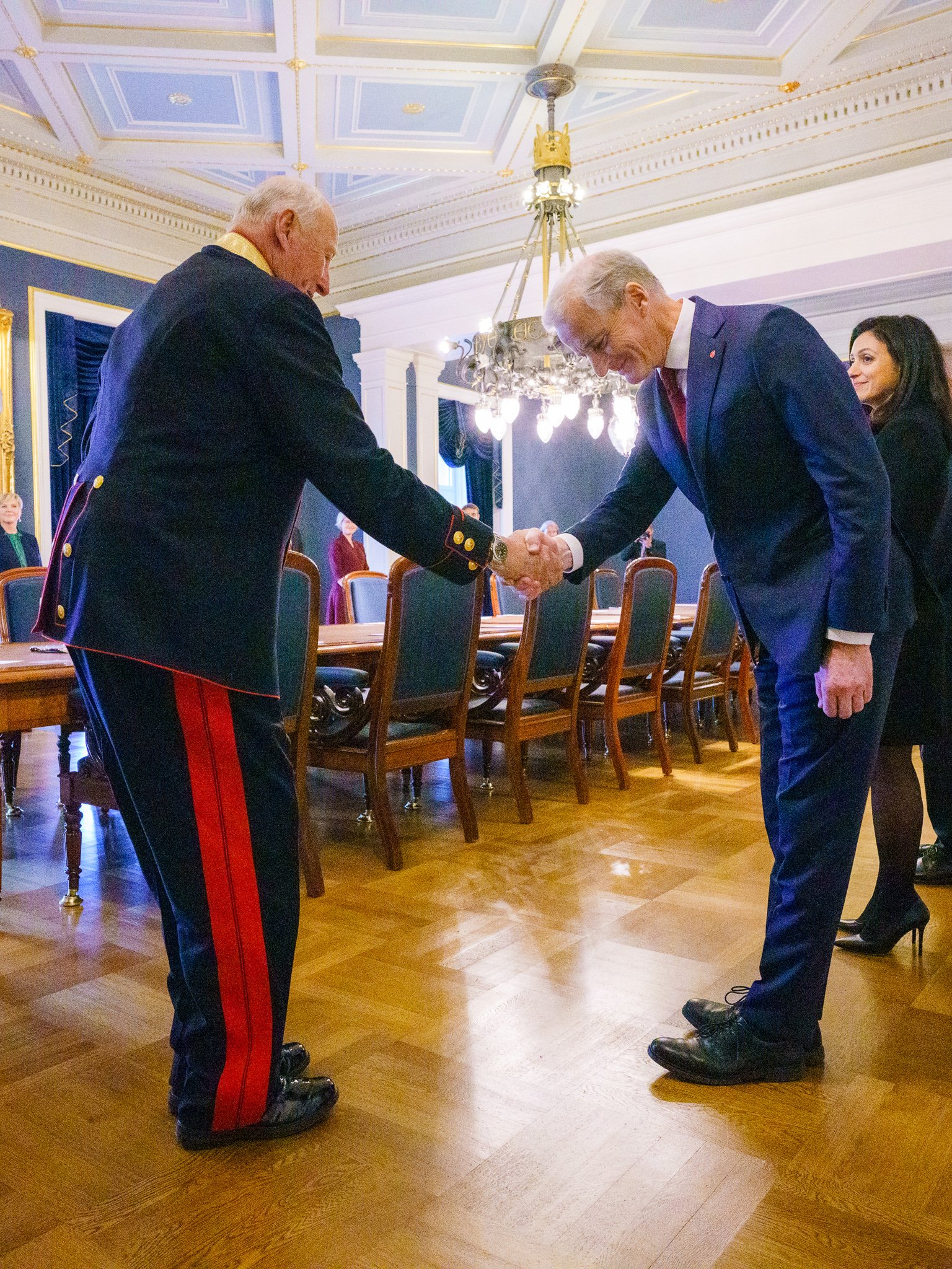 Kongen har ei viktig konstitusjonell rolle ved regjeringsskifte. Formelt var det Kong Harald som gav Støre i oppdrag å danne ei ny regjering, da tidlegare statsminister Erna Solberg leverte avskjedssøknaden sin tysdag denne veka.