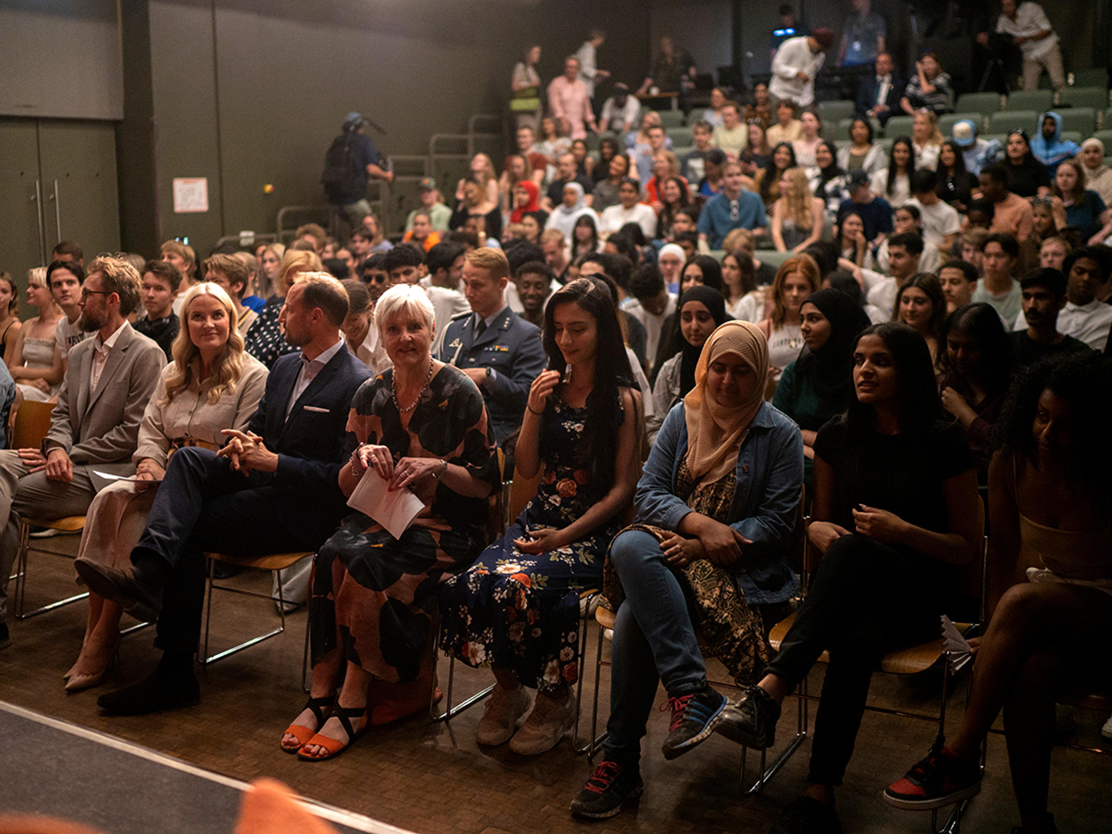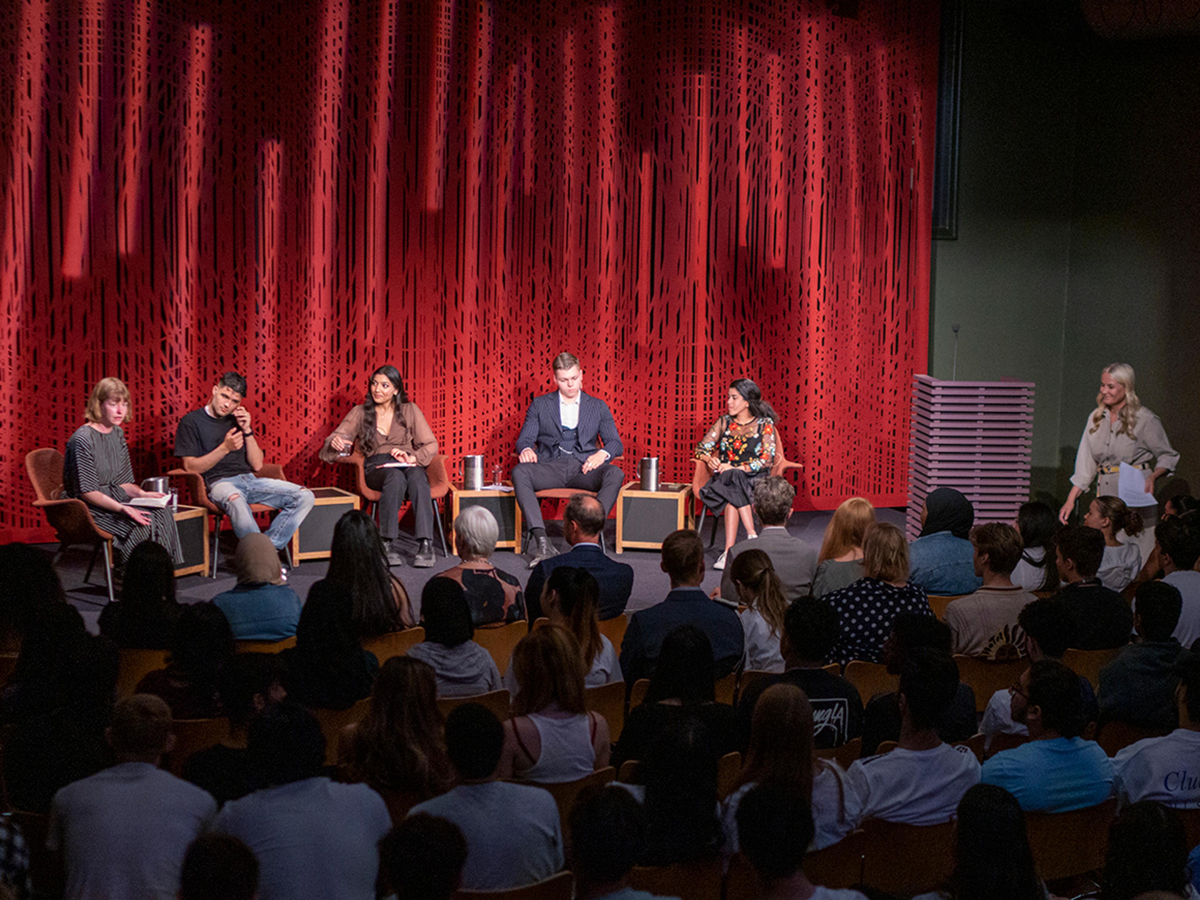 Kronprinsen og Kronprinsessen tok turen til den store Wergelandssalen i Litteraturhuset i Oslo. Sammen med elever fra Kuben videregående skole overvar de en litteratursamtale mellom unge forfattere og kulturpersonligheter med base i Oslo. I panelet satt representanter for en bølge av nye og viktige stemmer i norsk litteratur.