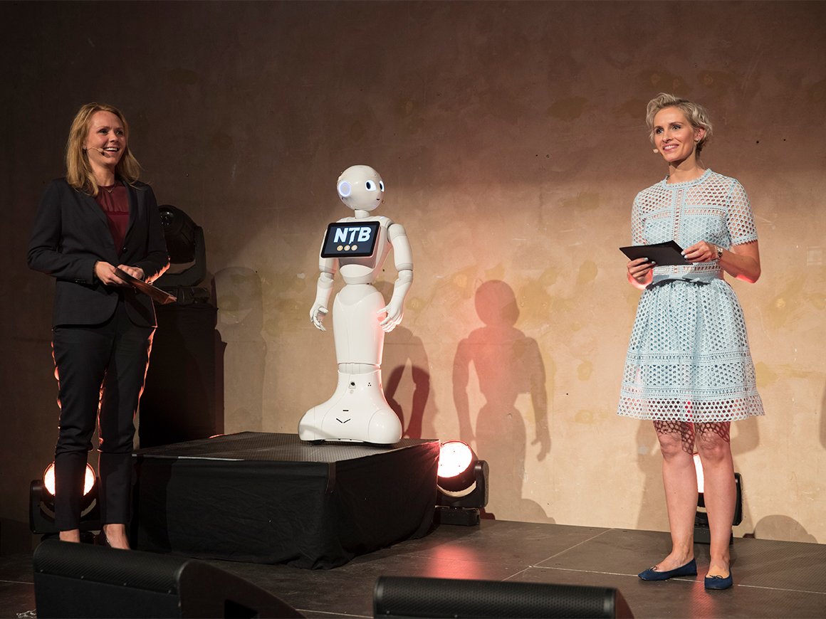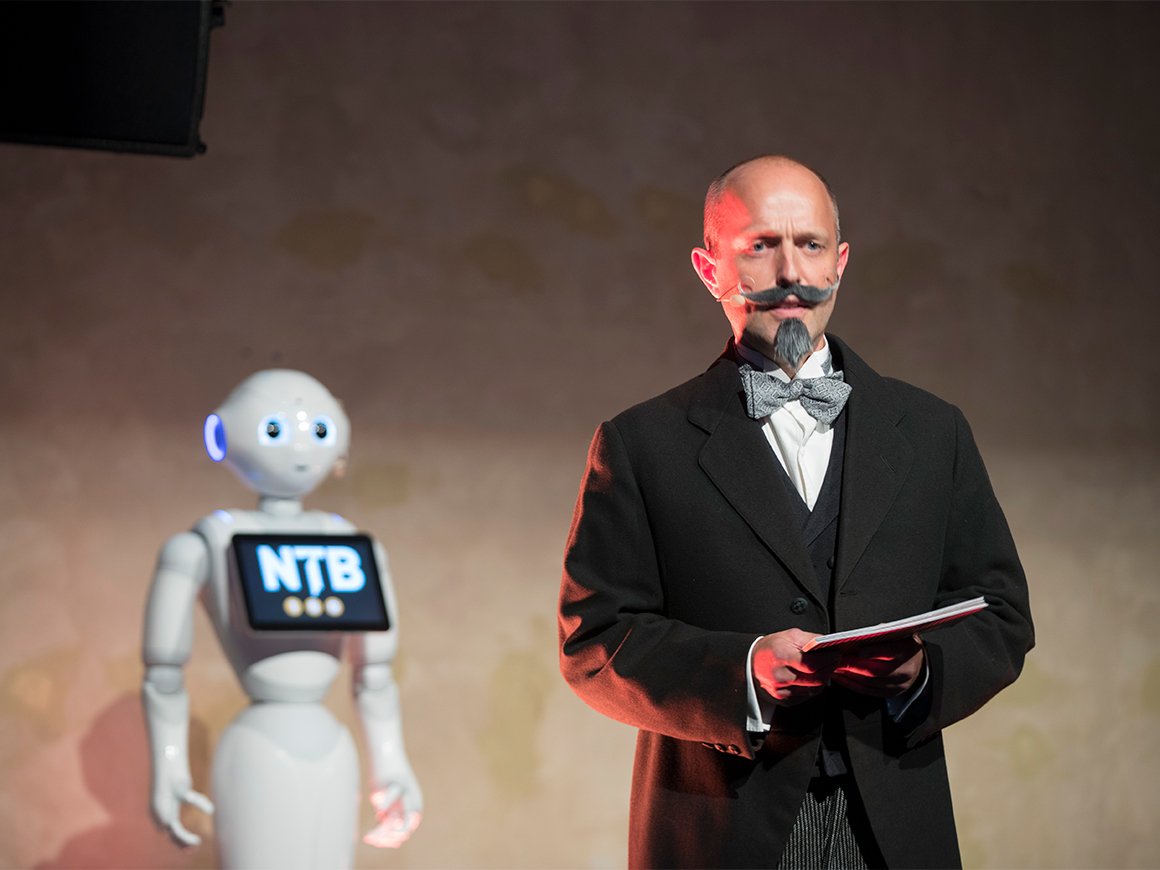 Det var mange som ønsket å gratulere jubilanten i dag. I tillegg til NTBs egne, Lohne og Storvik, kunne konferansier Anne Rimmen ønske både Norsk Presseforbunds Elin Floberghagen og kulturminister Linda Hofstad Helleland velkommen på talerstolen - før hun deltok i samtale med konferansier og roboten Pepper.