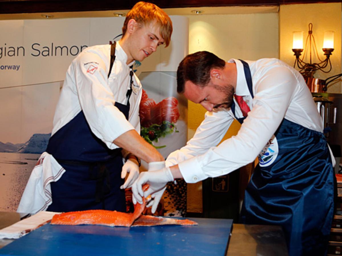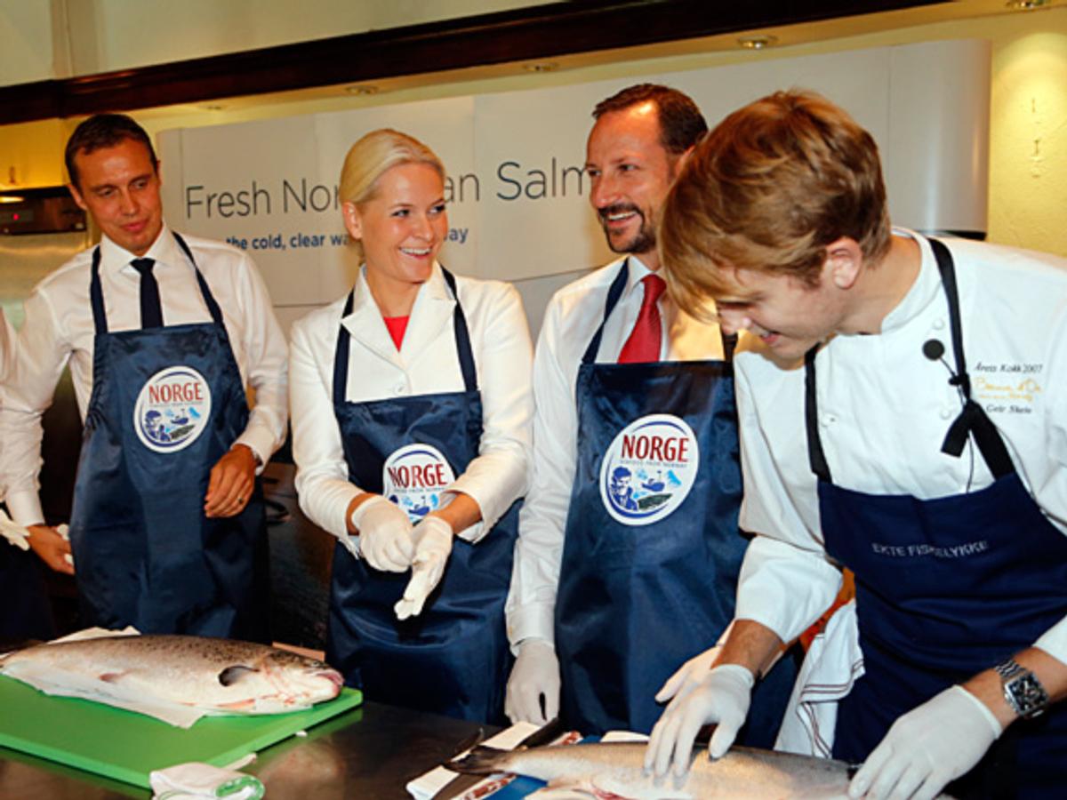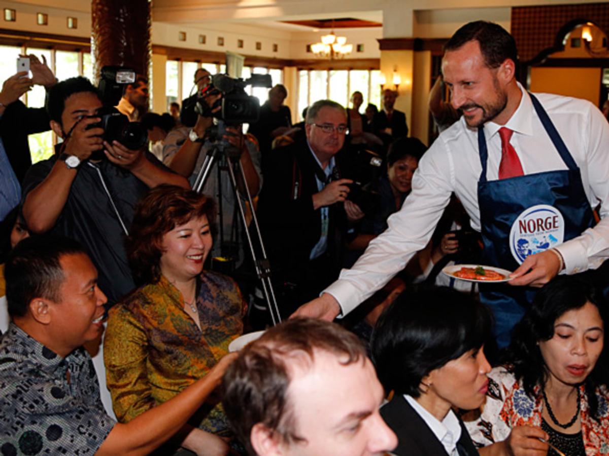 I dag deltok Kronprinsen og Kronprinsessen i promoteringen av norsk sjømat på Hotel Shangri-La. Mesterkokken Geir Skeie presenterte norsk laks for de indonesiske gjestene, og fikk hjelp av et forklekledd Kronprinspar til å forberede og servere lakserettene.