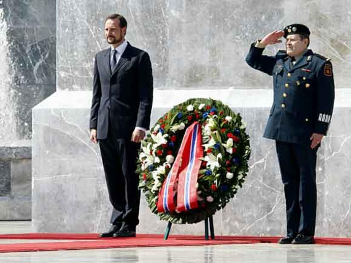 Kronprins Haakon la ned krans ved monumentet under en høytidelig seremoni.