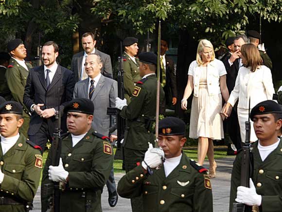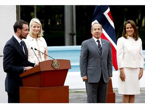 Den offisielle velkomstseremonien fant sted i den mexicanske presidentboligen, Los Pinos. Her ble Kronprins Haakon og Kronprinsesse Mette-Marit tatt i mot av President Felipe Calderón og hans kone Margarita Zavala i et lite tempel i tilknytning til residensen. Kronprinsparet vil også møte med President Calderón og fru Zavala senere i besøket.