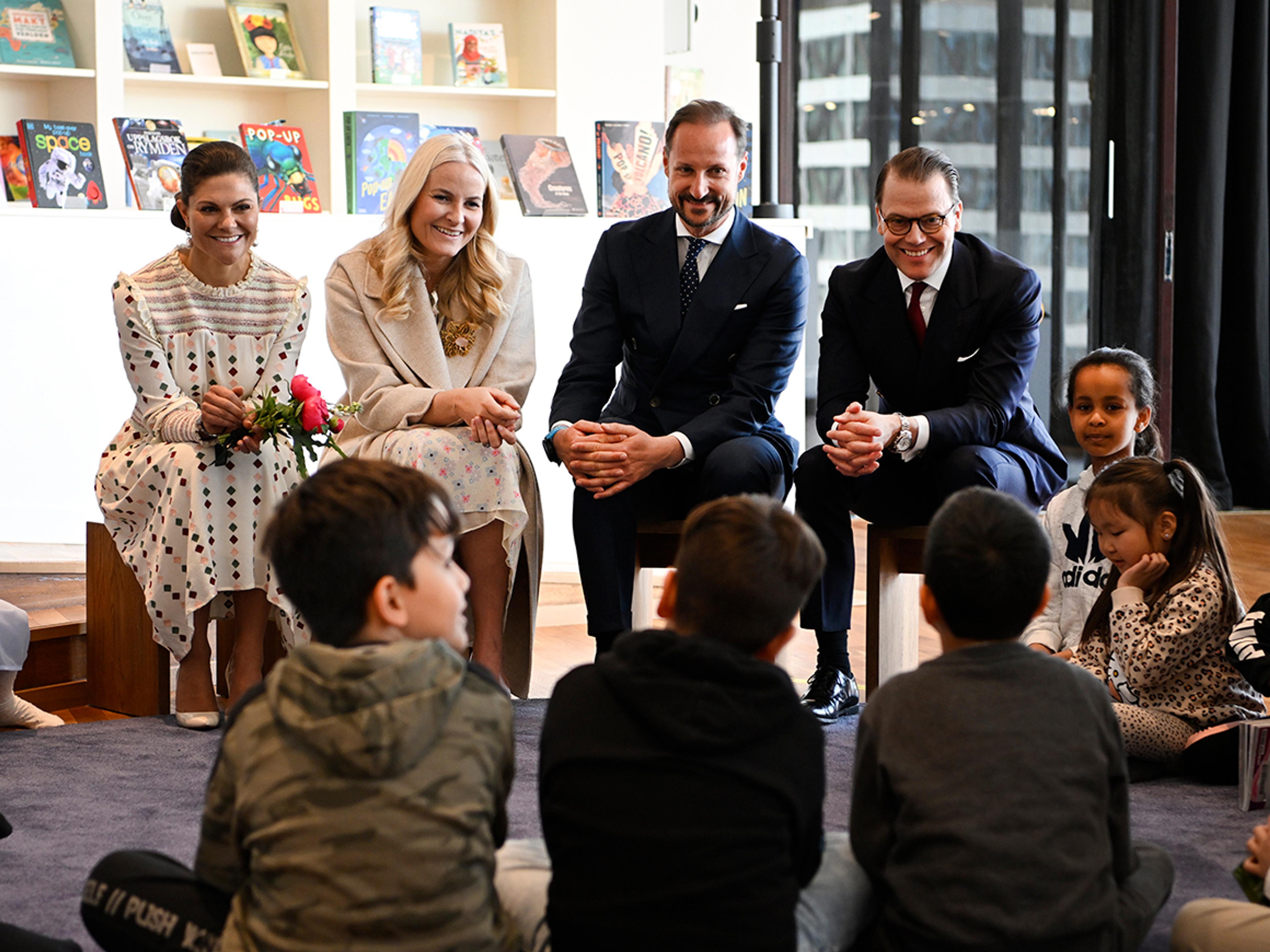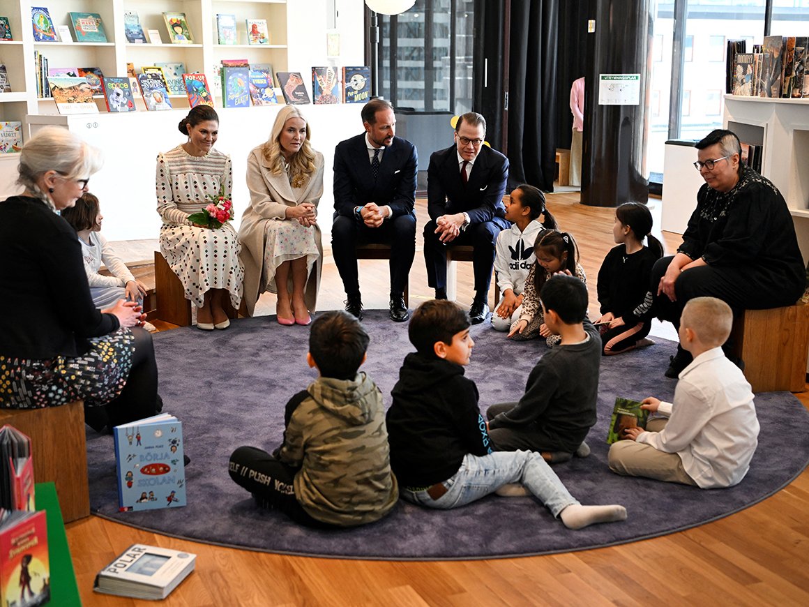 På Kulturhuset i Stockholm møtte det kongelige følget barn til en samtale om bøker. Flere av forfatteren Anna Fiskes bøker er oversatt til svensk - blant annet "Hvordan man begynner på skolen", og Elias Våhlunds "Håndbok for superhelter" er utgitt i Norge. Både Fiske og Våhlund deltok i samtalen med barna i dag, og barna hadde lest bøkene på forhånd.