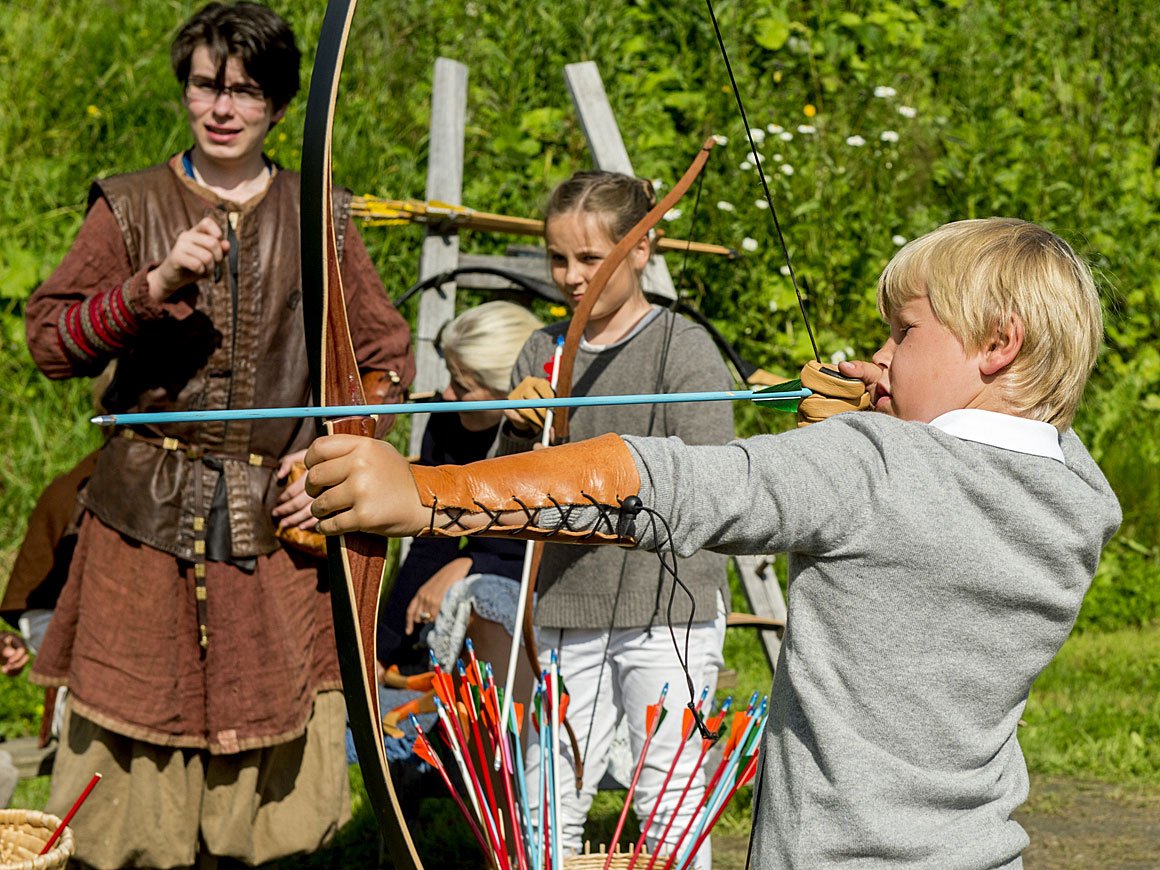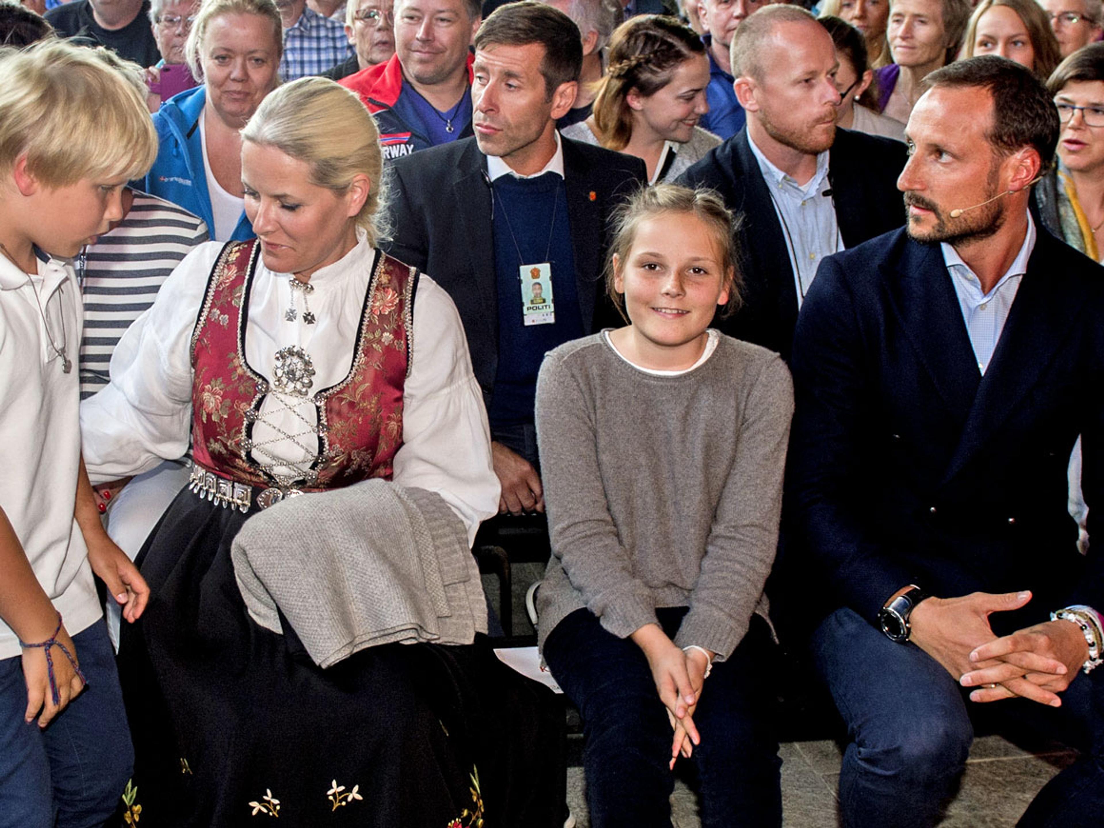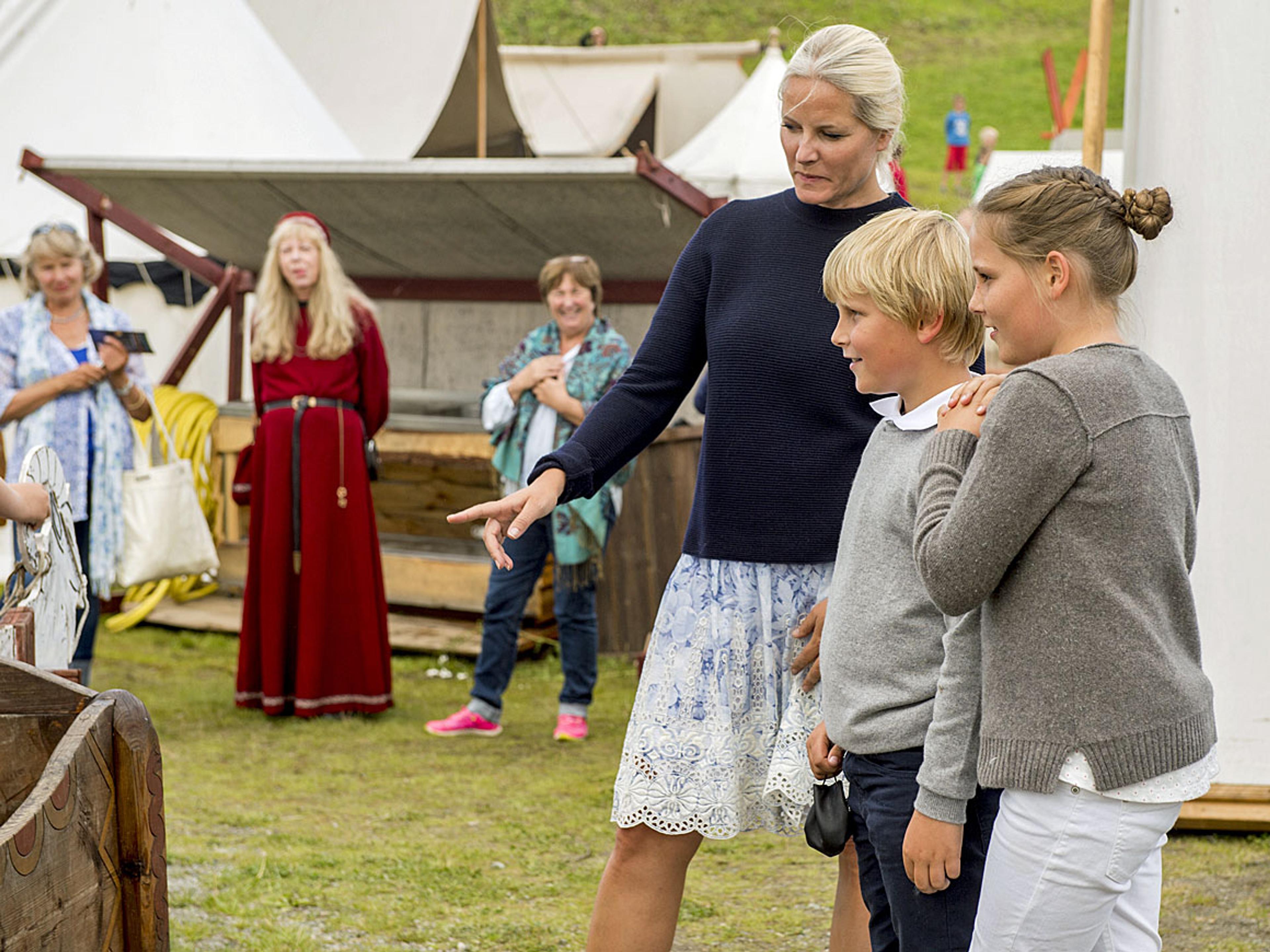 Kronprinsfamilien besøkte middelaldermarkedet, og Prinsesse Ingrid Alexandra og Prins Sverre Magnus fikk både prøvd seg med hesteridning og bueskyting.