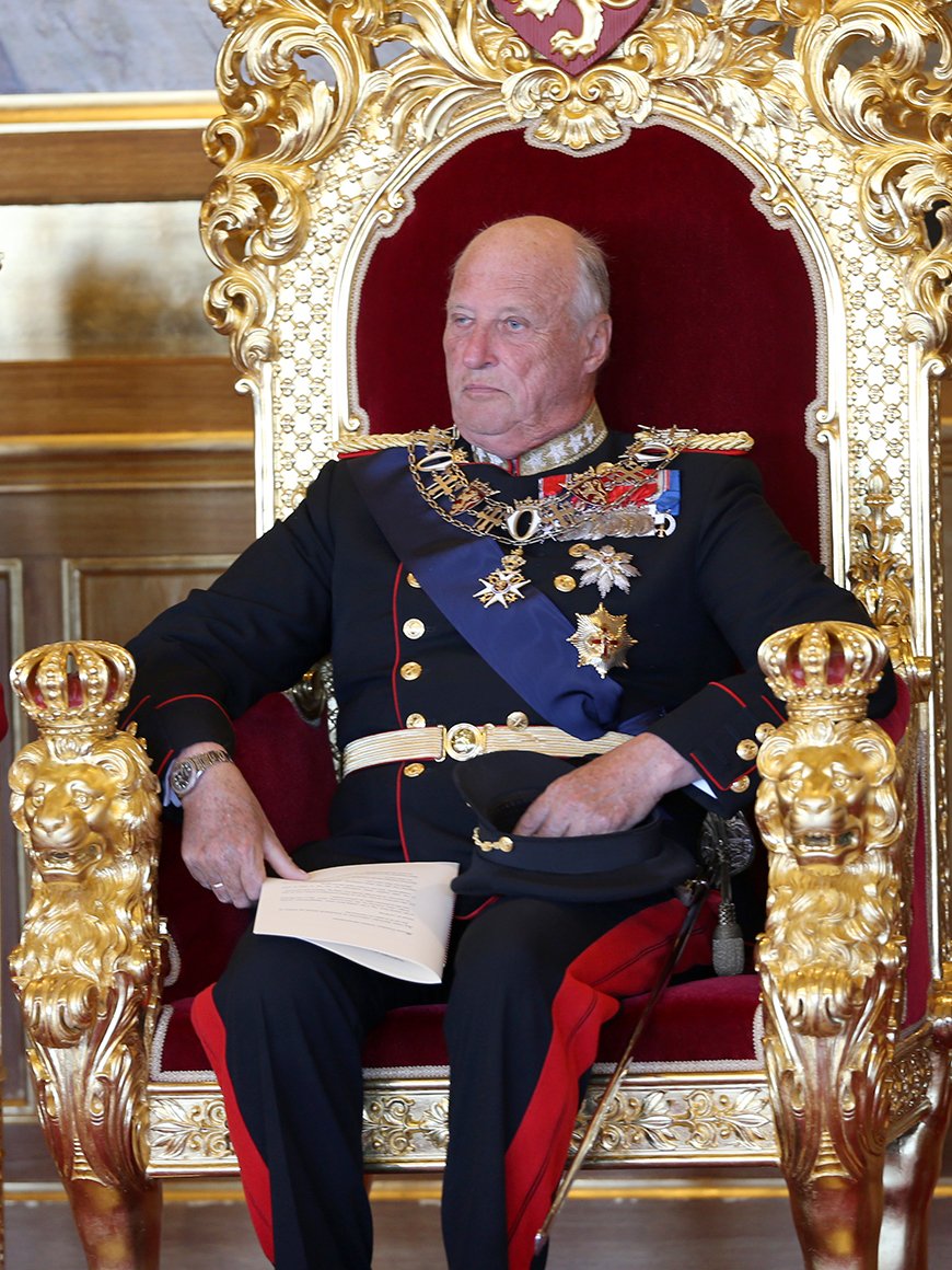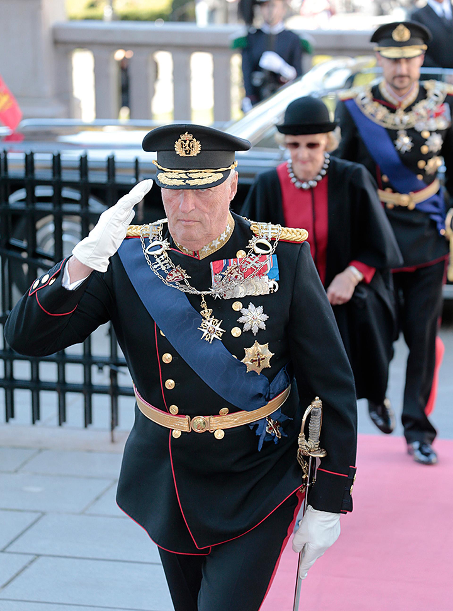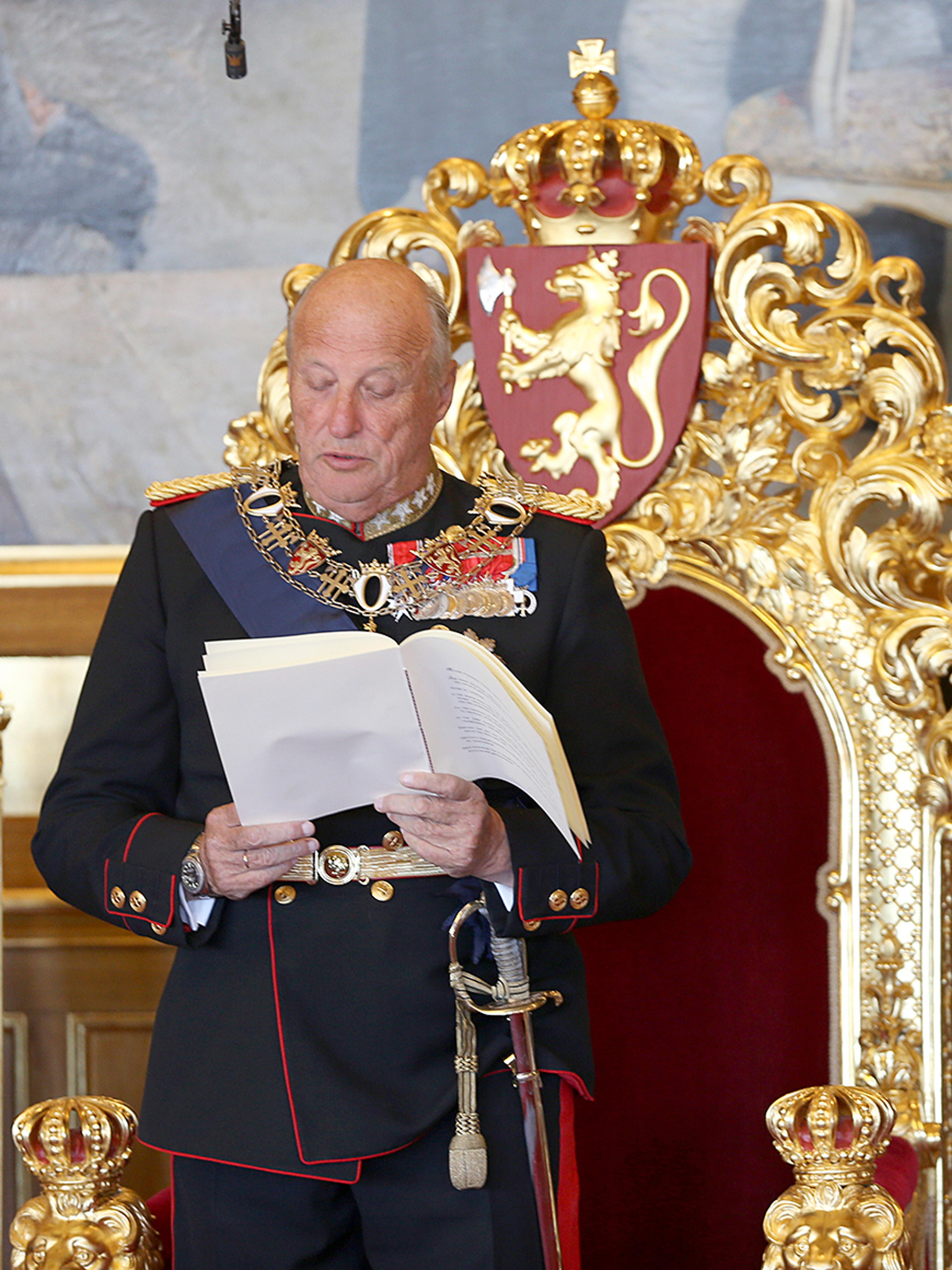Hans Majestet kom til Stortinget like før klokka 13.00, følgd av Hennar Majestet Dronninga og Den Høgvørde Kronprinsen. Dette er normalt den einaste gongen Kongen besøkjer Stortinget i løpet av eit år, og den einaste gongen både Konge og Regjering, Storting og Høgsterett er samla.