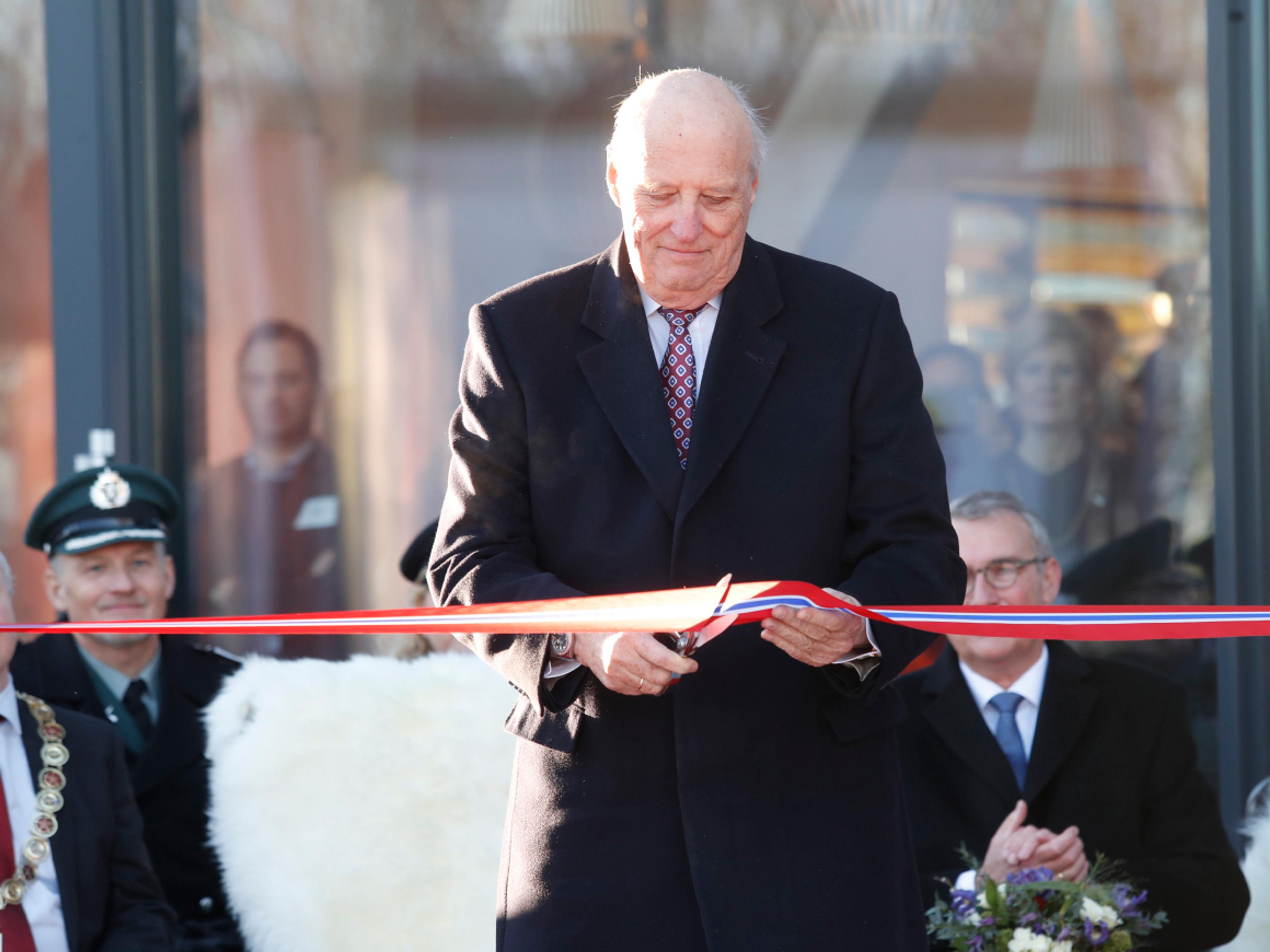 Kongen klipte over det raude bandet under påsyn av Horten-ordførar Are Karlsen, tilsette og frivillige i Redningsselskapet – og barnehagebarn i strålande vintervêr.