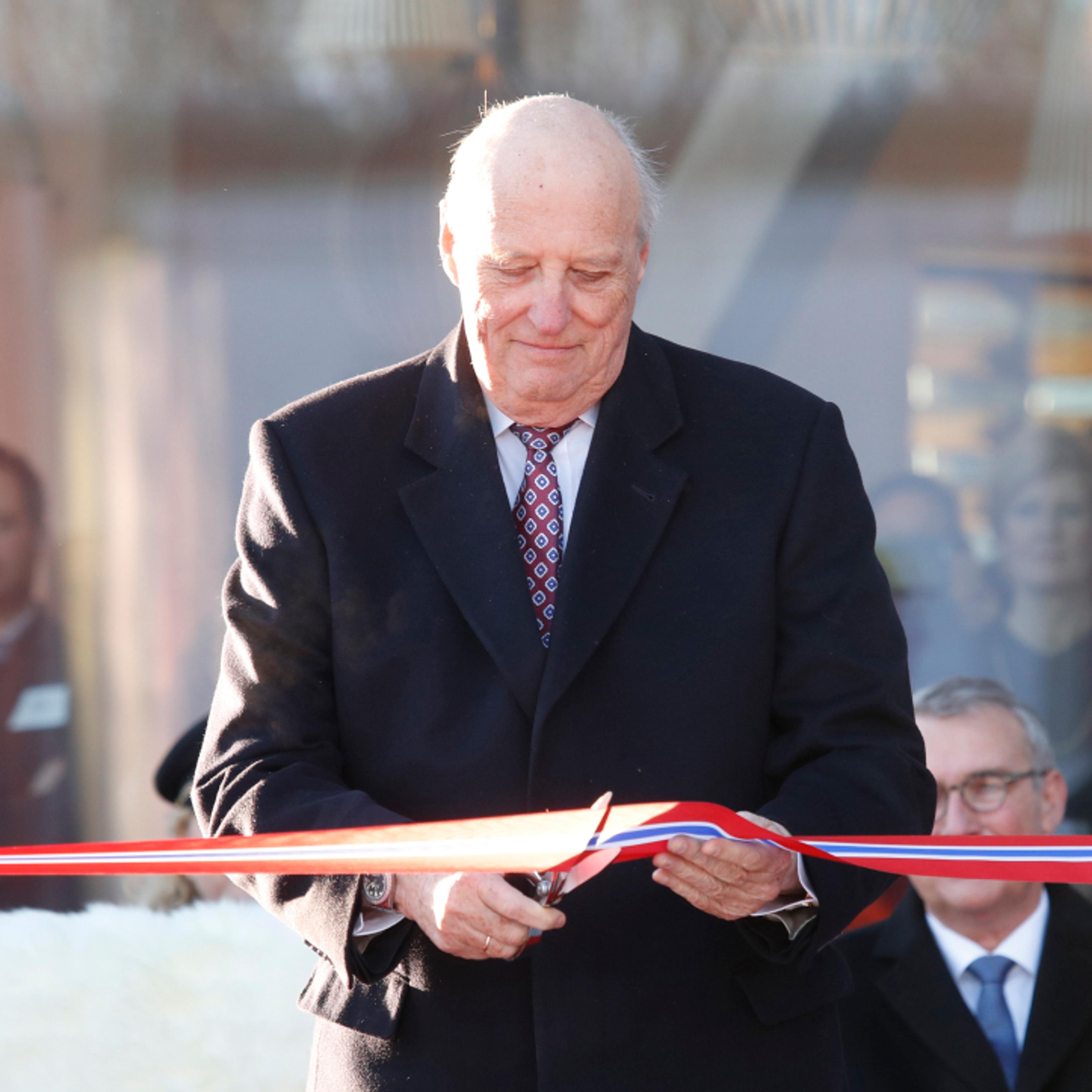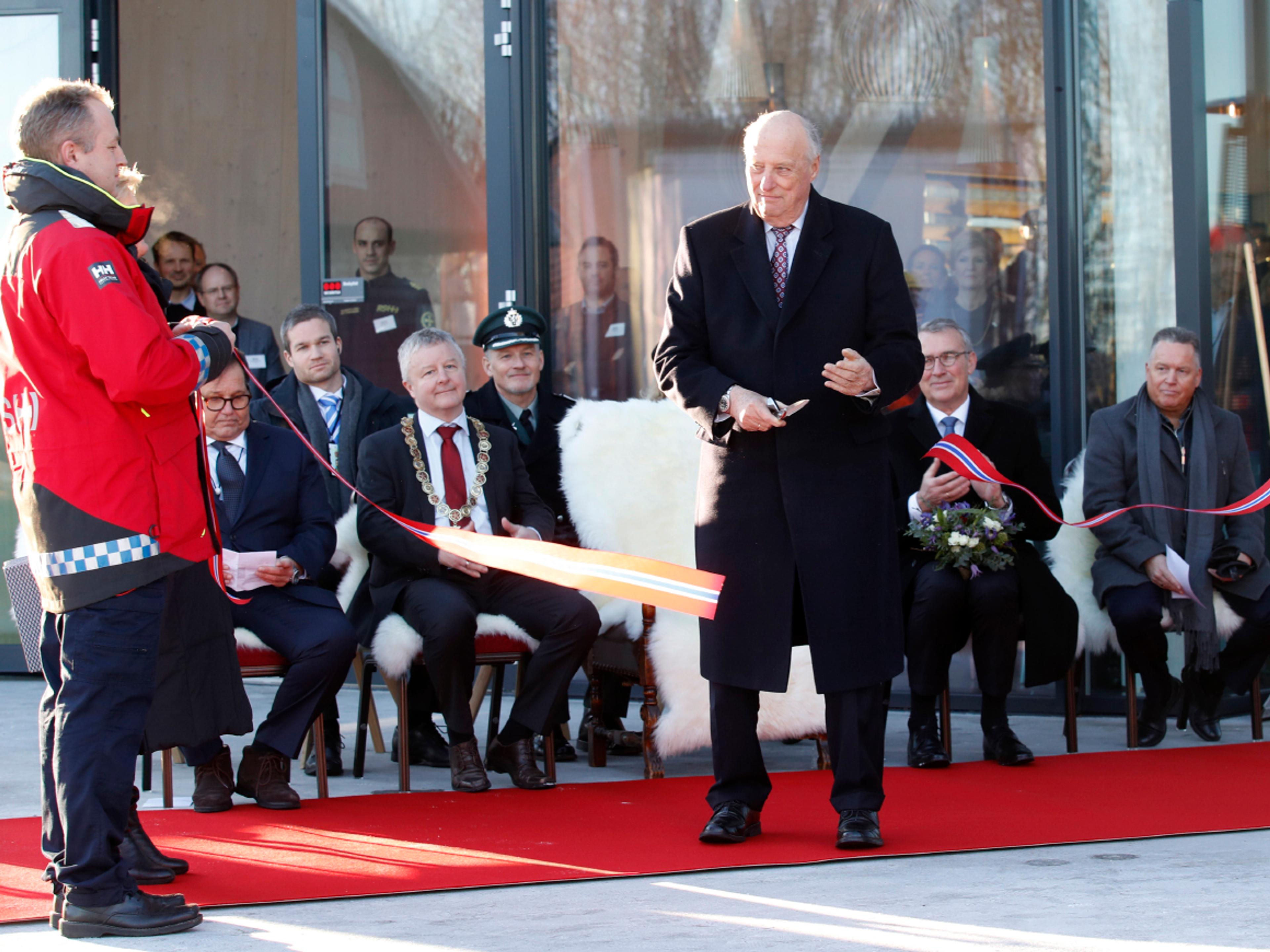 Til å klippe over bandet fekk Kongen overrekt ei saks av Redningsselskapets Runar Iversen. Han jobbar til dagleg som redningsmann og kom til opninga inst i bukta med eit lite, raudt redningsfartøy like etter at Kongen kom klokka 13.00.