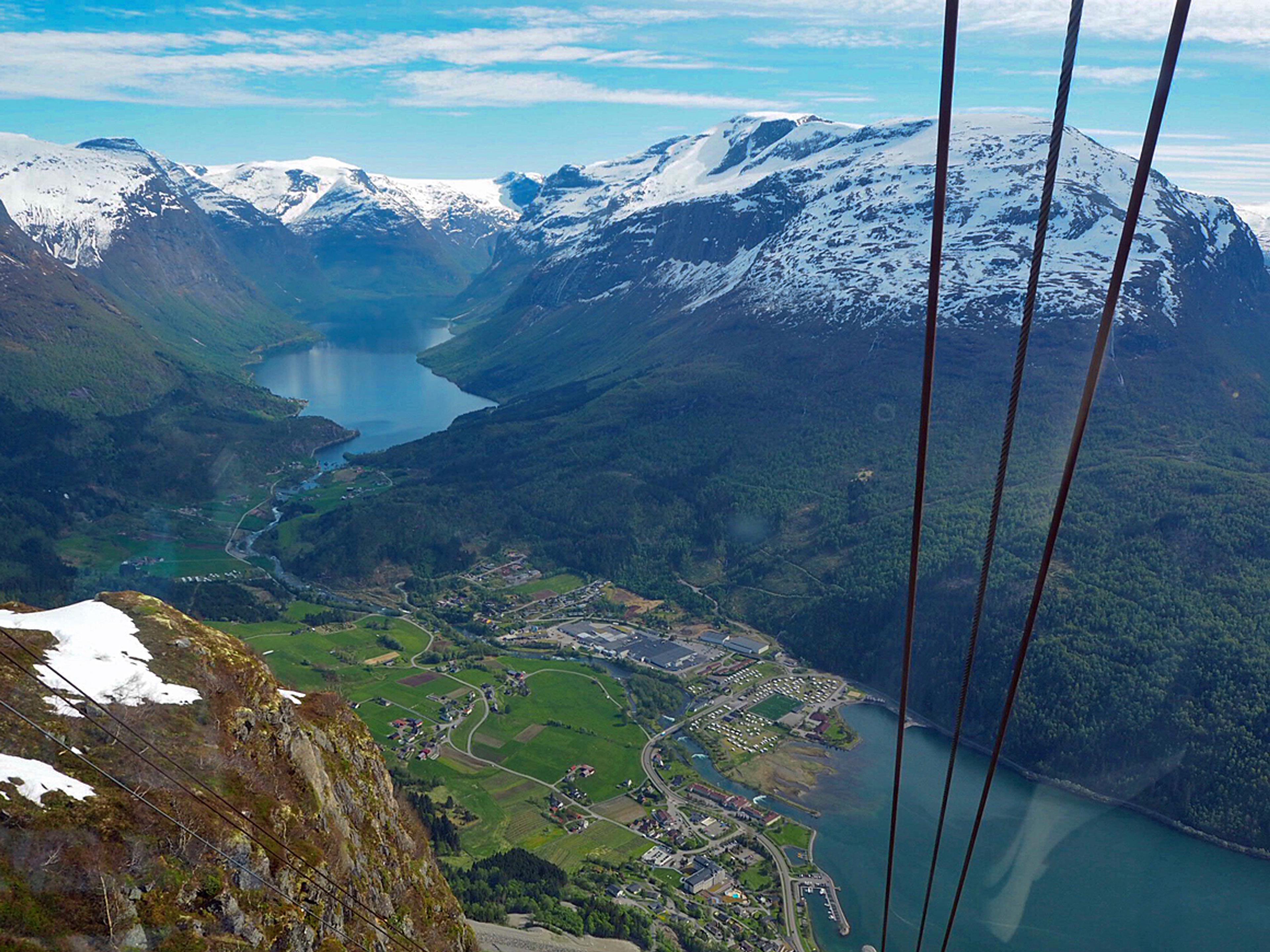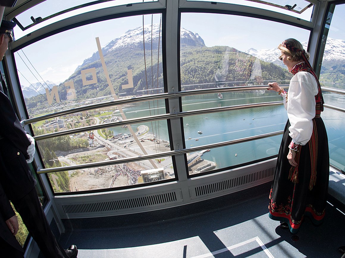 Hennar Majestet Dronninga opna i dag Loen Skylift i Nordfjord. Gondolbanen skal løfte turistar frå fjorden til toppen av det 1011 meter høge fjellet Hoven på fem minutt.