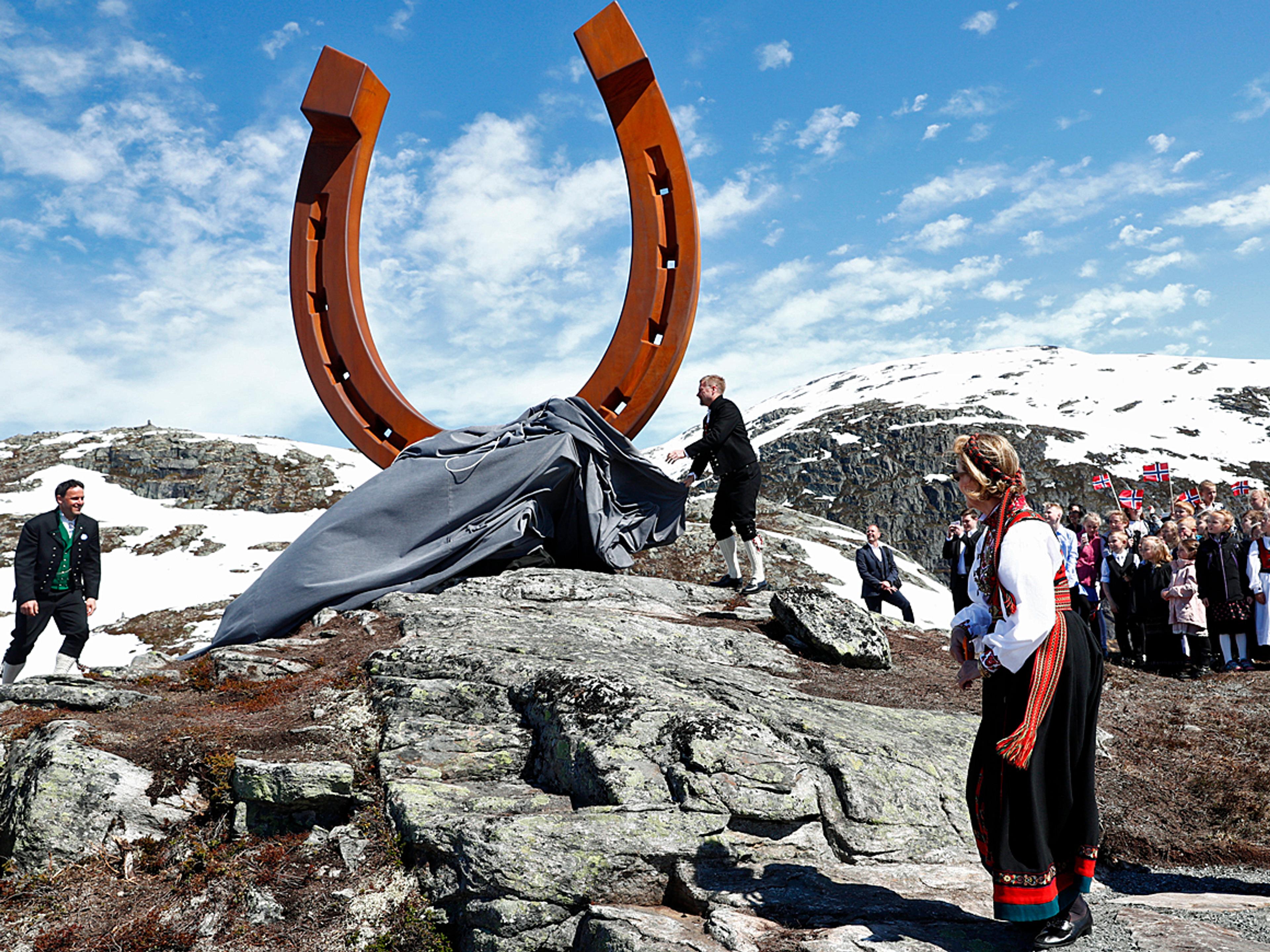 På toppen av fjellet avduka Dronninga ein fem meter høg hestesko. Fjellet Hoven har fått namnet sitt etter segna om Sleipner, hesten til Odin. Det vart sagt at Sleipner slo ein av hovane sine inn i fjellet i Loen og skapte det karakteristiske holet.
