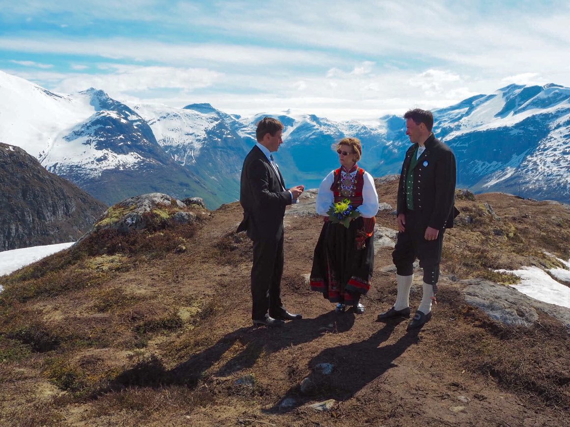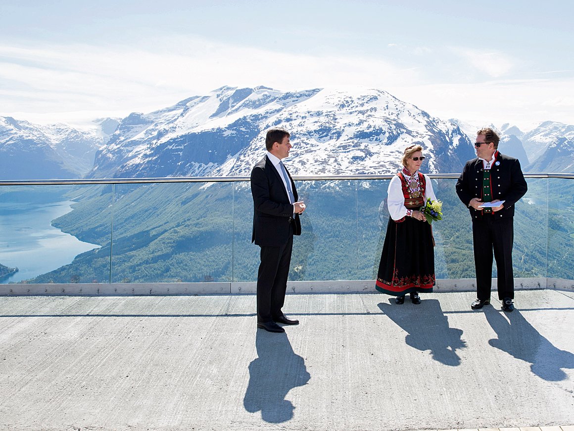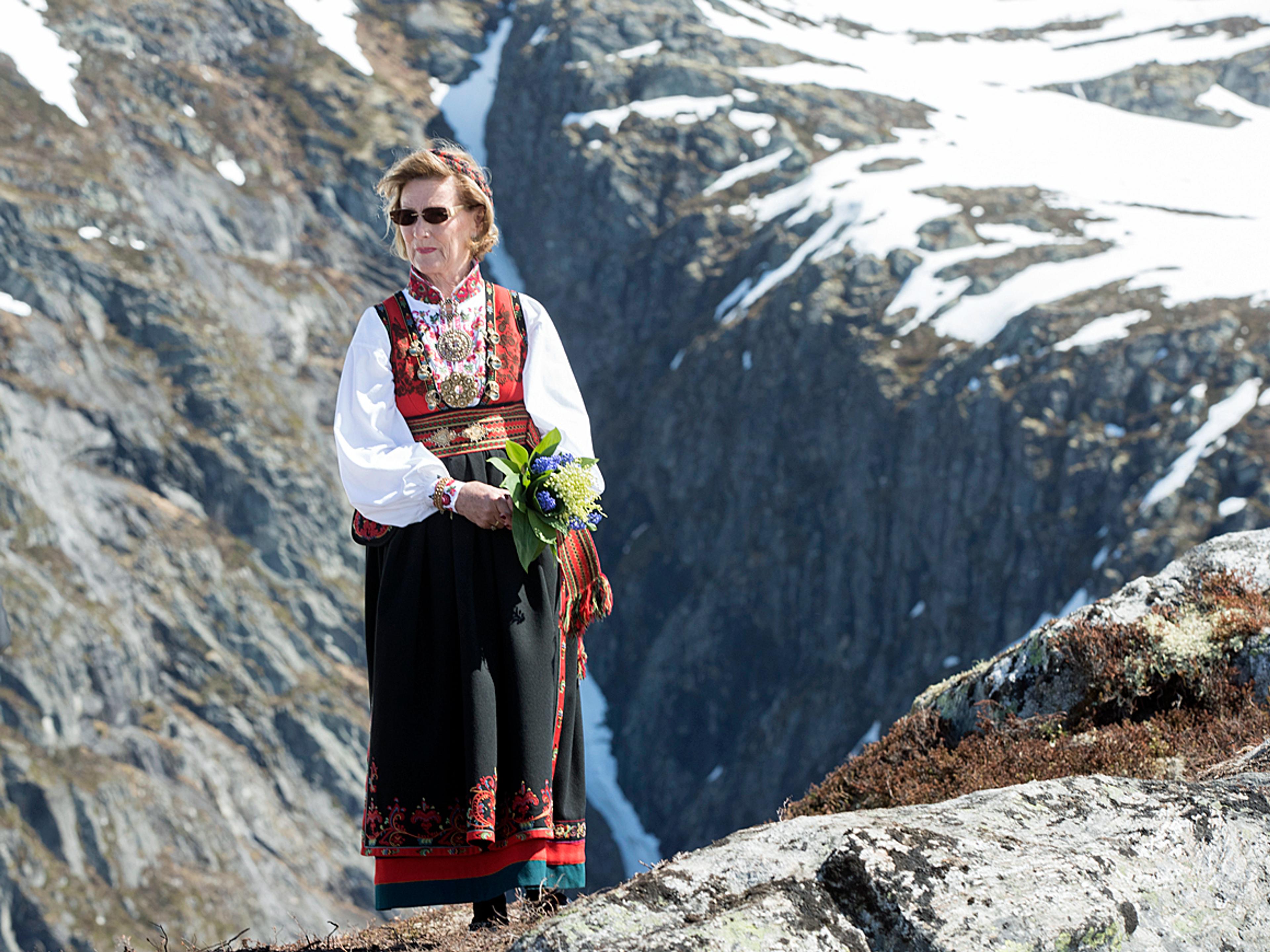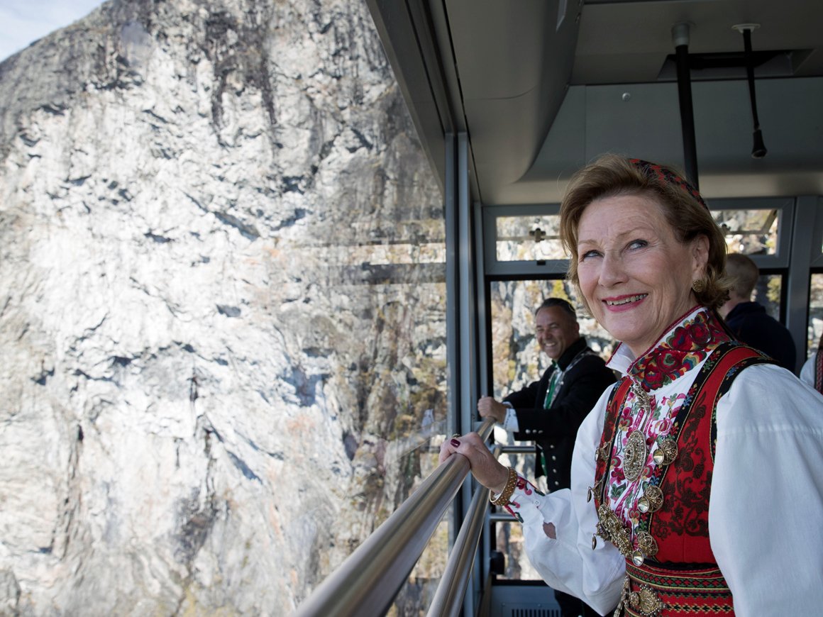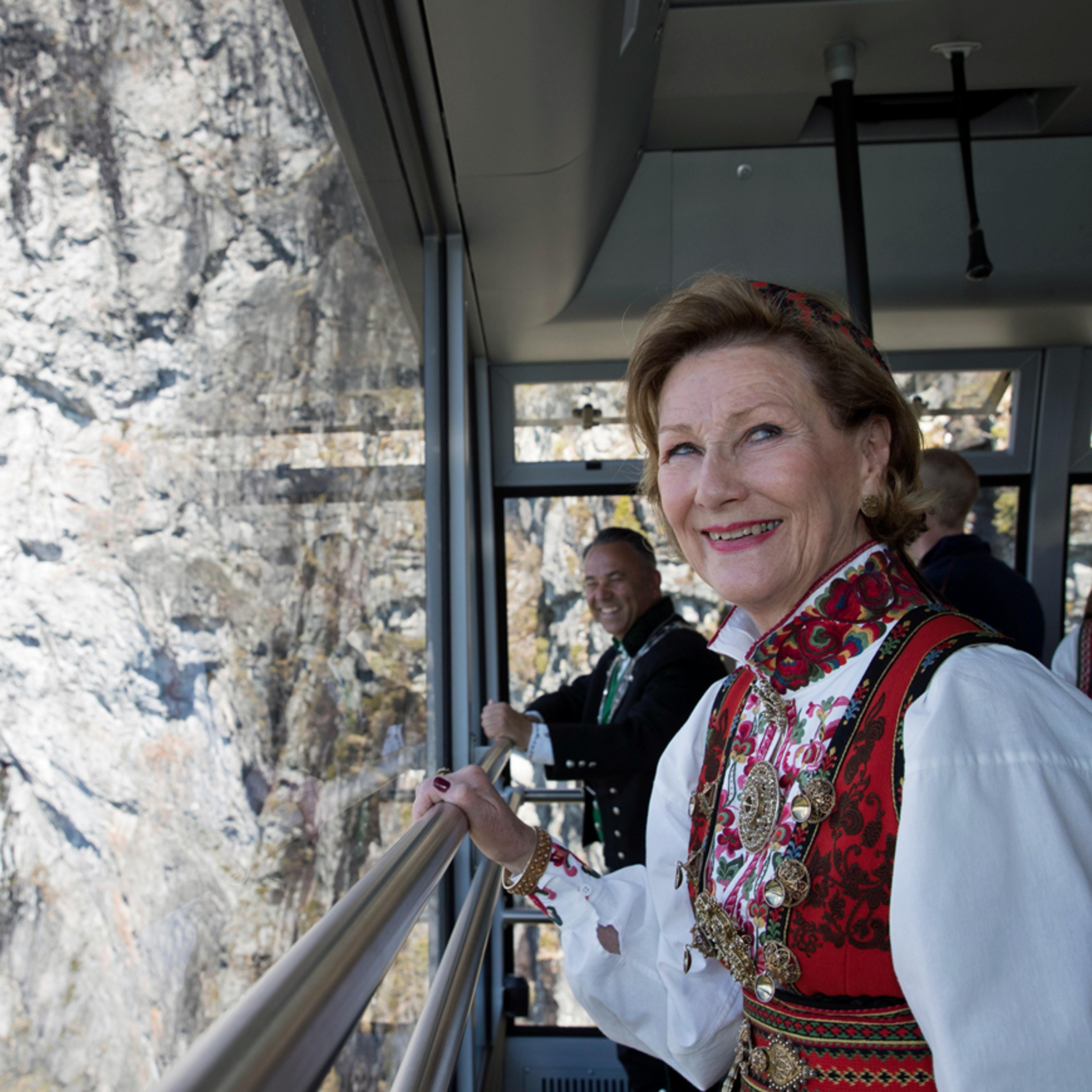 – Heilt fantastisk. Det er ei utruleg flott oppleving. Eg er veldig glad for at eg har fått lov til å oppleve dette. Eg har litt høgdeskrekk, eg da, men eg klarer meg heilt fint, sa Dronning Sonja etter den spektakulære reisa med utsikt over noko av det vakraste Noreg har å by på – eit dramatisk landskap med bratte lier, frodig natur, blank fjord og kvitkledde fjell.