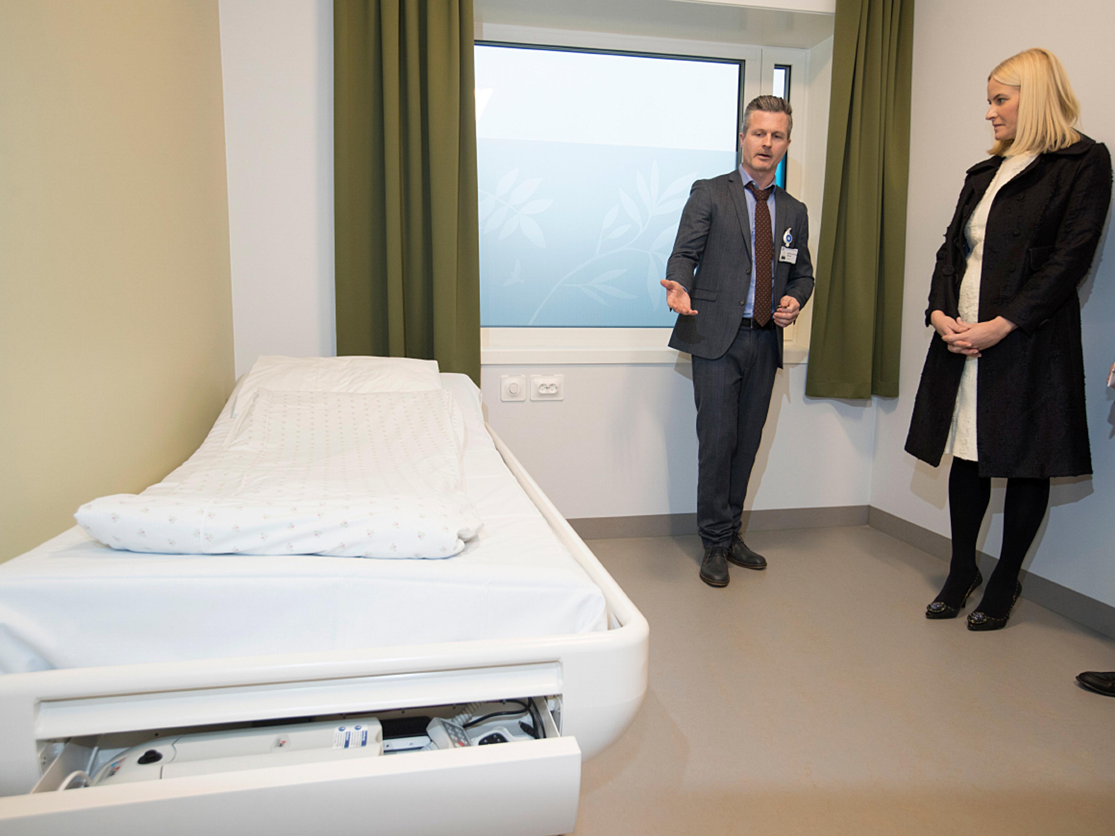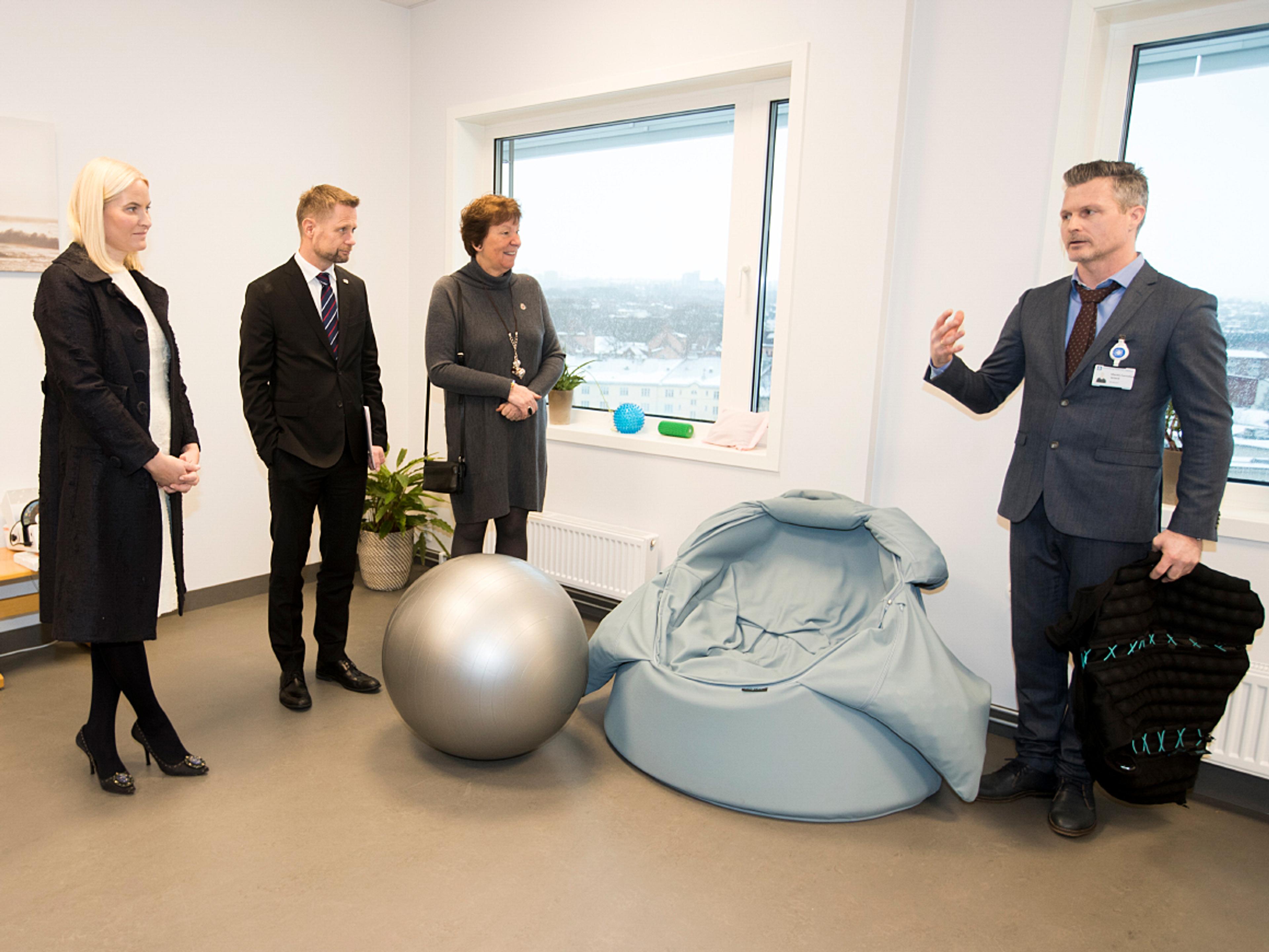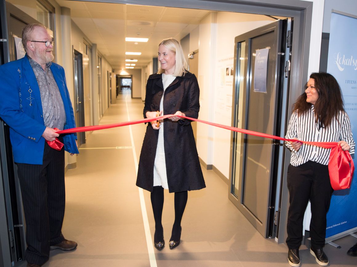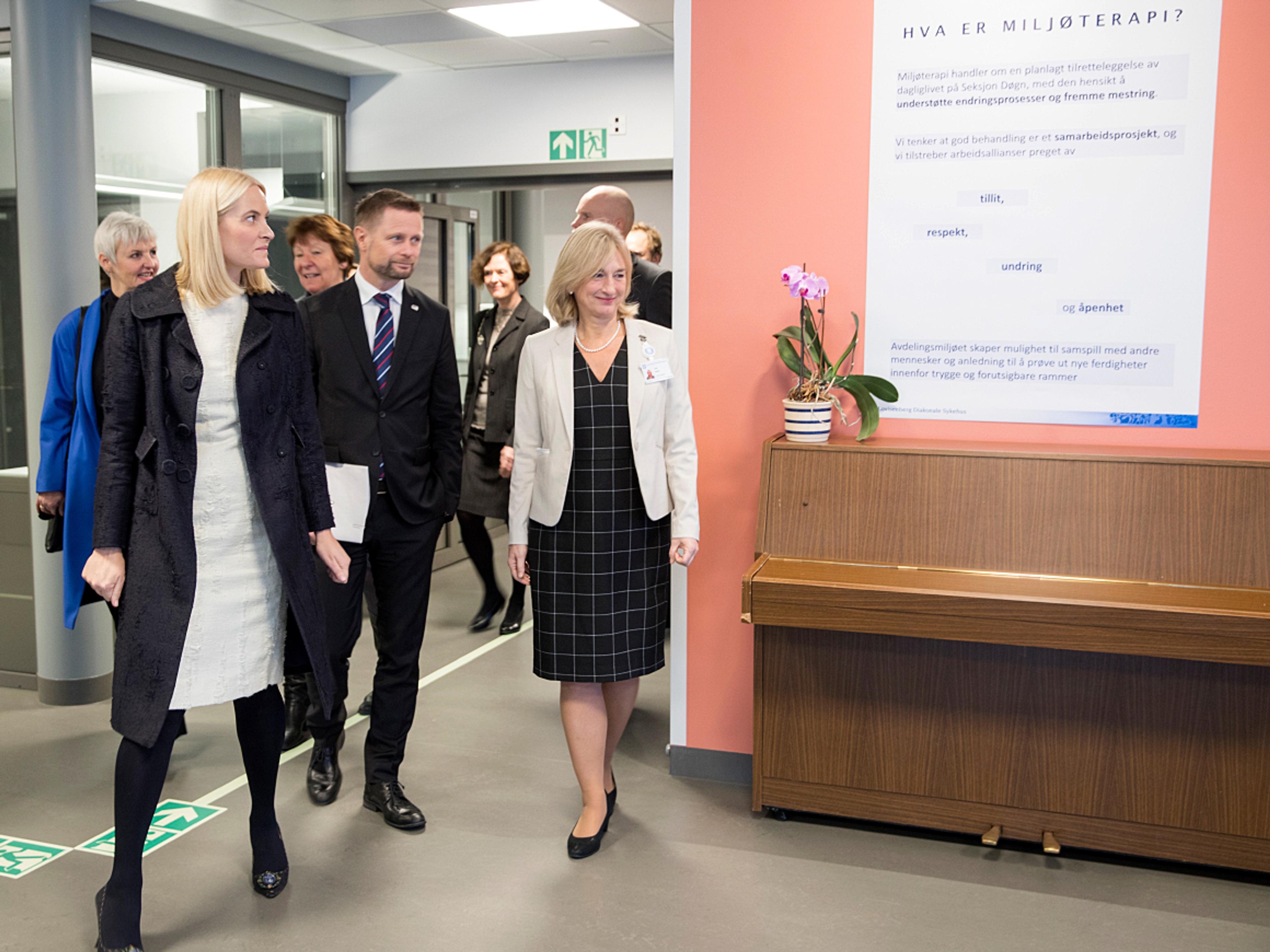 Helseminister Bent Høye stod for opningstalen i dag, mens Den Høgvørde Kronprinsesse Mette-Marit klipte den symbolske snora. Deretter fekk dei to ei omvising i dei nye lokala og eit innblikk i korleis sjukehuset tenkjer heilskapleg og jobbar med å redusere bruken av tvang.