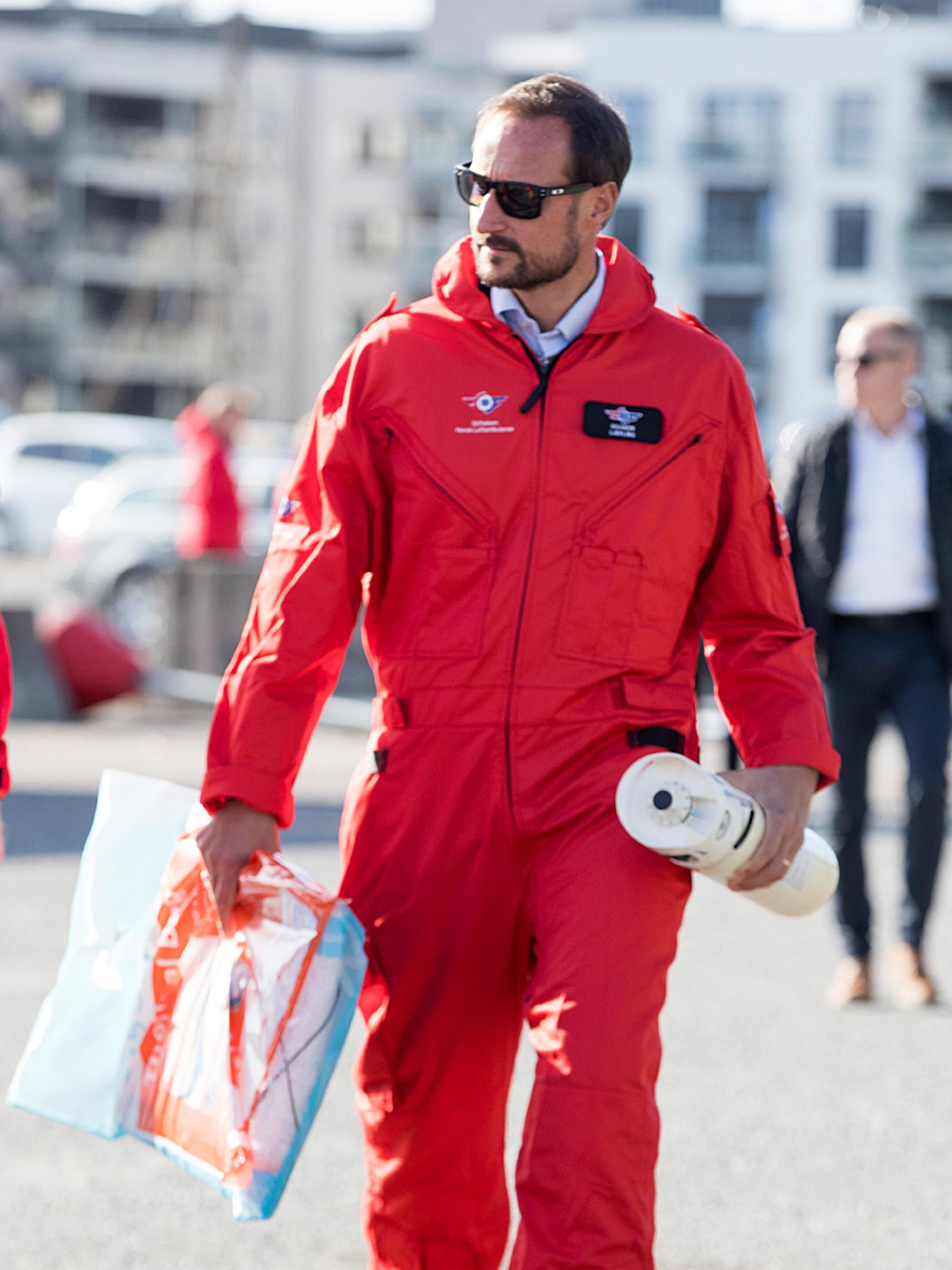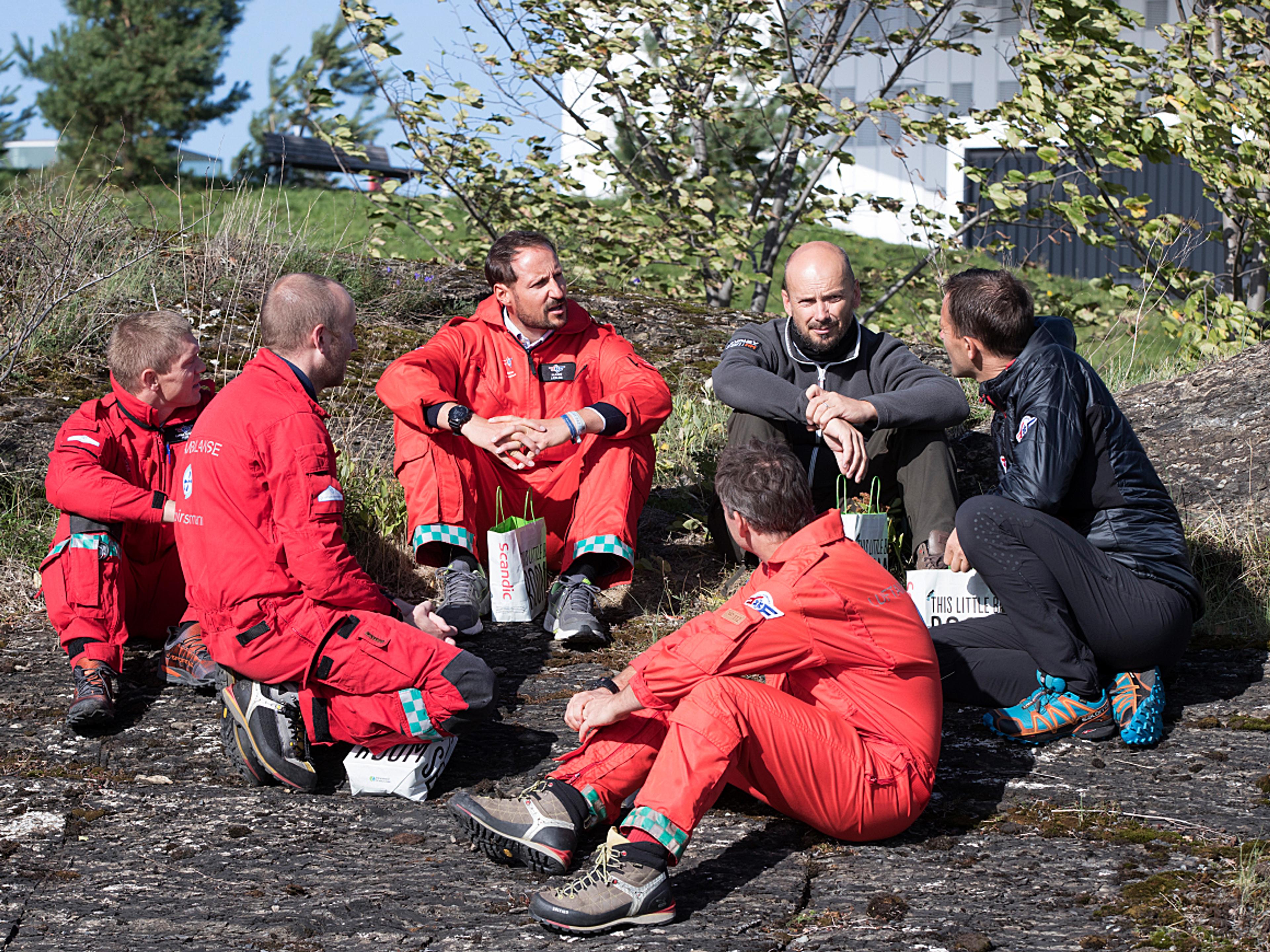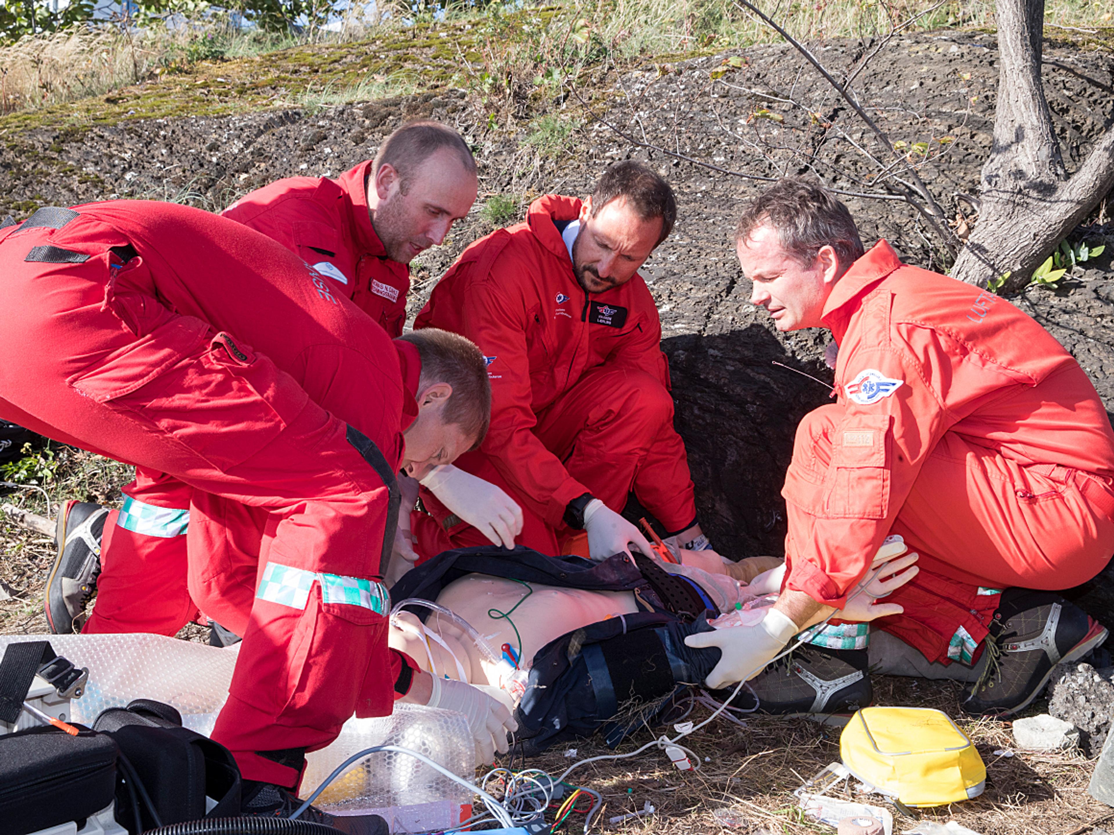 Kronprinsen fekk på seg kjeledress frå Norsk Luftambulanse og helsa på mannskapet som skulle delta i øvinga. Lukas Olsen var pilot, Vegard Rosenlund var lege, og Thomas Dahle var redningsmann. Kronprins Haakon fekk rolla som lærling i mannskapet.