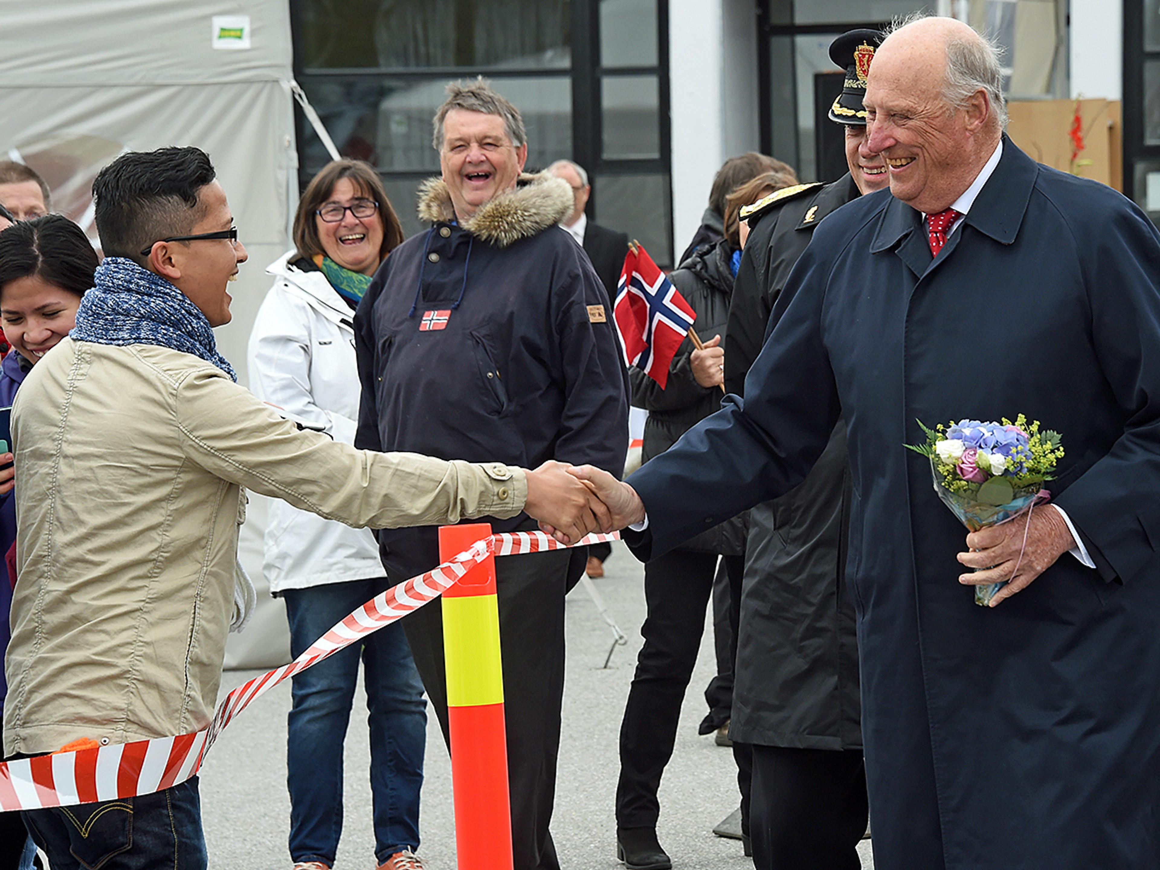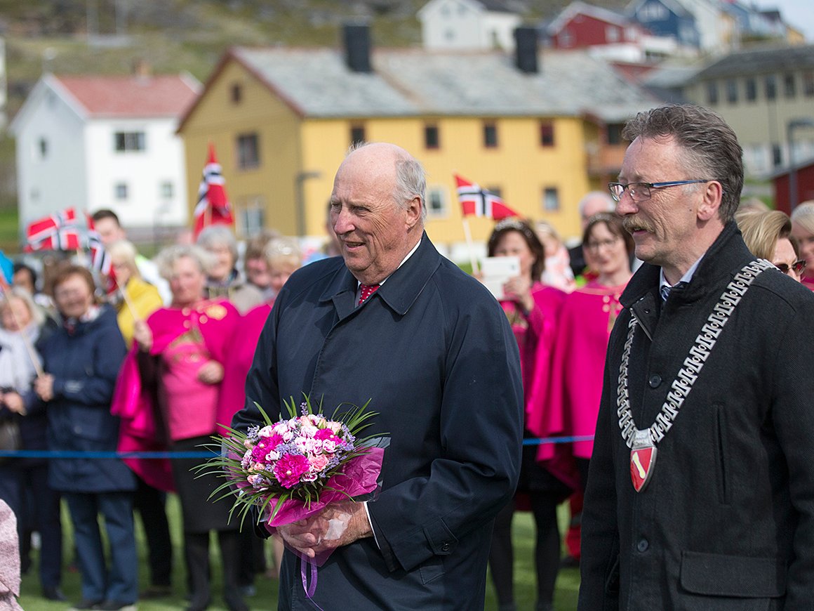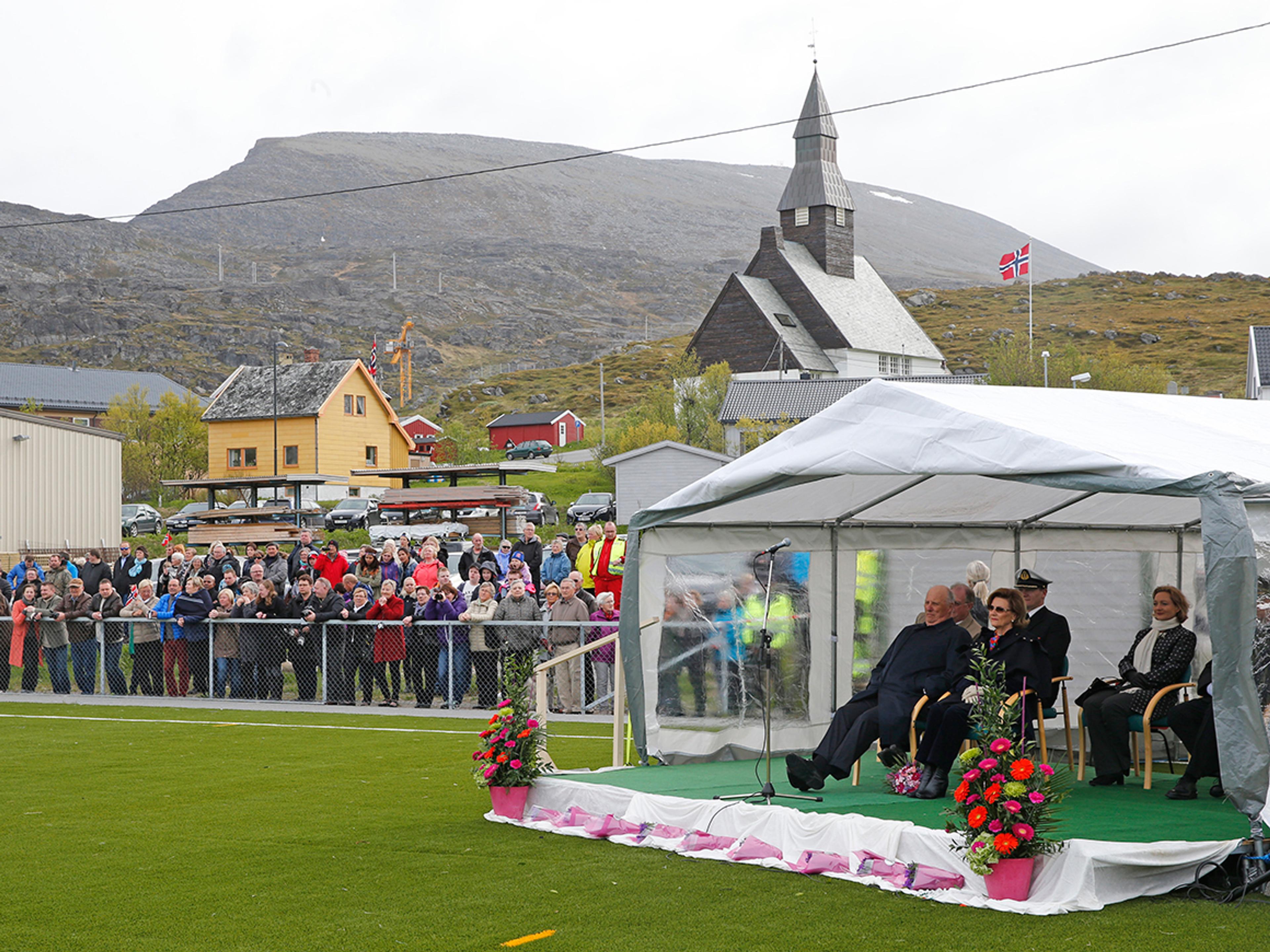 Havøysund i Måsøy kommune er anløpssted for Hurtigruta, men i dag var det Kongeskipet som la til utenfor fiskeværet. Kongen og Dronningen gikk i land på kaia i ettermiddag og videre til fotballbanen, der måsøyinger var møtt fram for å møte Kongeparet.