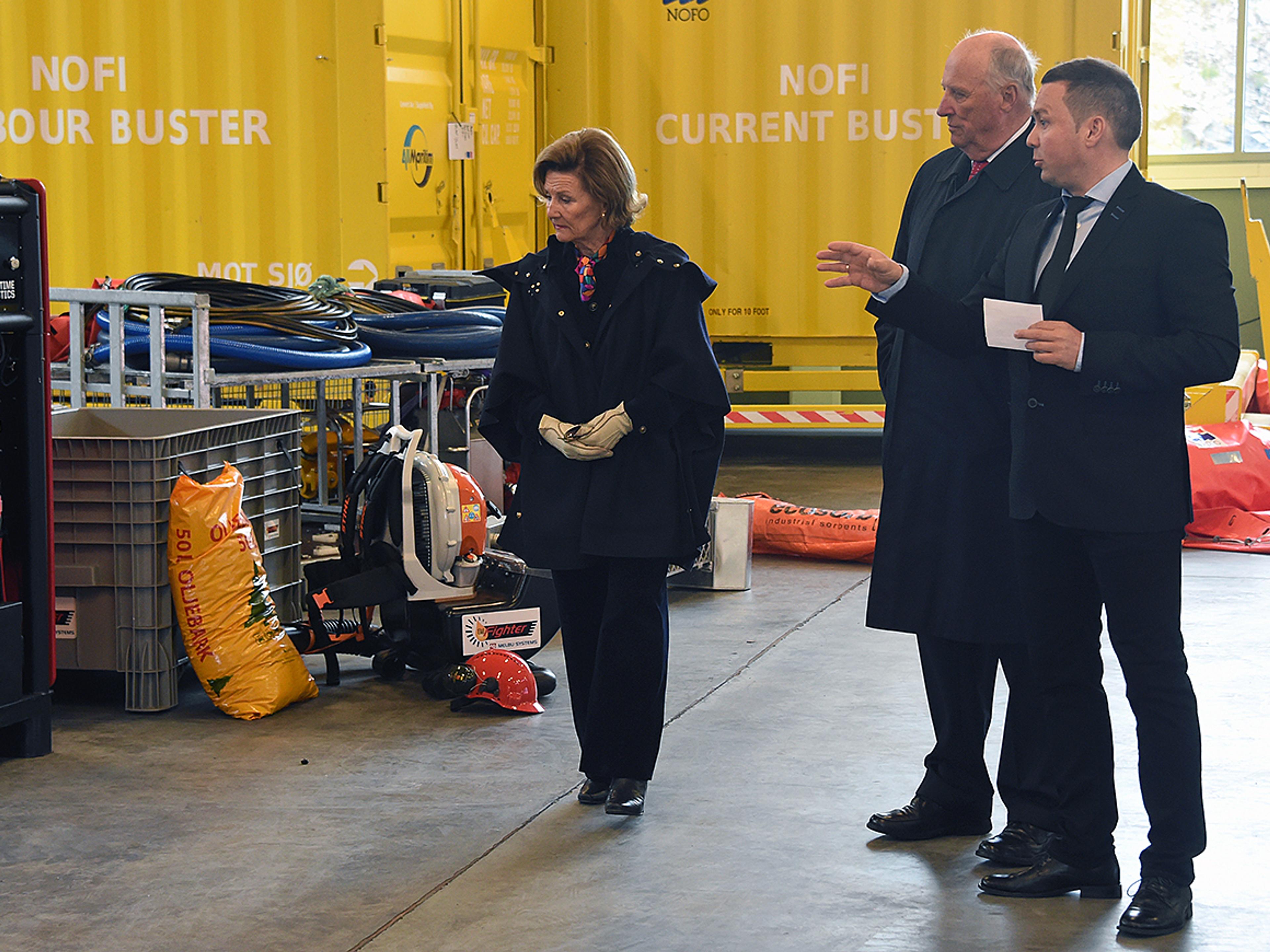 Fra fotballbanen gikk turen videre til oljeverndepotet, hvor Hilmar Gerhardsen, leder for Norsk Oljevernforening for Operatørselskap, ga Kongen og Dronningen en orientering om den viktige oljevernberedskapen i området.