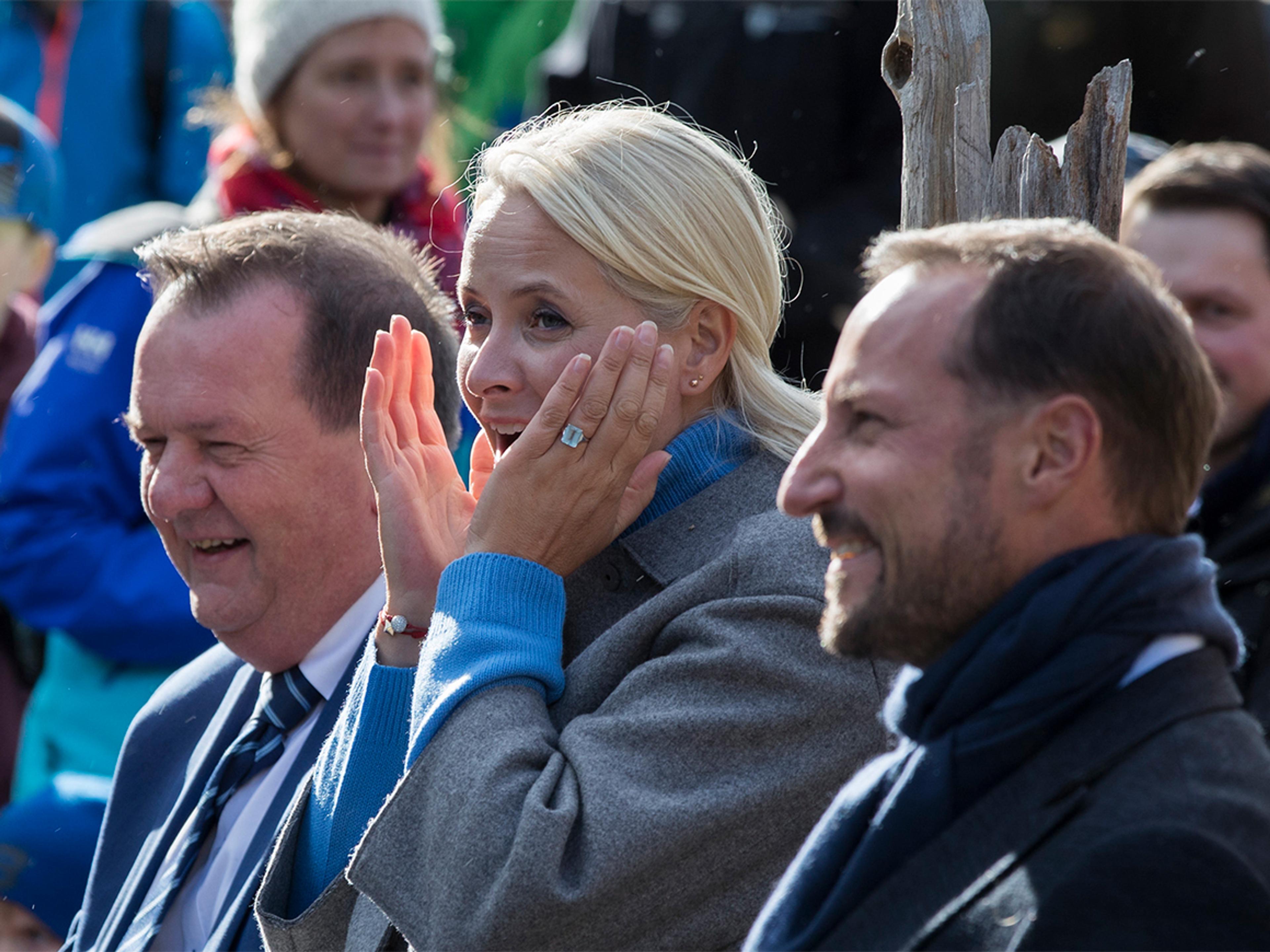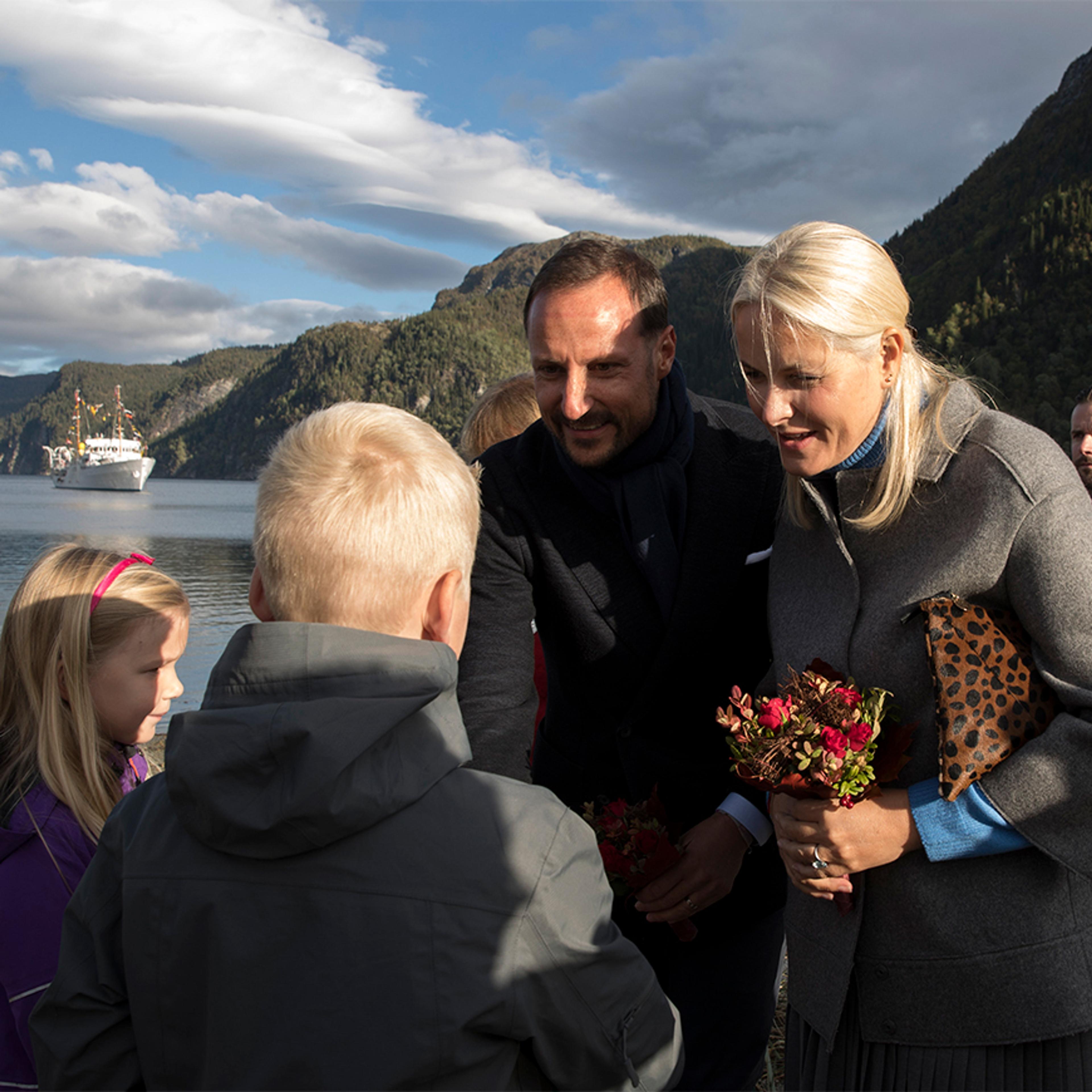 Ordfører Hege Nordheim-Viken ønsket velkommen, og Kronprinsen og Kronprinsessen tok seg også god tid til å snakke med blomsterbarna Karoline og Jakob.