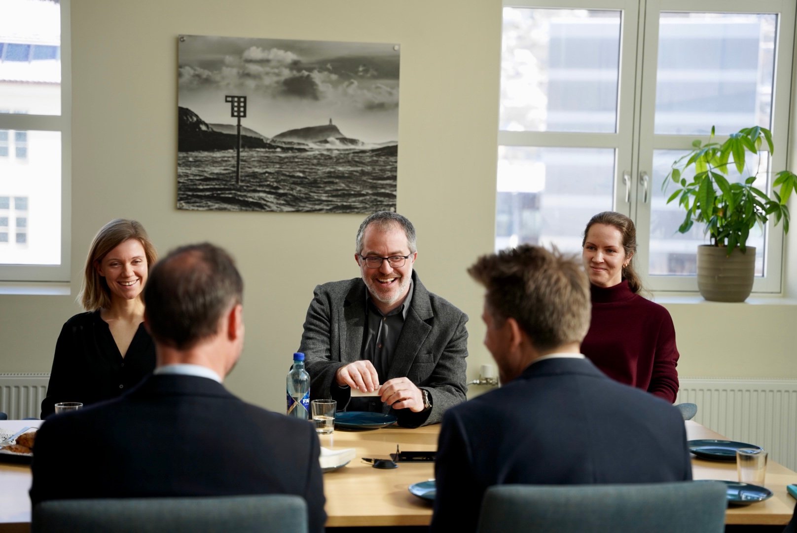 Tidlegare på dagen besøkte Kronprinsen Bjerknessenteret for klimaforsking. Bjerknessenteret er eit samarbeid mellom Universitetet i Bergen, NORCE, Nansensenteret og Havforskingsinstituttet der det blir forska på klimasystemet på jorda, i notid, fortid og framtid. Direktør Kikki Kleiven ønskte velkommen til senteret.