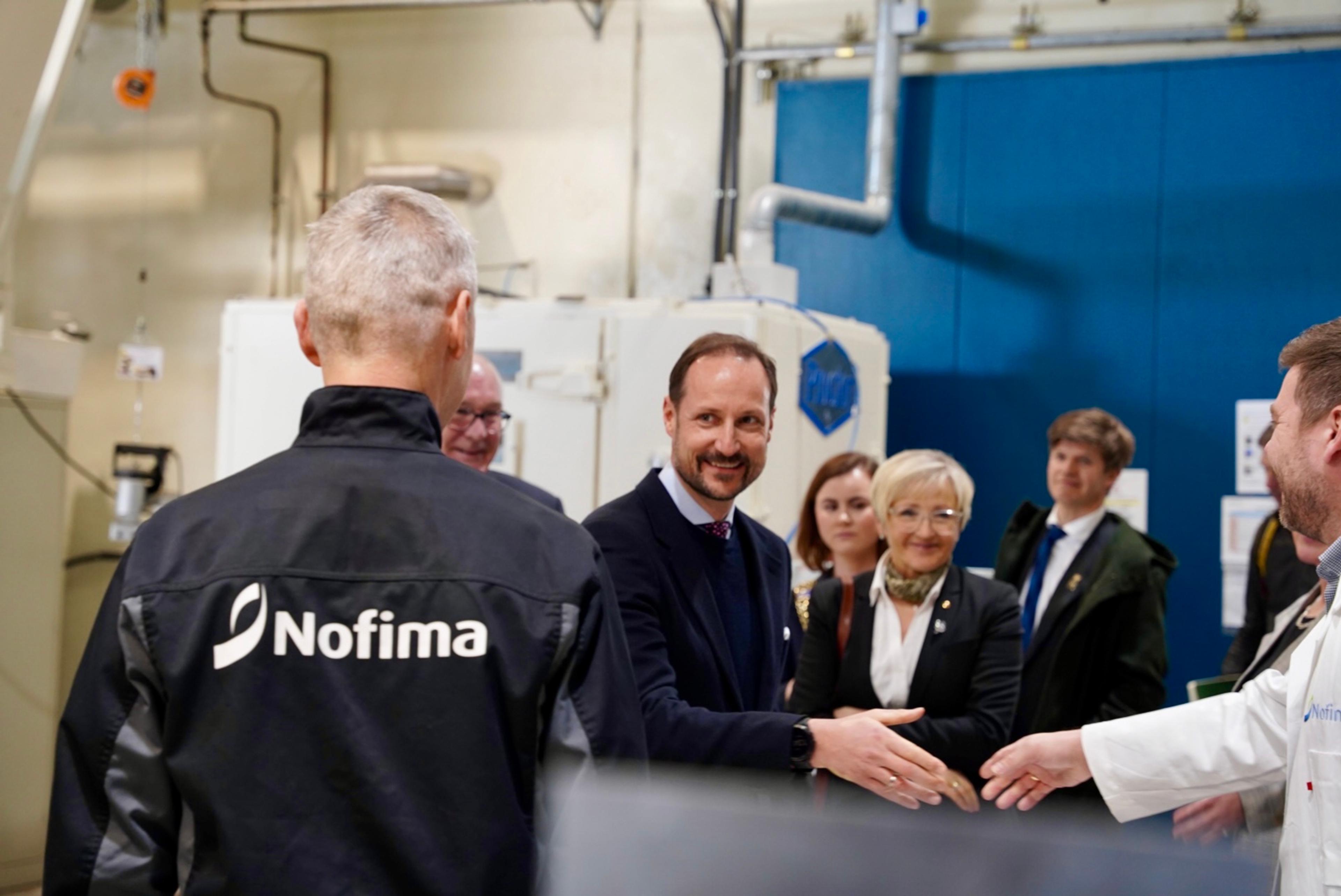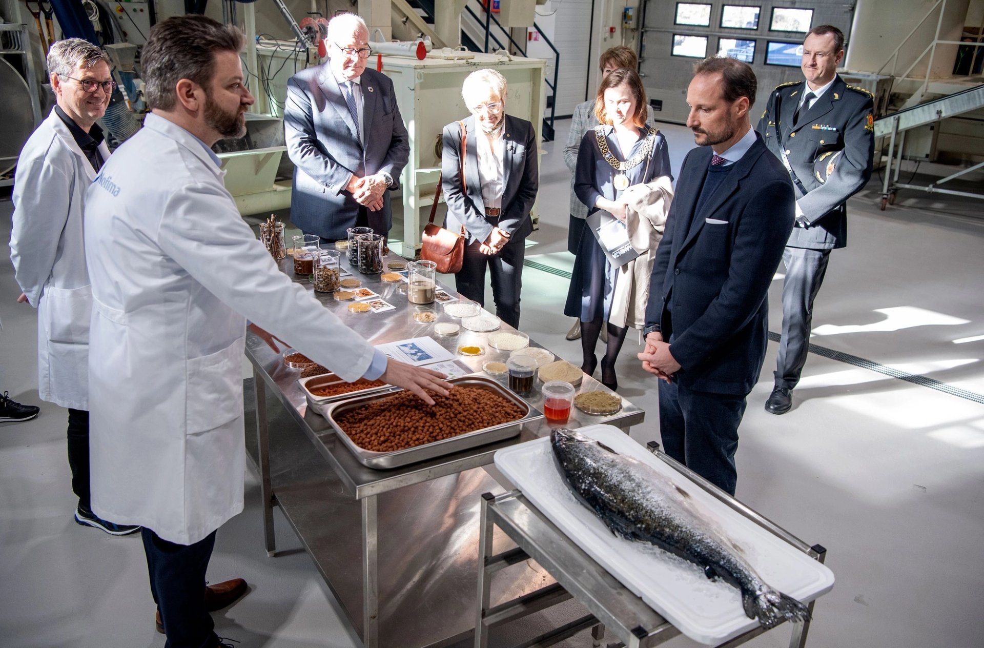 I prosessshallen til Nofima fekk Kronprinsen blant anna sjå kva ein laks har ete frå klekking til slakt, og høyre meir om Noregs ambisjon om berekraftig fôr til fisk og landdyr innan 2030.