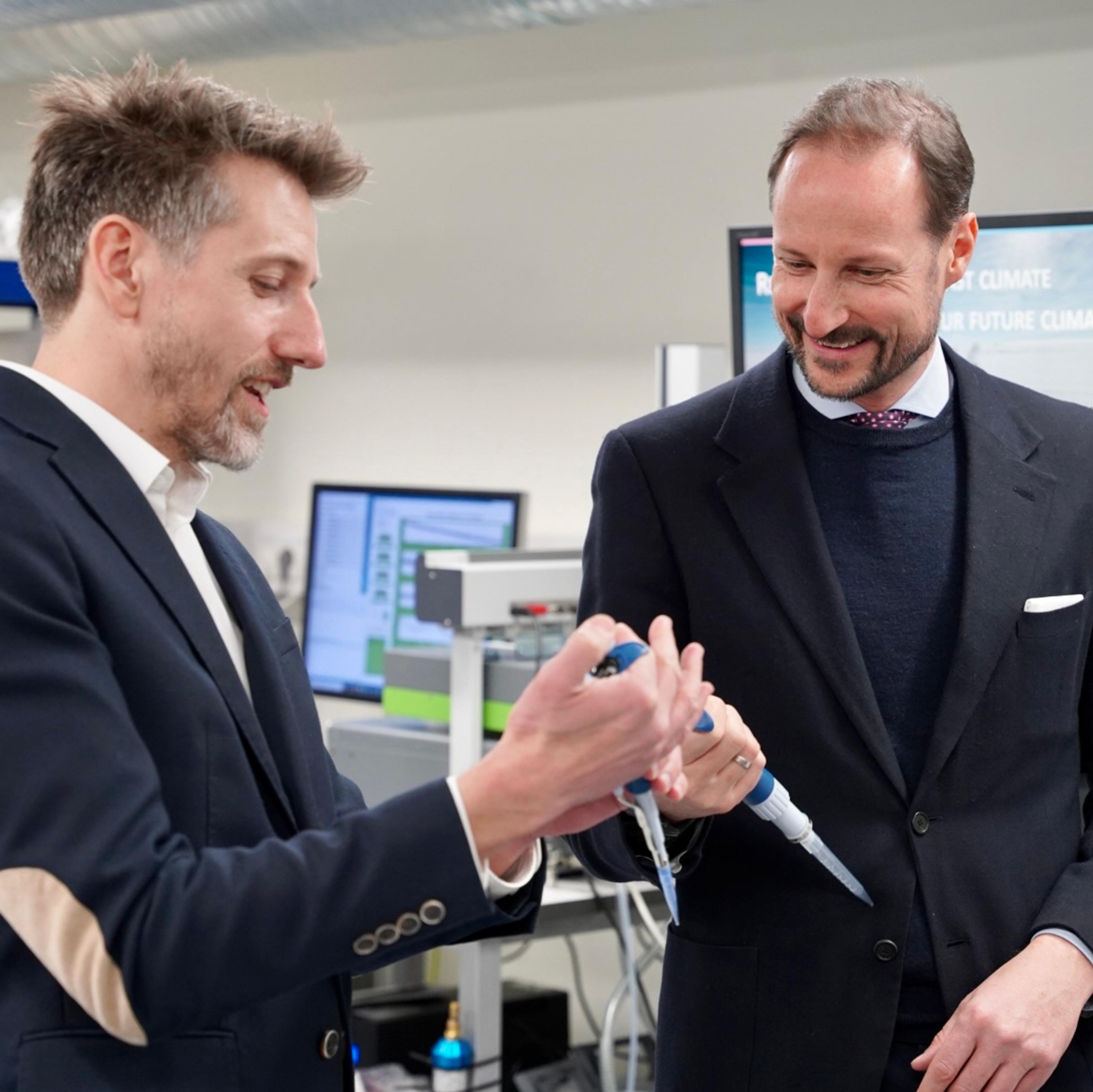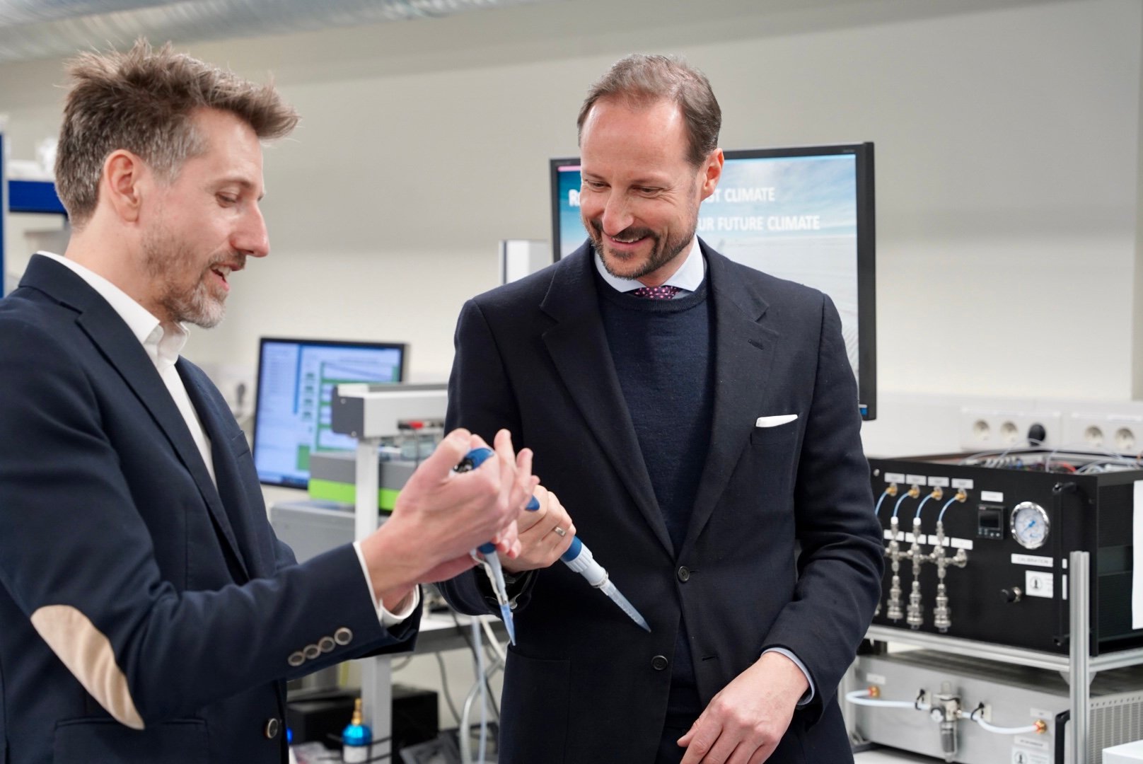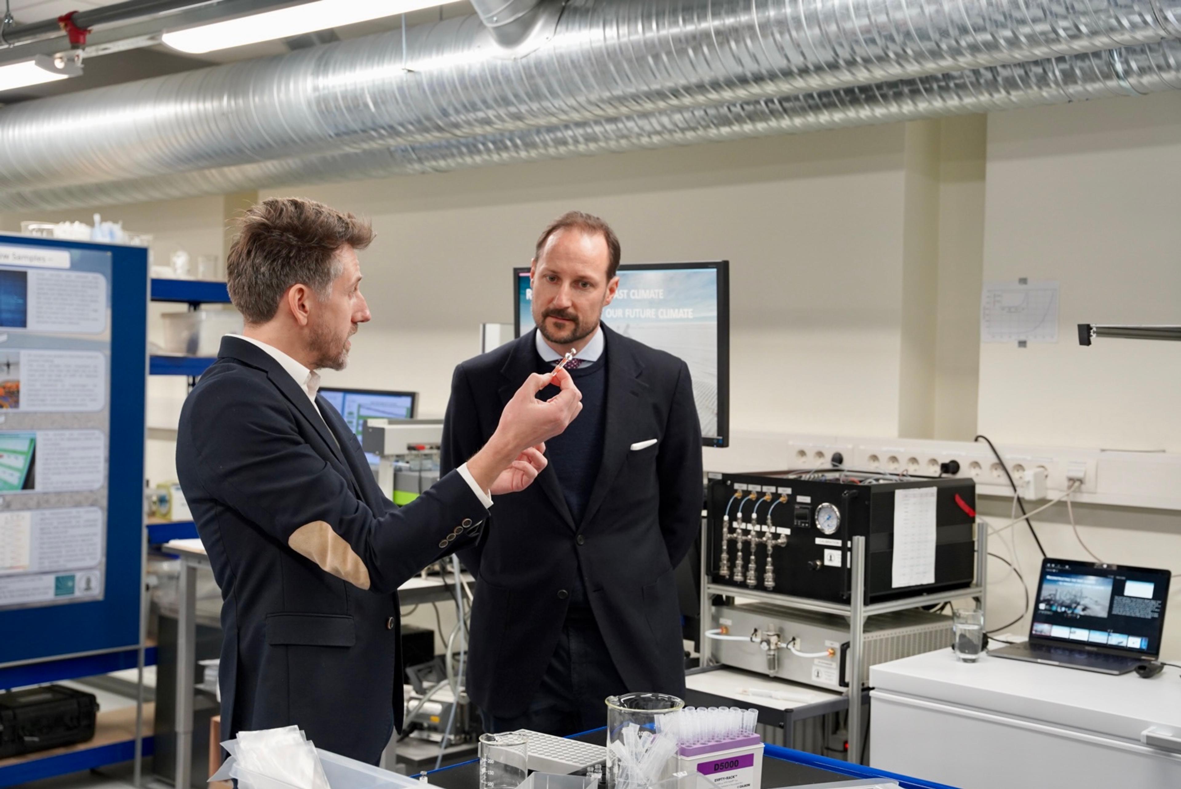 På Bjerknessenteret fekk han vere med til eit avansert isotoplaboratorium der snøprøvene Kronprinsen var med på å hente inn under turen over grøndlandsisen i fjor, blir analyserte. Hans Christian Steen-Larsen viste Kronprinsen prosessen med å analysere snøprøvene henta ut under grønlandsturen.