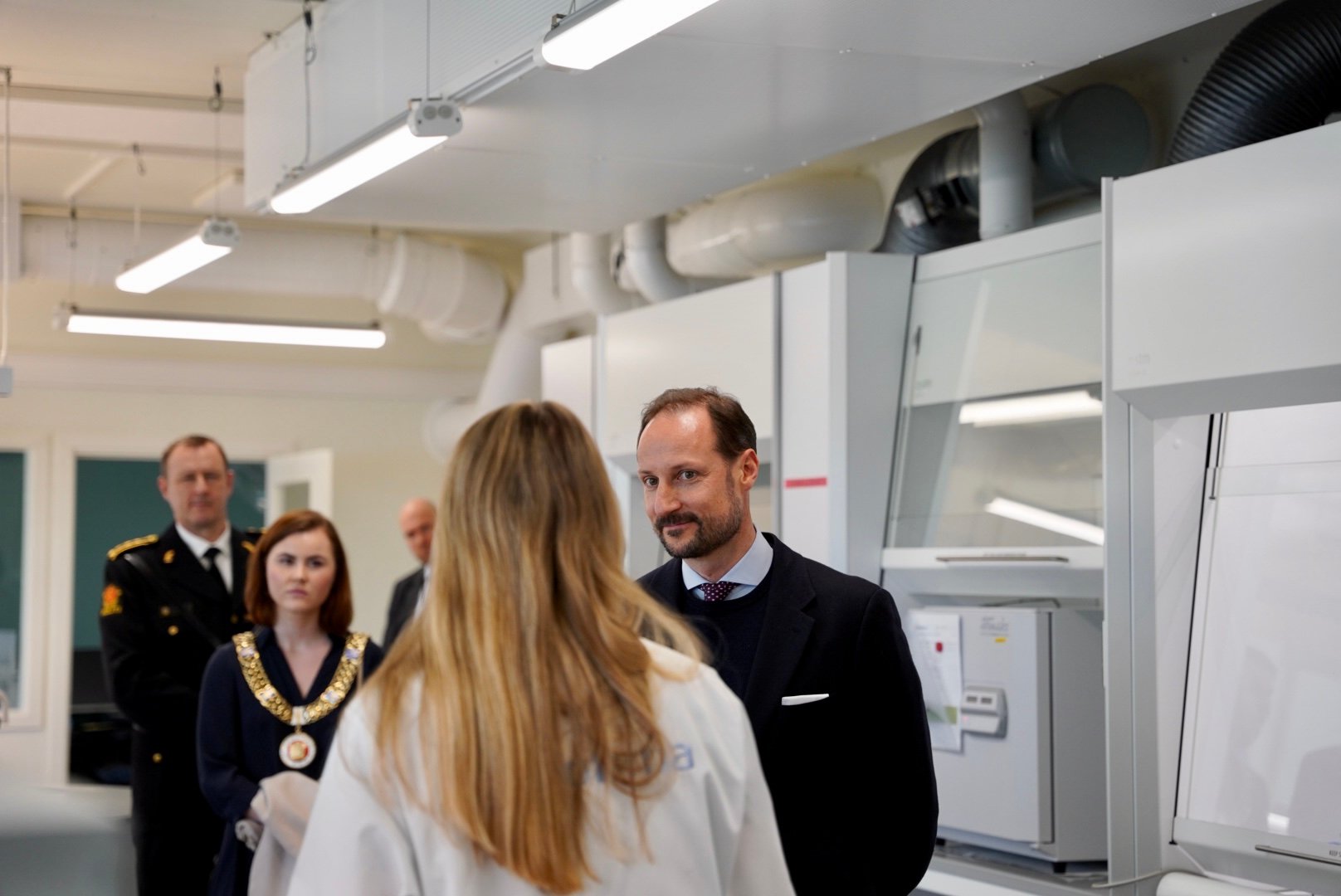 Vidare fekk Kronprinsen sjå korleis eit avansert laboratorium blir brukt for å ta fram nye innovasjonar. Forskarane ved Nofima fortalde om korleis dei forskar på nye berekraftige råvarer til oppdrettsfôr. Saman med Universitetet i Bergen og NORCE har dei etablert Aquafeed Technology Centre – og i samarbeid med fôrprodusentane utviklar dei no fôr basert på nye råvarer, for eksempel sirissar, soldatlarvefluger og algar.