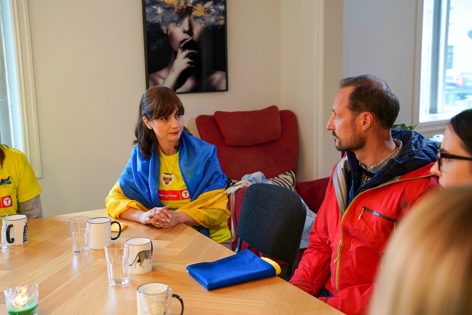 Inne i Villa Nora, hvor Drammen sanitetsforening holder til, snakket Kronprinsen med flere av de frivillige og en gruppe ukrainske flyktninger. Flyktningene møtes i lokalene til sanitetsforeningen to ganger i uken. Her får de blant annet drive med håndarbeid, knytter sosialt nettverk og deler erfaringer med andre i tilsvarende situasjon.