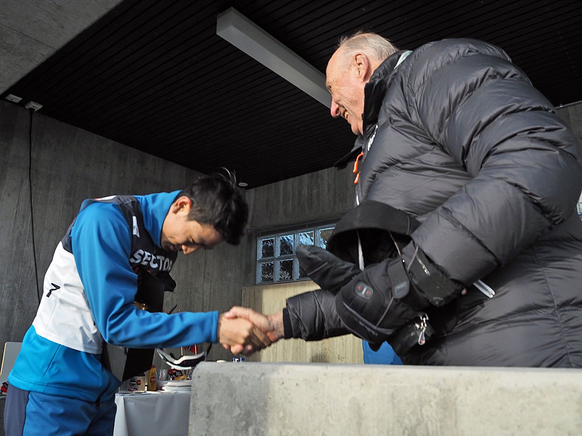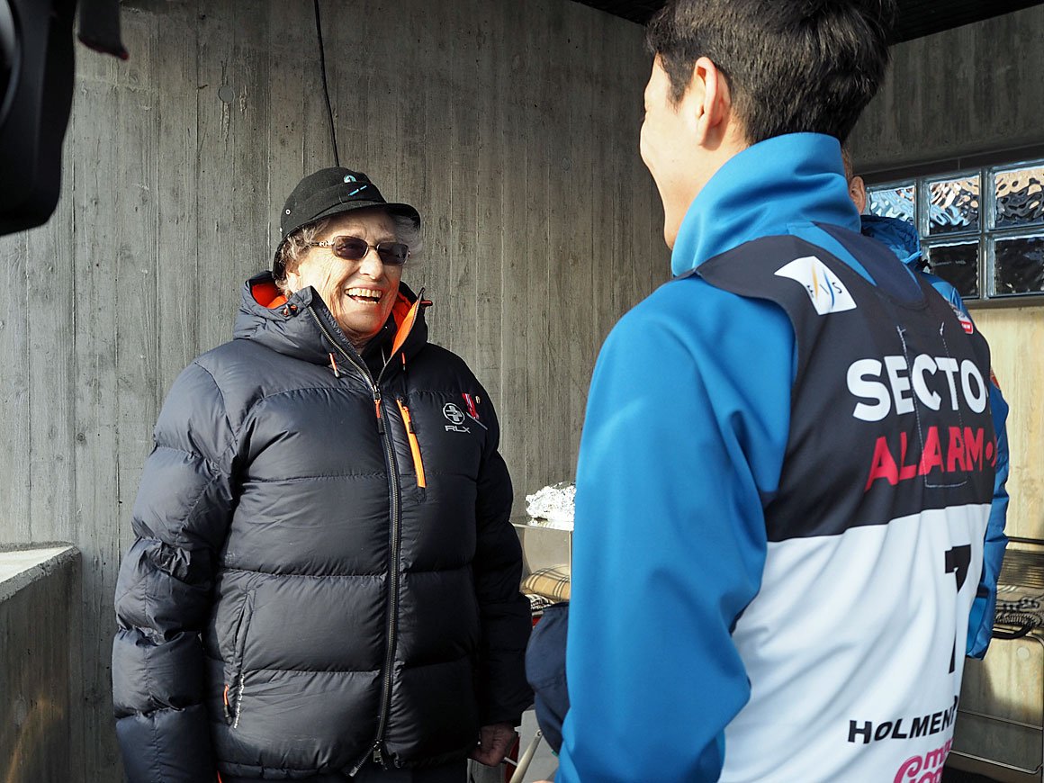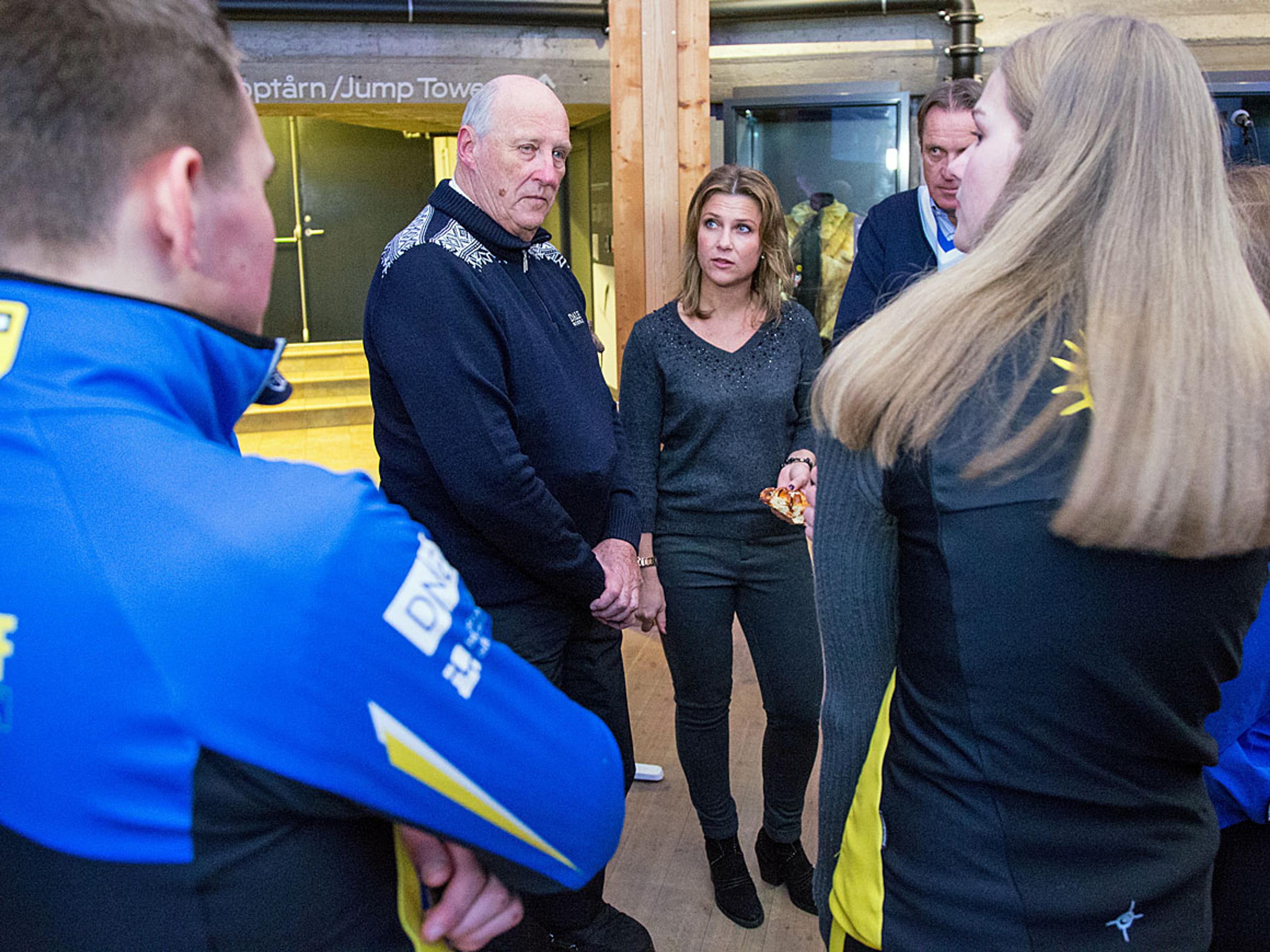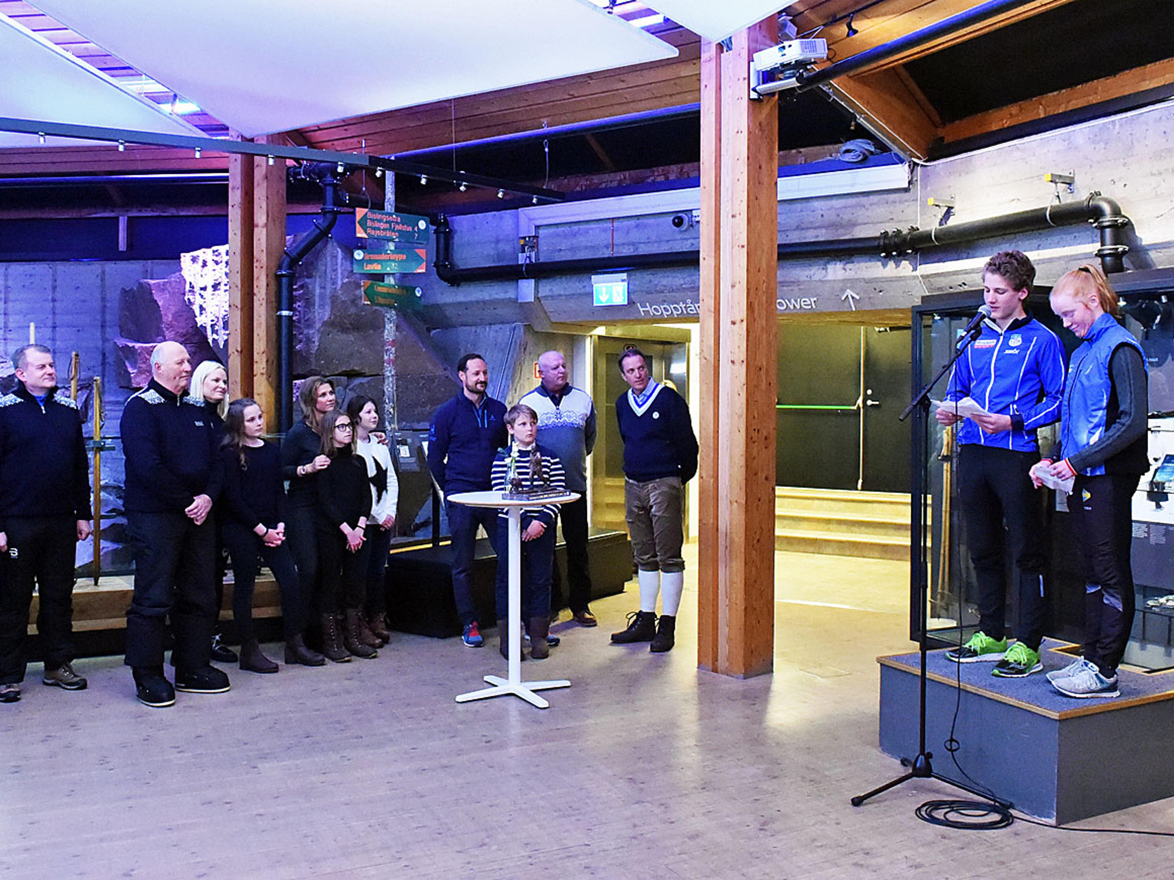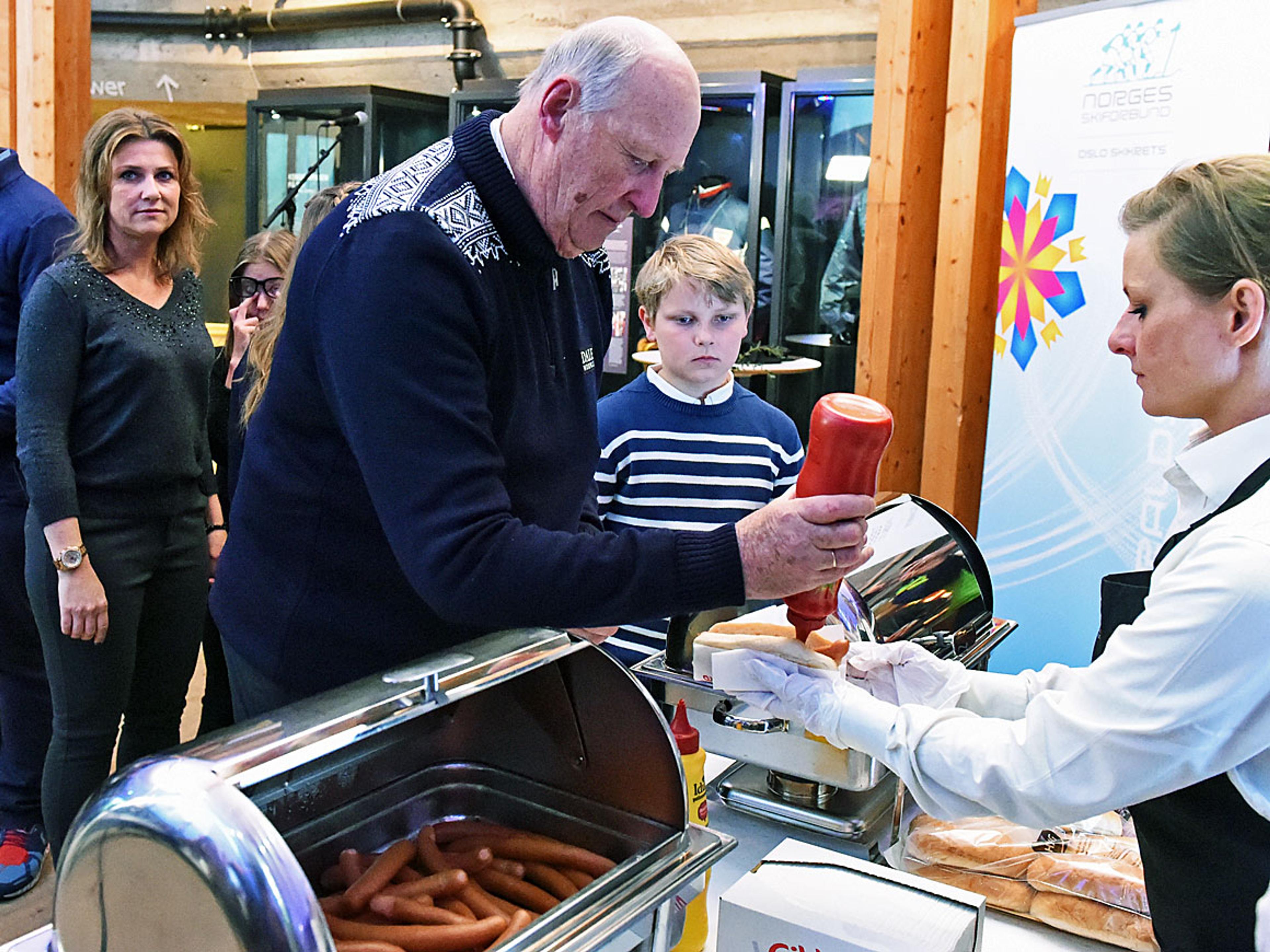 Før det vart servert pølser og brød, brus og kanelbollar, var det talar til den skiinteresserte jubilanten. To representantar for skiungdommen talte til Kongen – Lars Young Vik frå Vestre Akers Skiklubb i Oslo og Frida Haugskott frå Buvik Idrettslag i Sør-Trøndelag.
