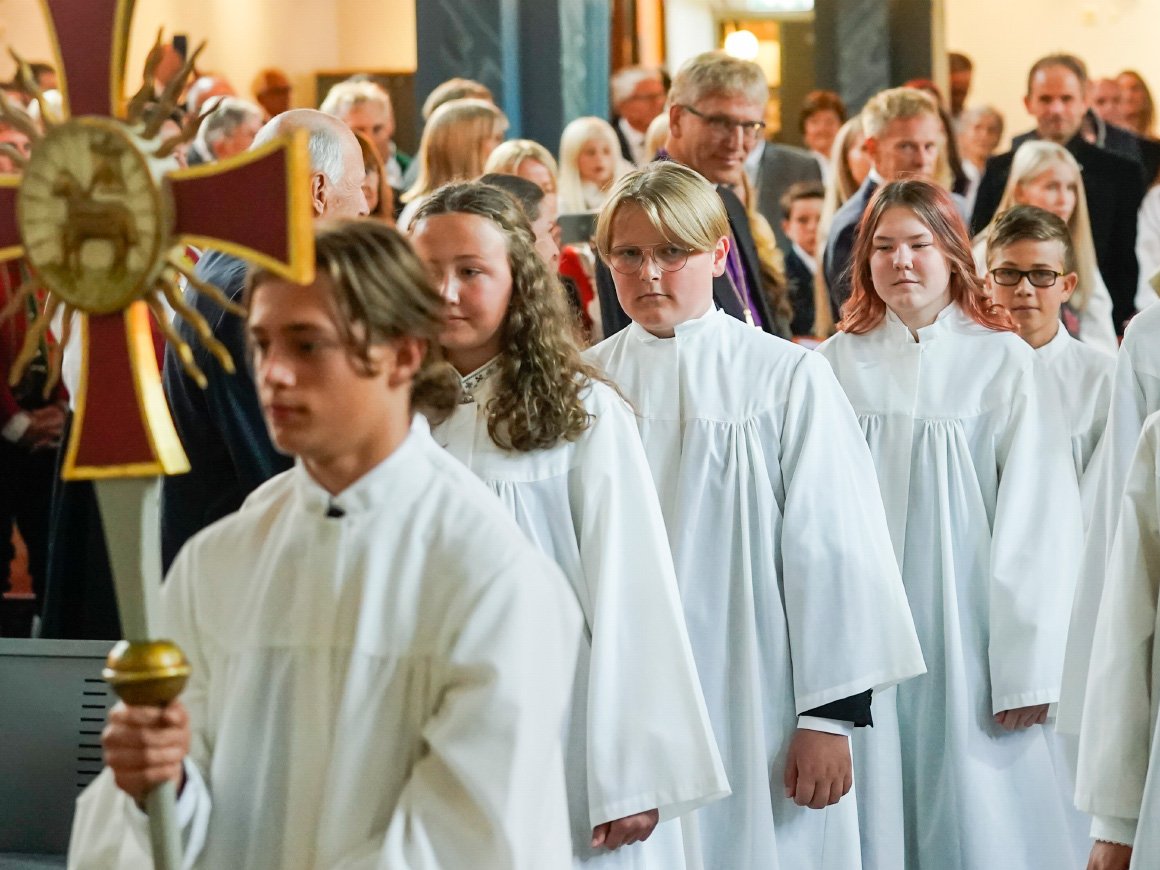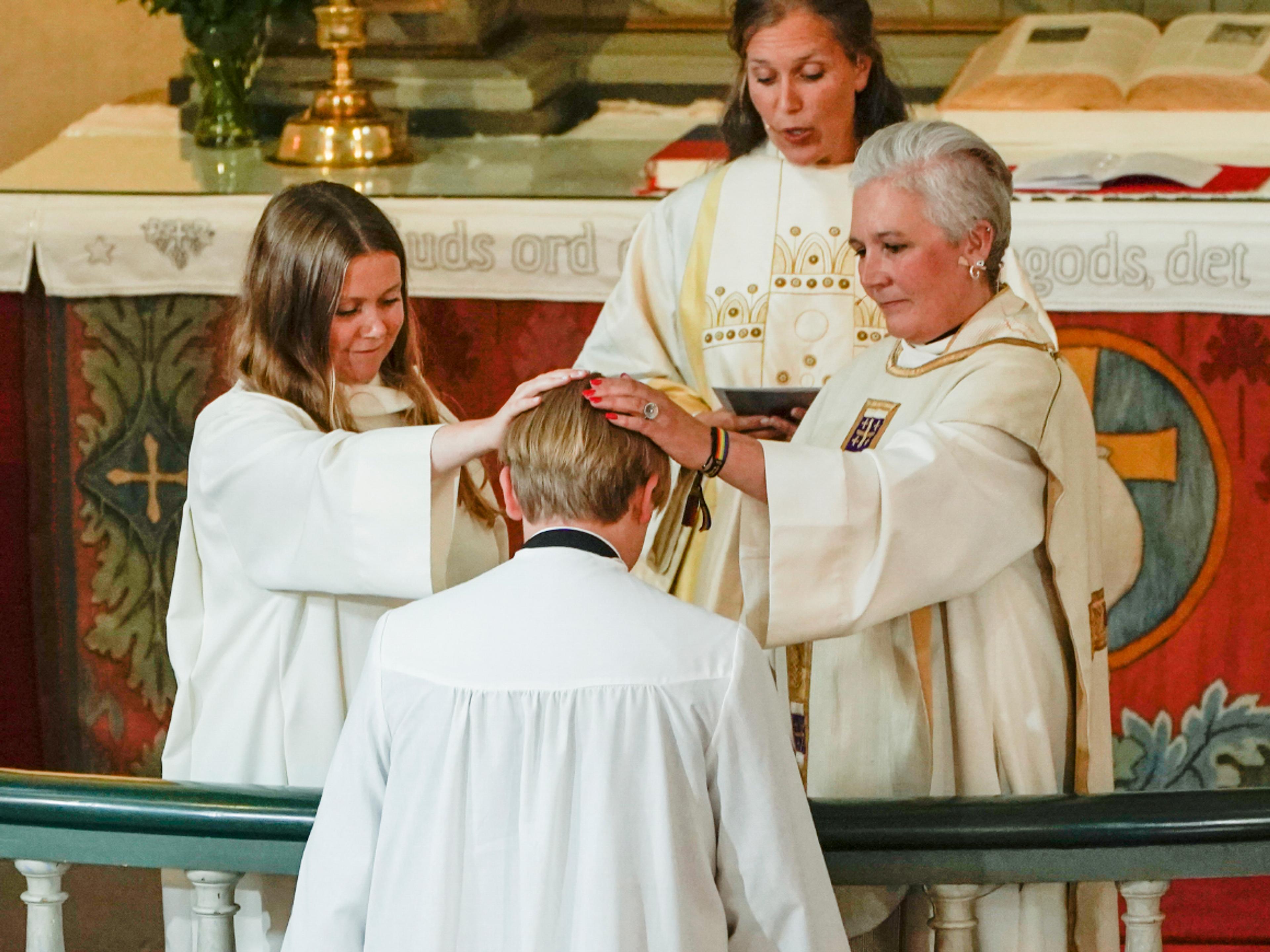 - Kjære konfirmanter. Til den kristne tro er dere døpt. I den kristne tro er dere opplært. Kom nå fram til Herrens alter, så vi kan be for hver enkelt av dere i Jesu navn.
