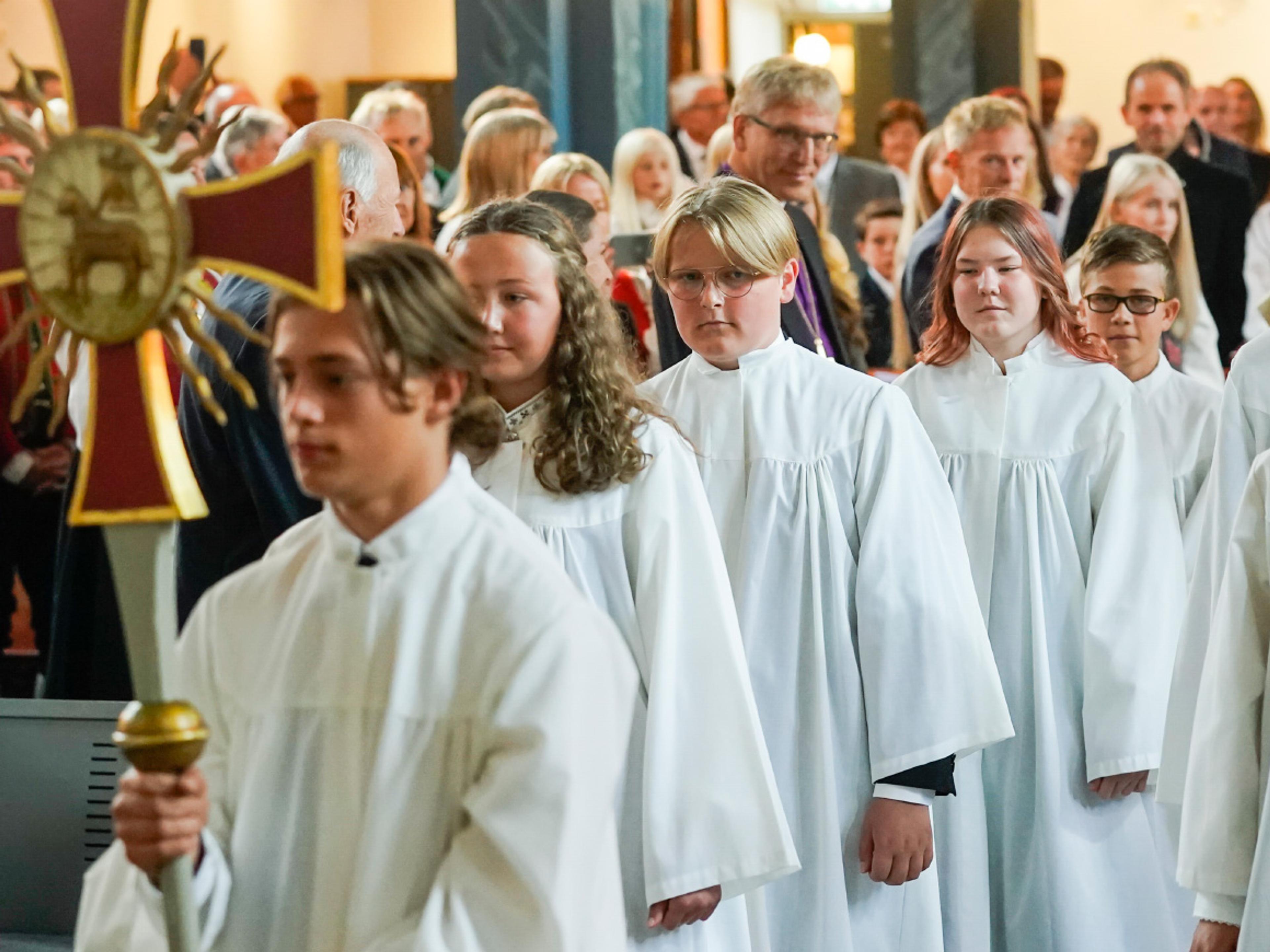 Kirkeklokkene ringte da Kongefamilien tok plass i kirken. Så fulgte prosesjonen med konfirmantene, deriblant Prins Sverre Magnus, til toner av Jan Garbareks vakre "The creek". Forsamlingen reiste seg for å hilse konfirmantene og ble stående under seremoniens første salme, "Deg å få skode".