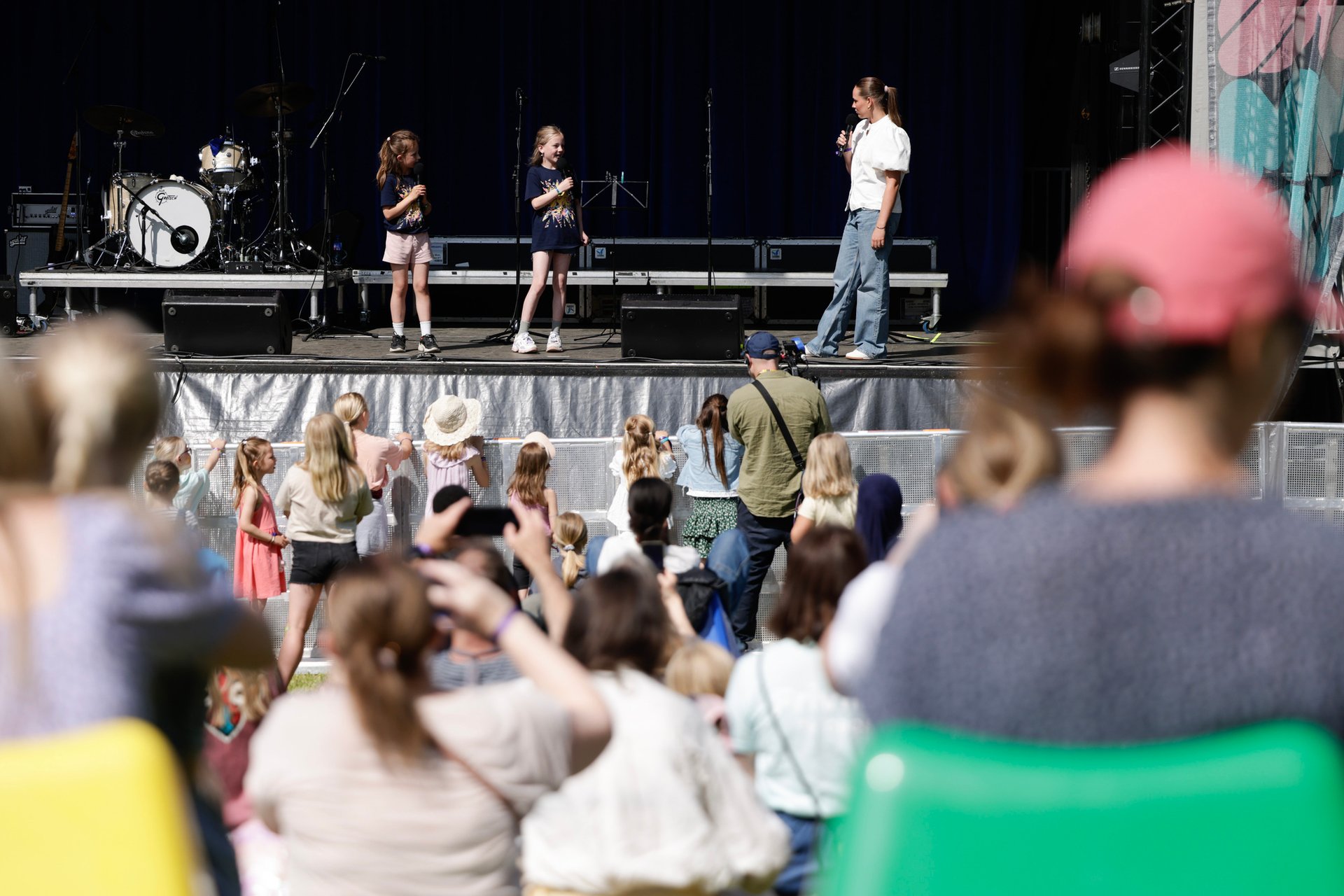 – Vi har sendt invitasjon til prinsessen, og vet dere hva? Hun ville komme! Og nå er Prinsessen her! Ta vel imot Prinsesse Ingrid Alexandra! Hva fikk deg til å si ja til invitasjonen? Spurte Thelma og Ingeborg fra scenen.