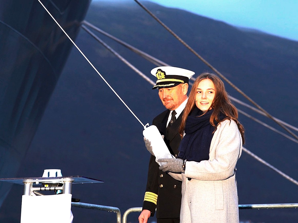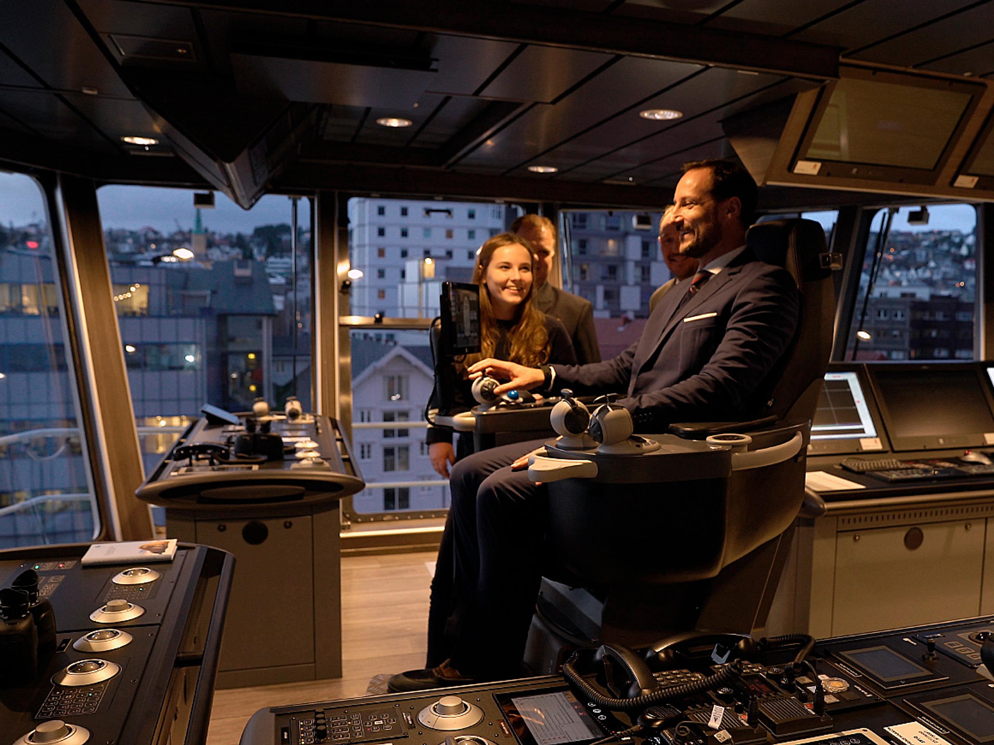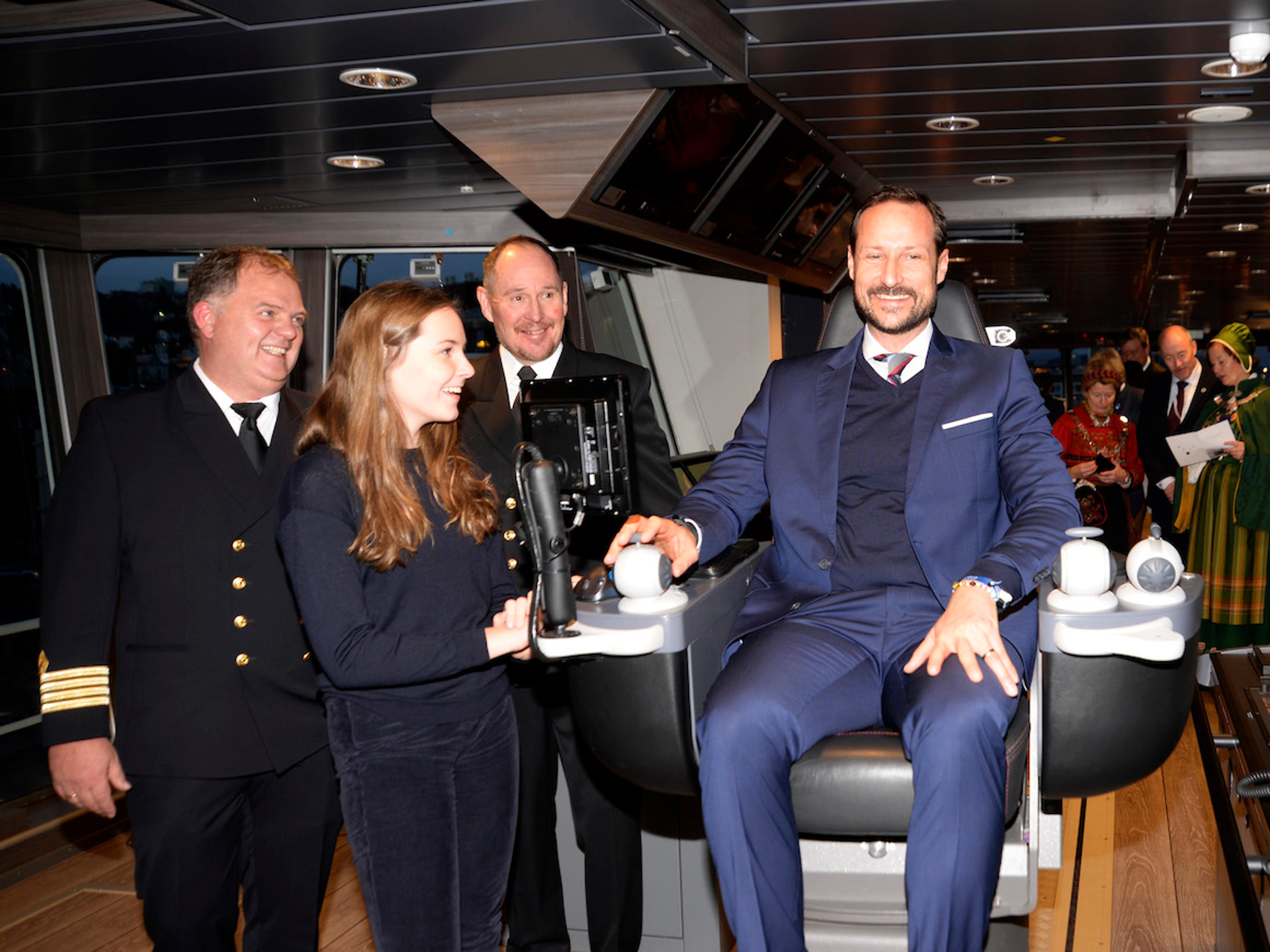 Hennes Kongelige Høyhet Prinsesse Ingrid Alexandra døpte Norges nye forskningsfartøy FF Kronprins Haakon, assistert av skipets kaptein, Johnny Peder Hansen.