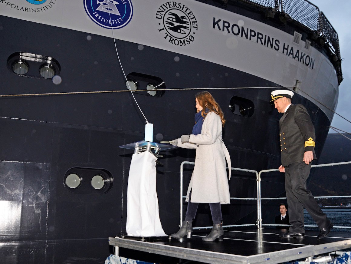 "Jeg døper deg "Kronprins Haakon". Måtte hell og lykke følge deg, ditt mannskap og alle om bord på dine oppdrag i nord og sør." Norges nye forskningsskip ble døpt i sin hjemmehavn Tromsø i dag.