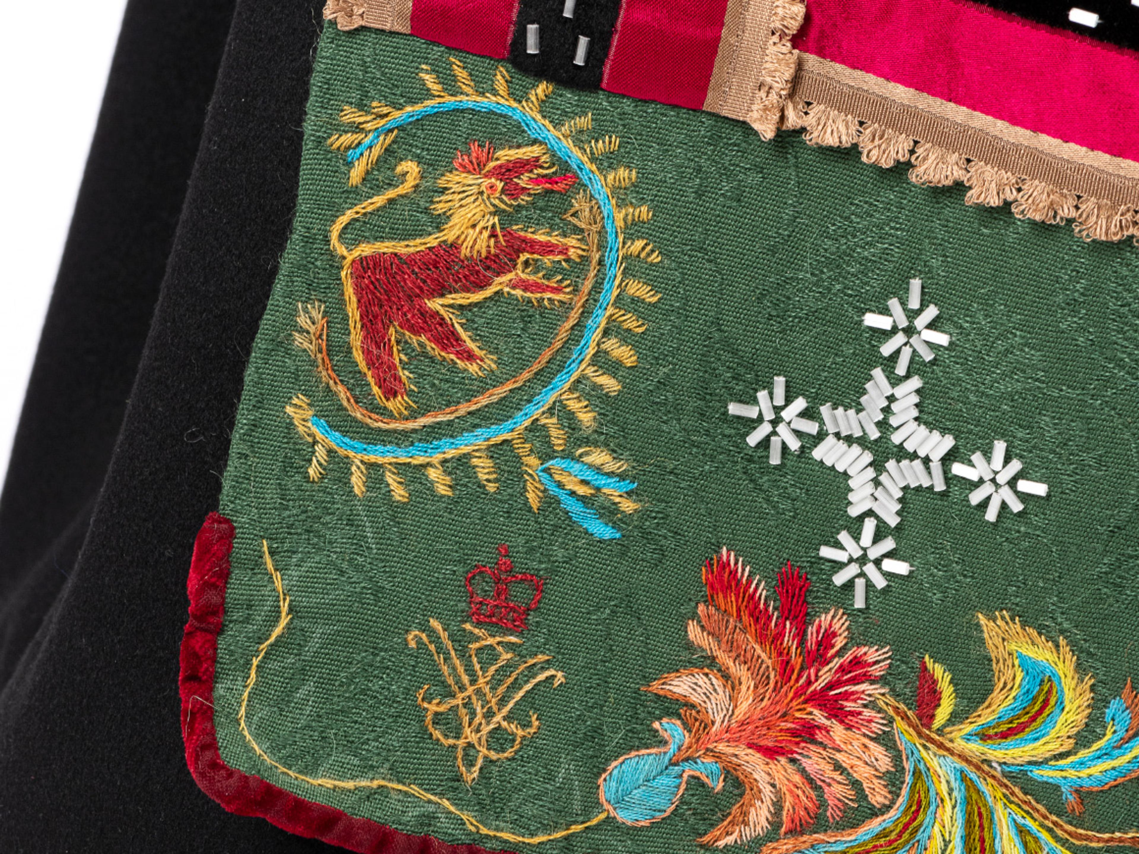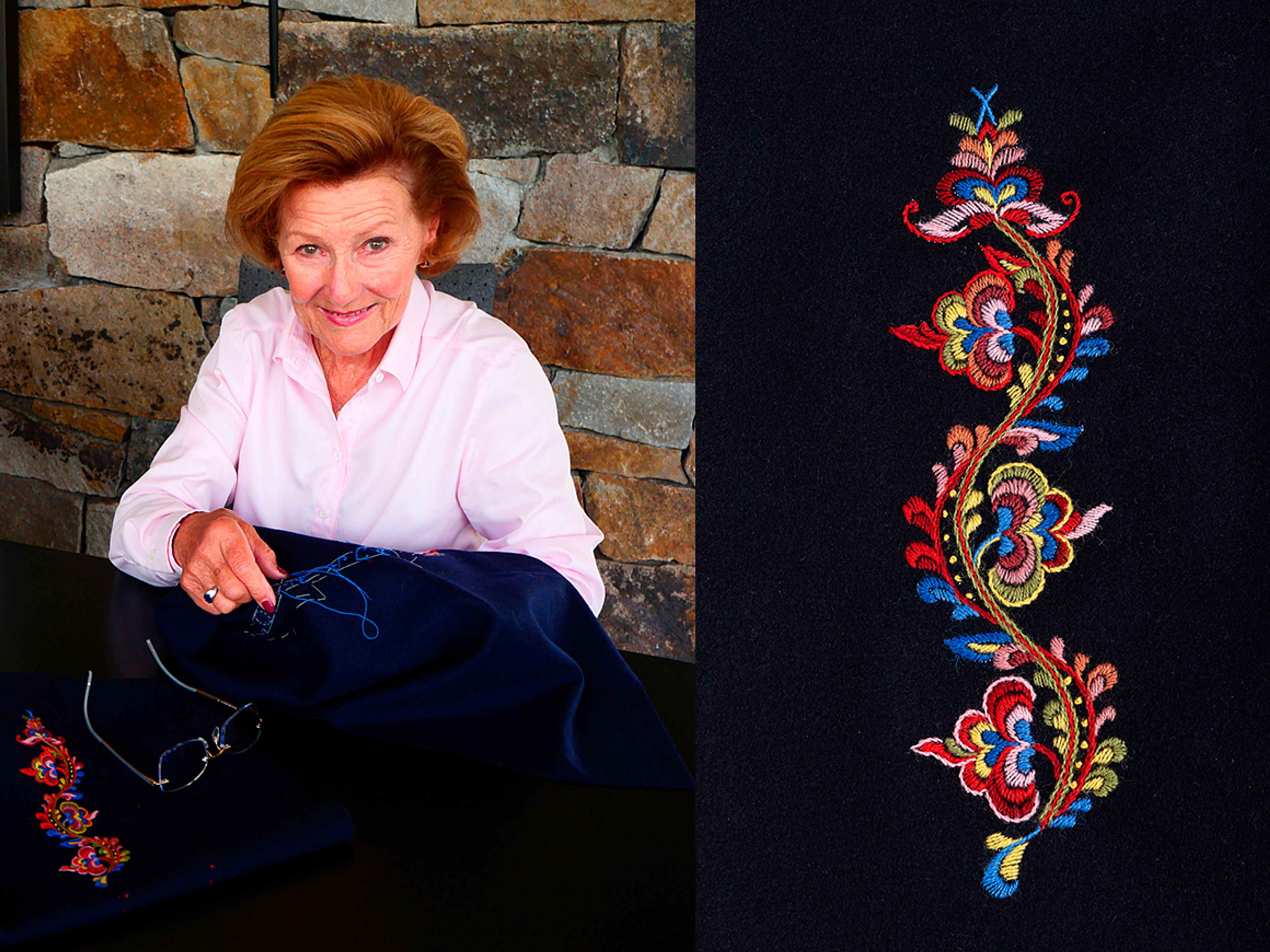 Vadmelsstrømpene til bunaden er det Dronning Sonja som har brodert.