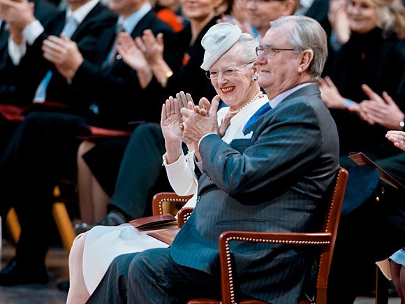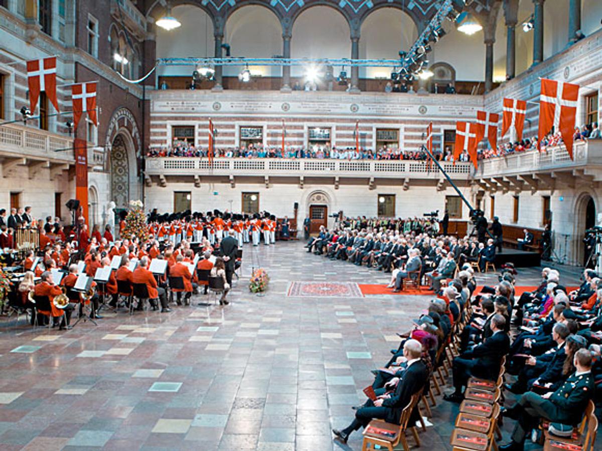 De kongelige gjestene var på plass i Rådhushallen da Dronning Margrethe og hennes mann, H.K.H. Prins Henrik ankom rådhuset i karet. Gullkareten ble bygget i 1840 og benyttes ved spesielle anledninger. I dag ble kareten trukket av seks hester og ledsaget av gardehusarer gjennom Københavns gater fra Amalienborg slott til rådhuset.