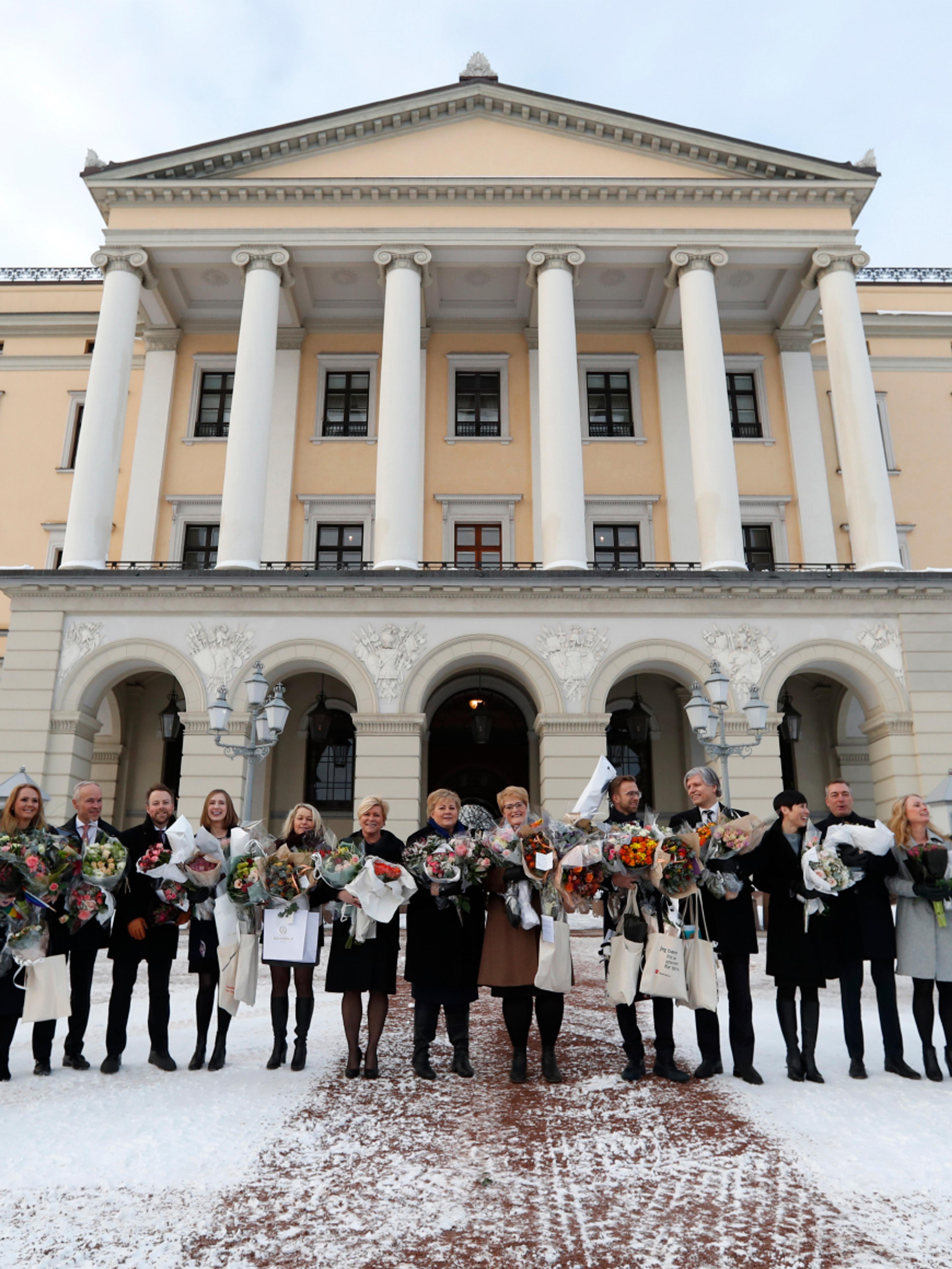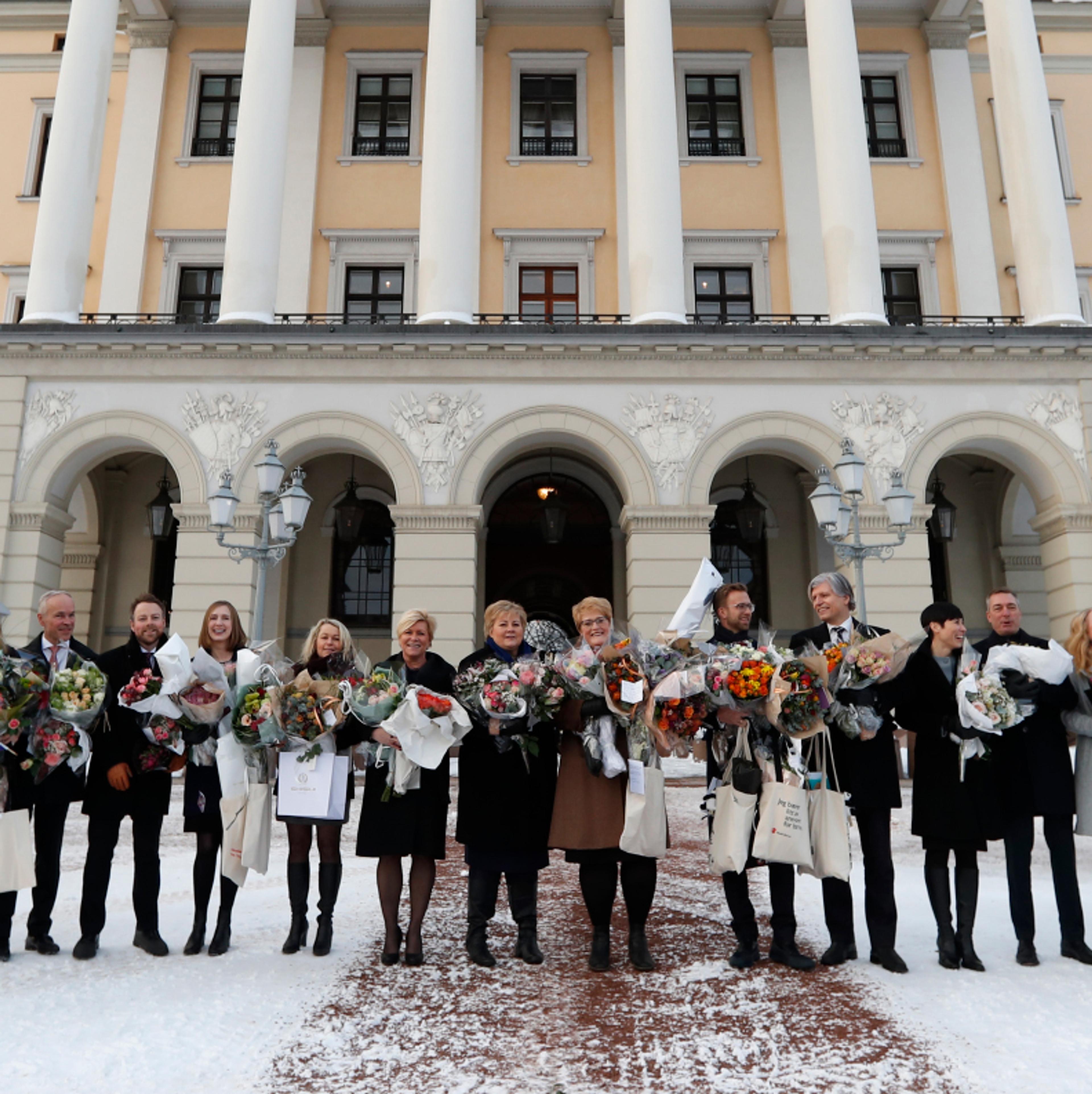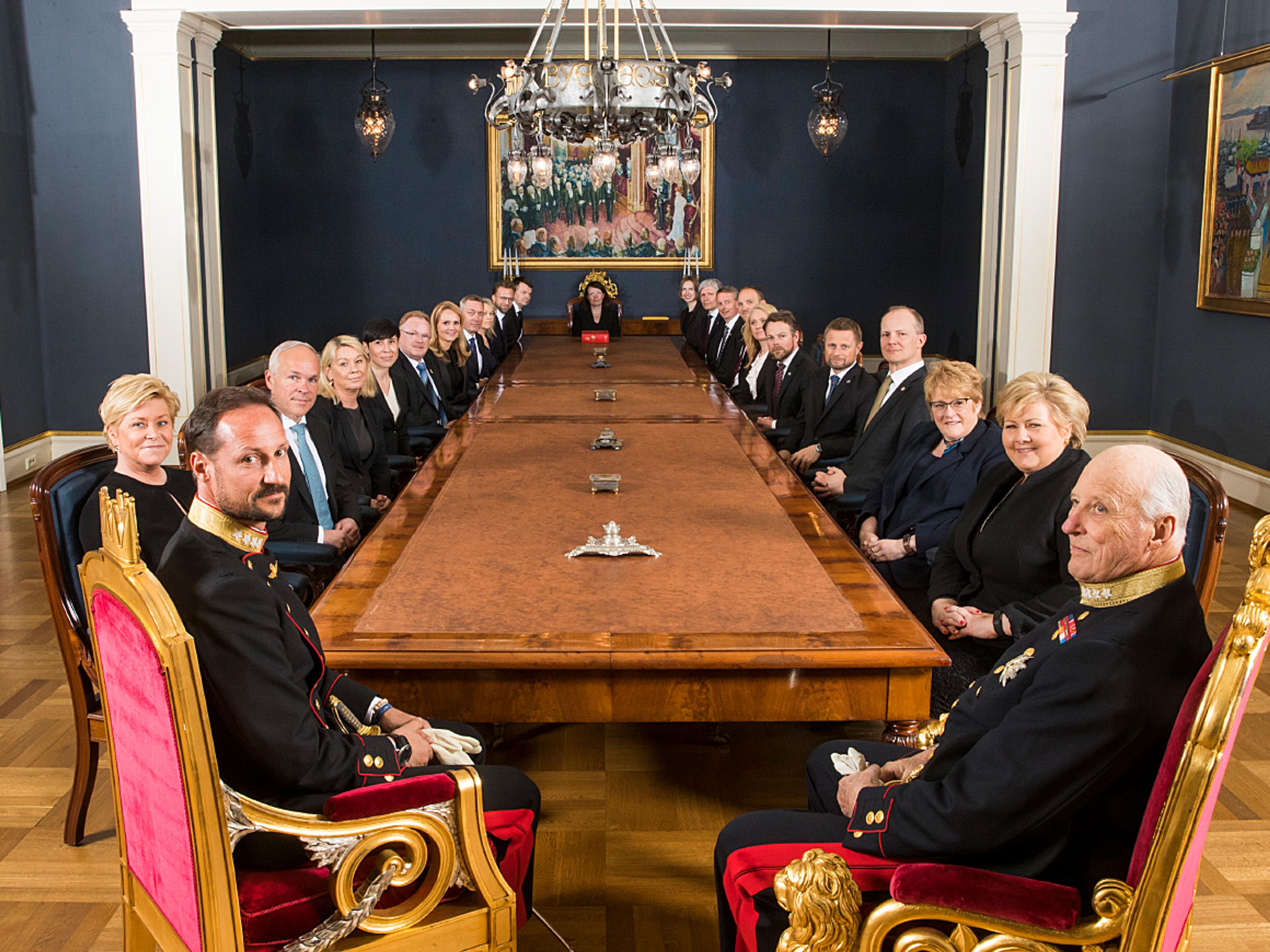 I dag avholdt Hans Majestet Kongen to ekstraordinære statsråd på Det kongelige slott. Regjeringen Stoltenberg trådte av og påtroppende statsminister Erna Solbergs regjering ble formelt utnevnt.