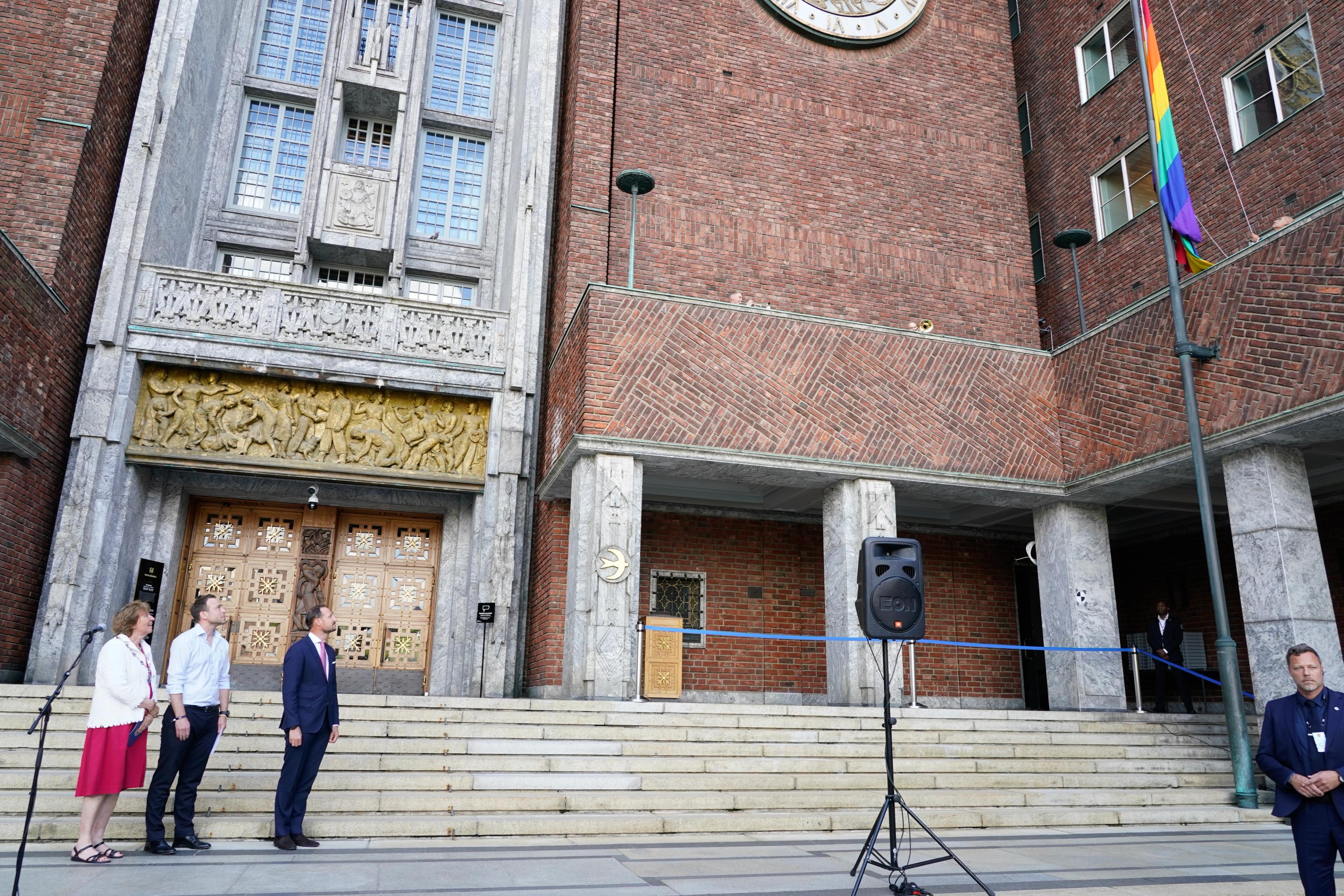 Hans Kongelige Høyhet Kronprins Haakon var til stede da Oslo kommune heiste regnbueflagget utenfor Oslo rådhus. Dette markerte starten på Pride-feiringen i hovedstaden.