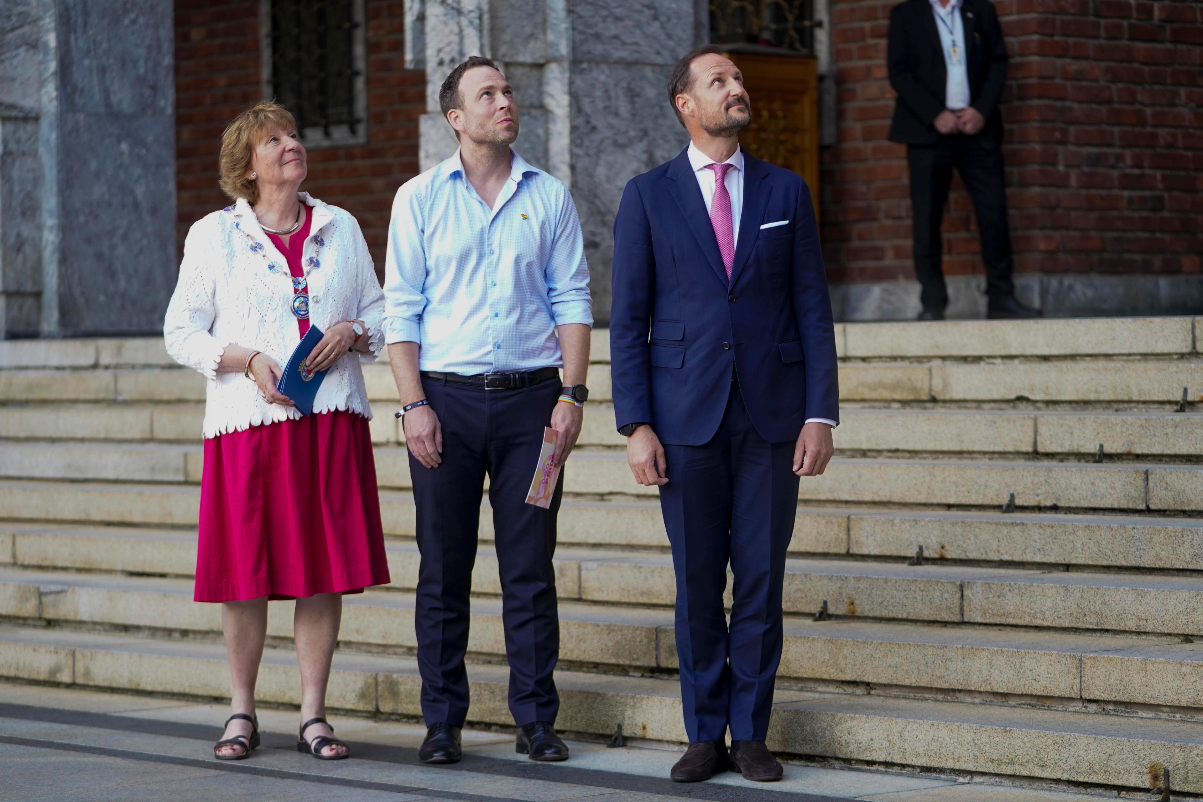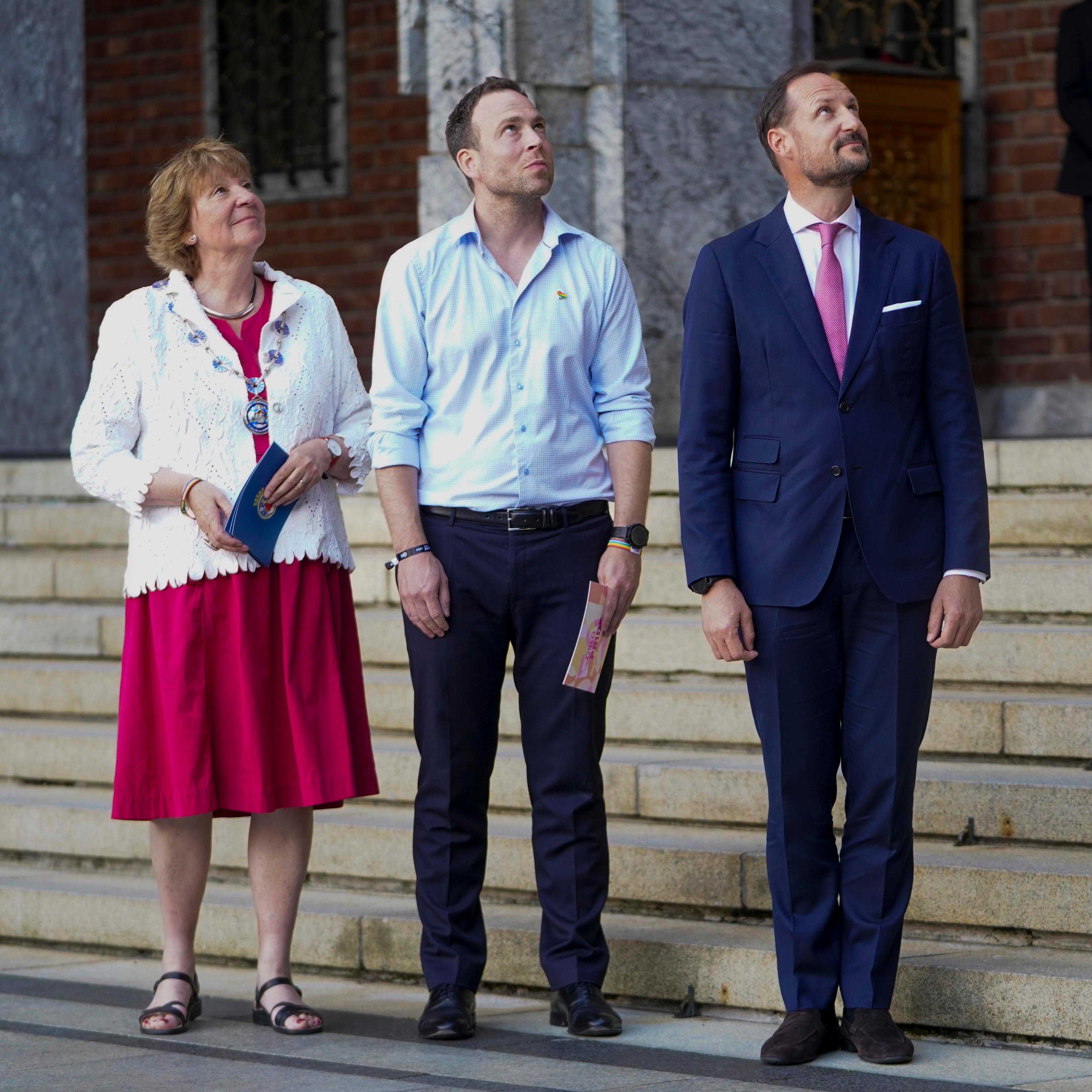 - Det er fint å være med på flaggheisingen i år og feire kjærligheten, mangfoldet og friheten, sa Kronprins Haakon etter at regnbueflagget hadde blitt heist til topps i borggården på Oslo rådhus.