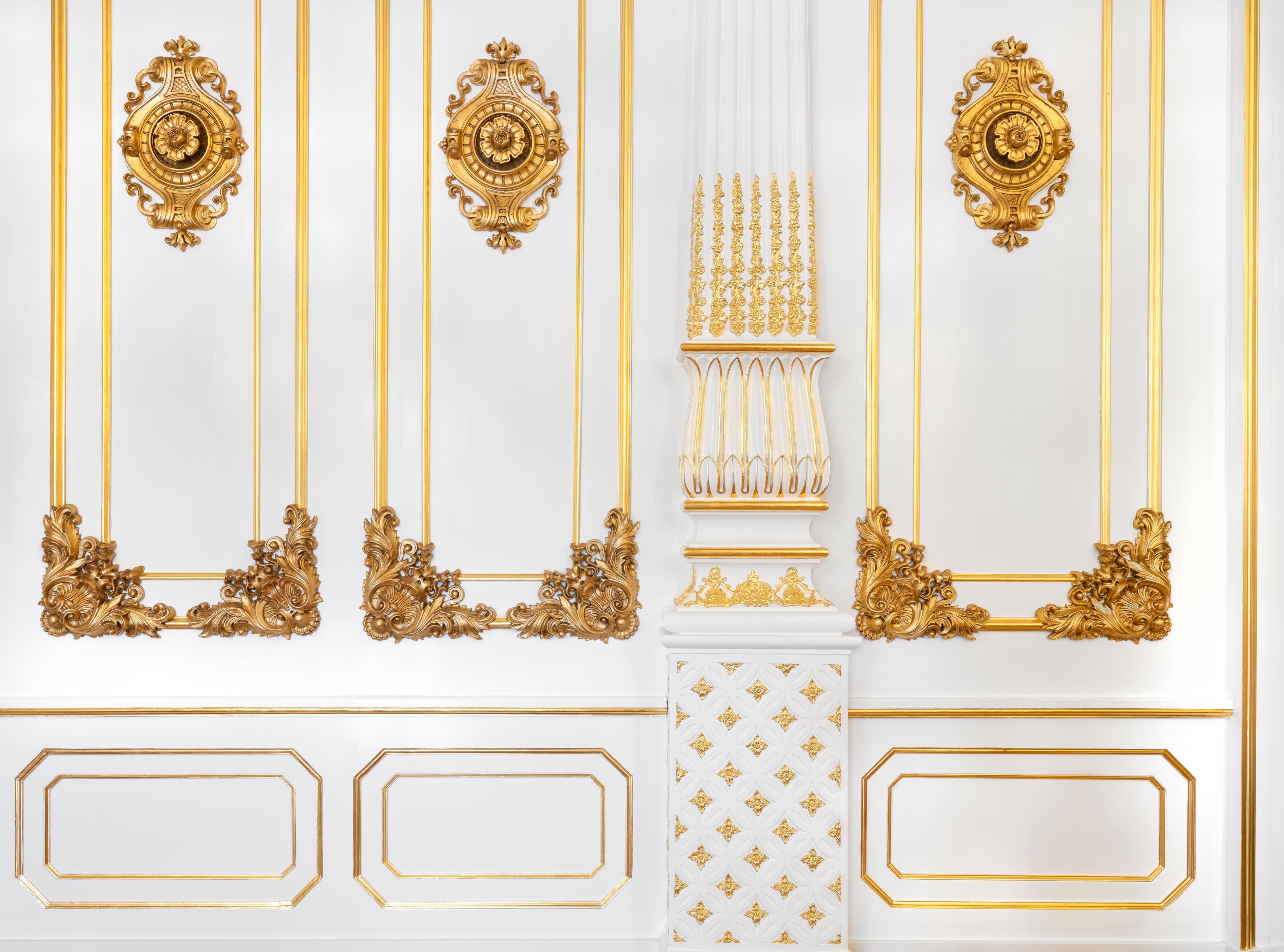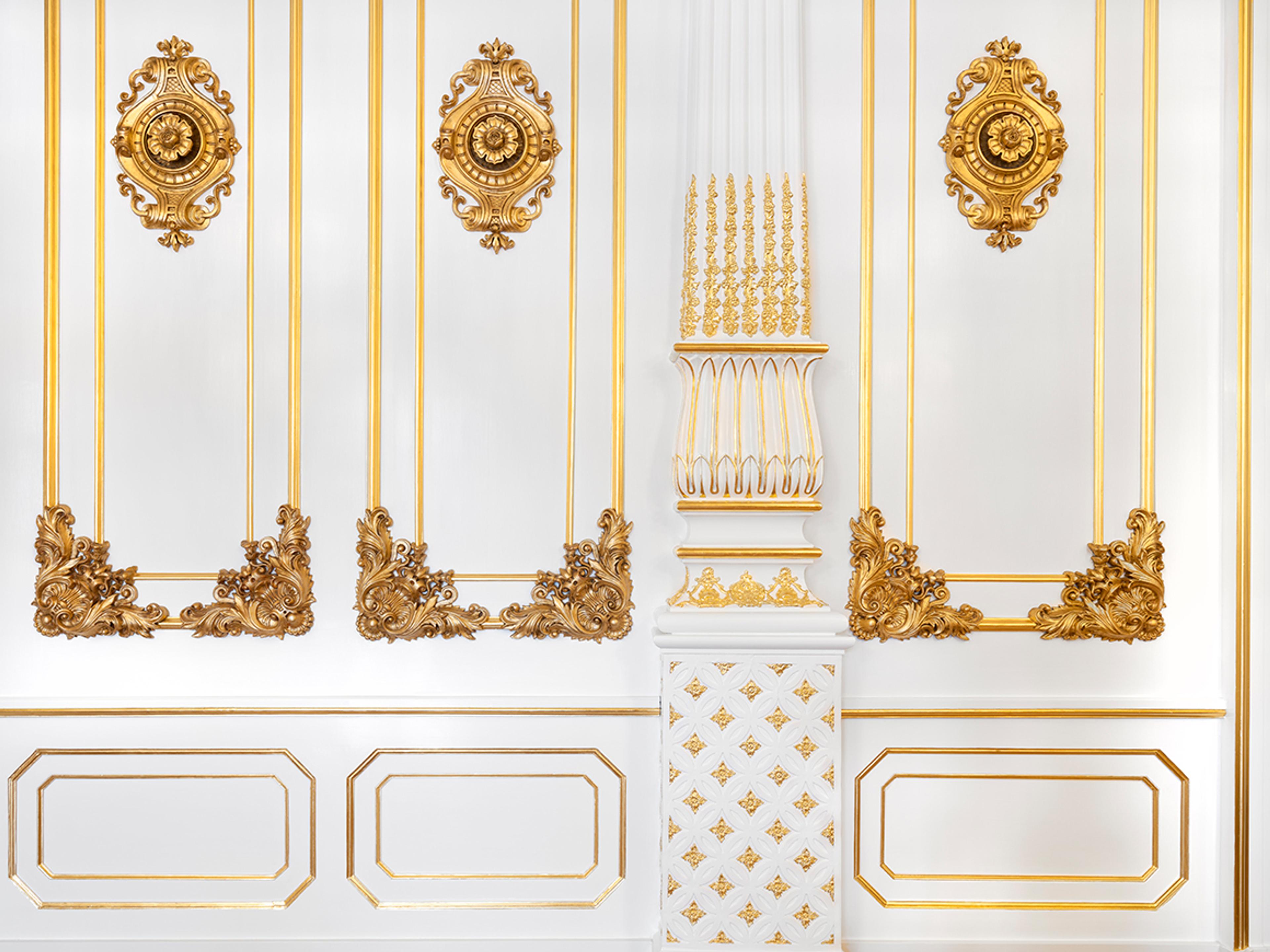 Fastmonterte konsollbord ble tilbakeført med opprinnelig overflatebehandling med forgylling i bladgull og eikegulvet ble oppgradert og framstår nå med en gyllen dybde.