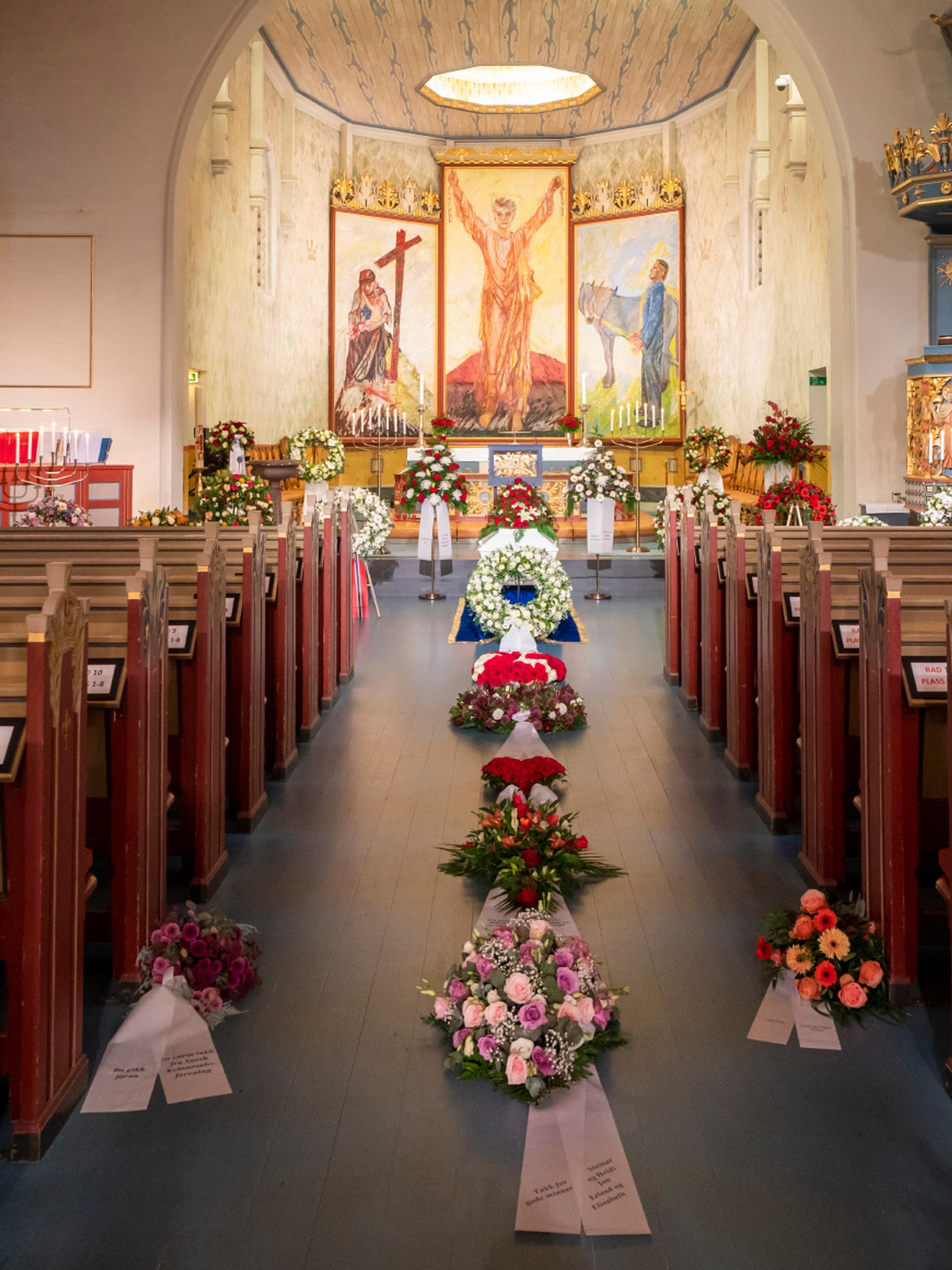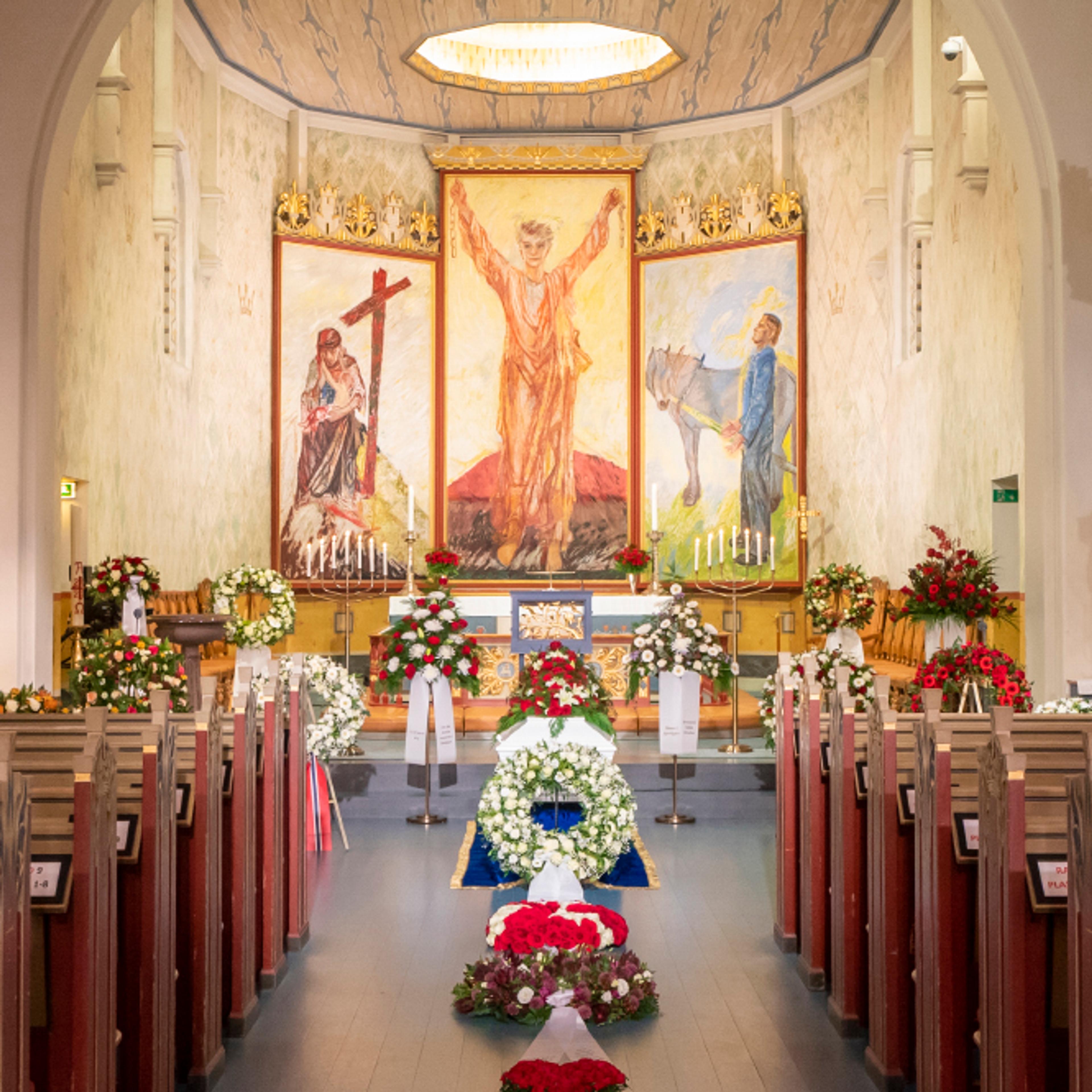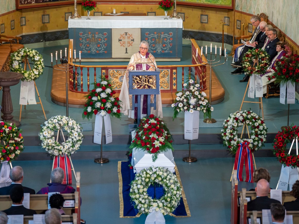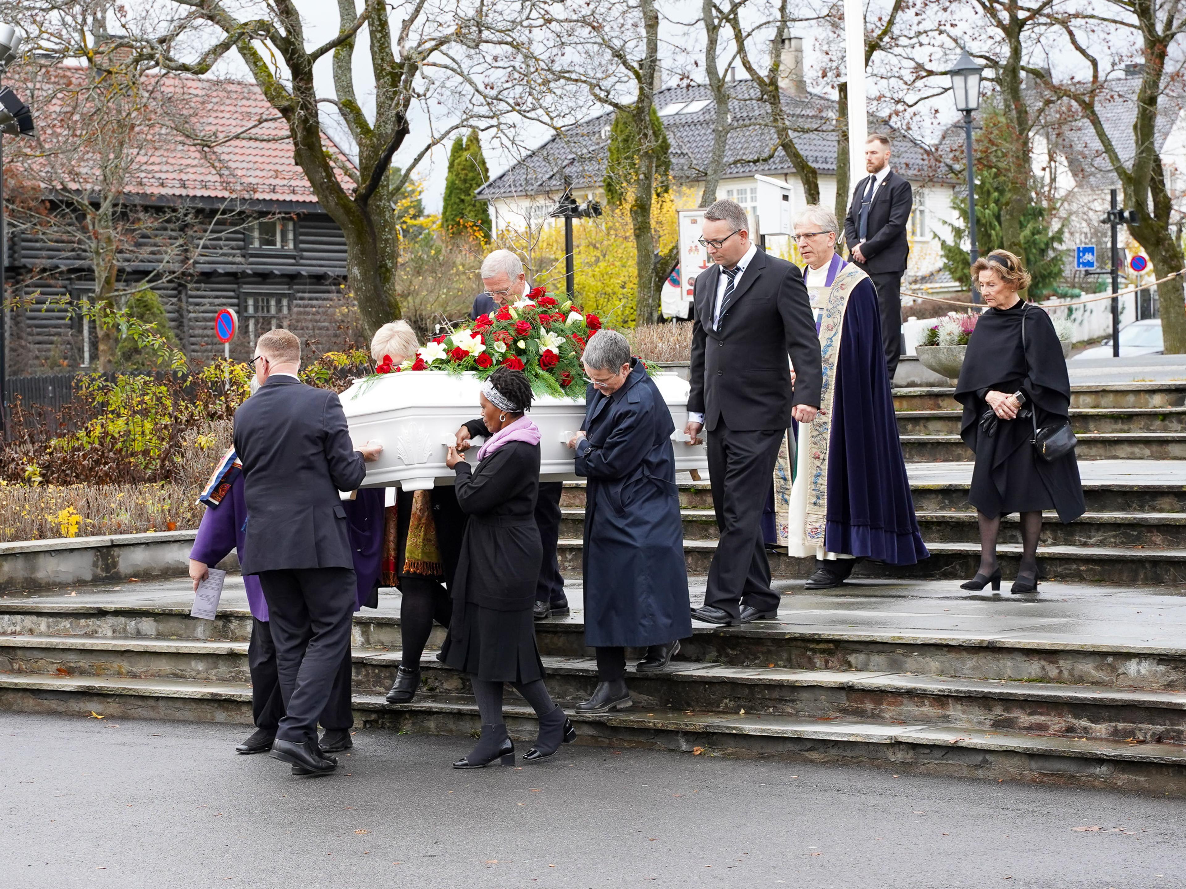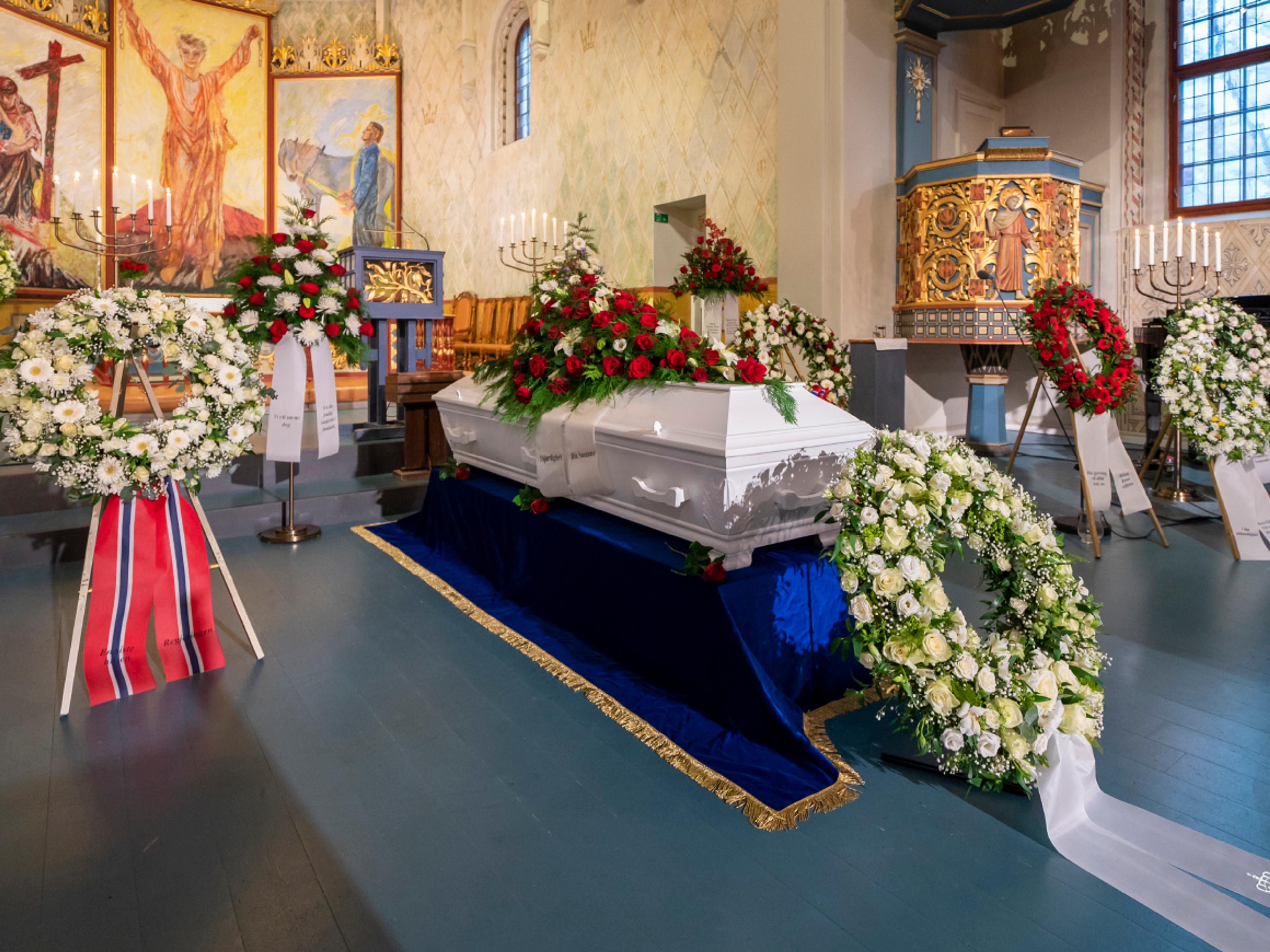 Representanter for Stortinget, Regjeringen og Høyesterett var til stede under begravelsen, som fant sted på statens bekostning. Solist Kristine Våge sang the Rose av Amanda McBroom, Pie Jesu fra Faurés rekviem og Bachs Bist du bei mir, mens hele kirken stemte i under salmene Herre gud ditt dyre navn og ære og Den signede dag.