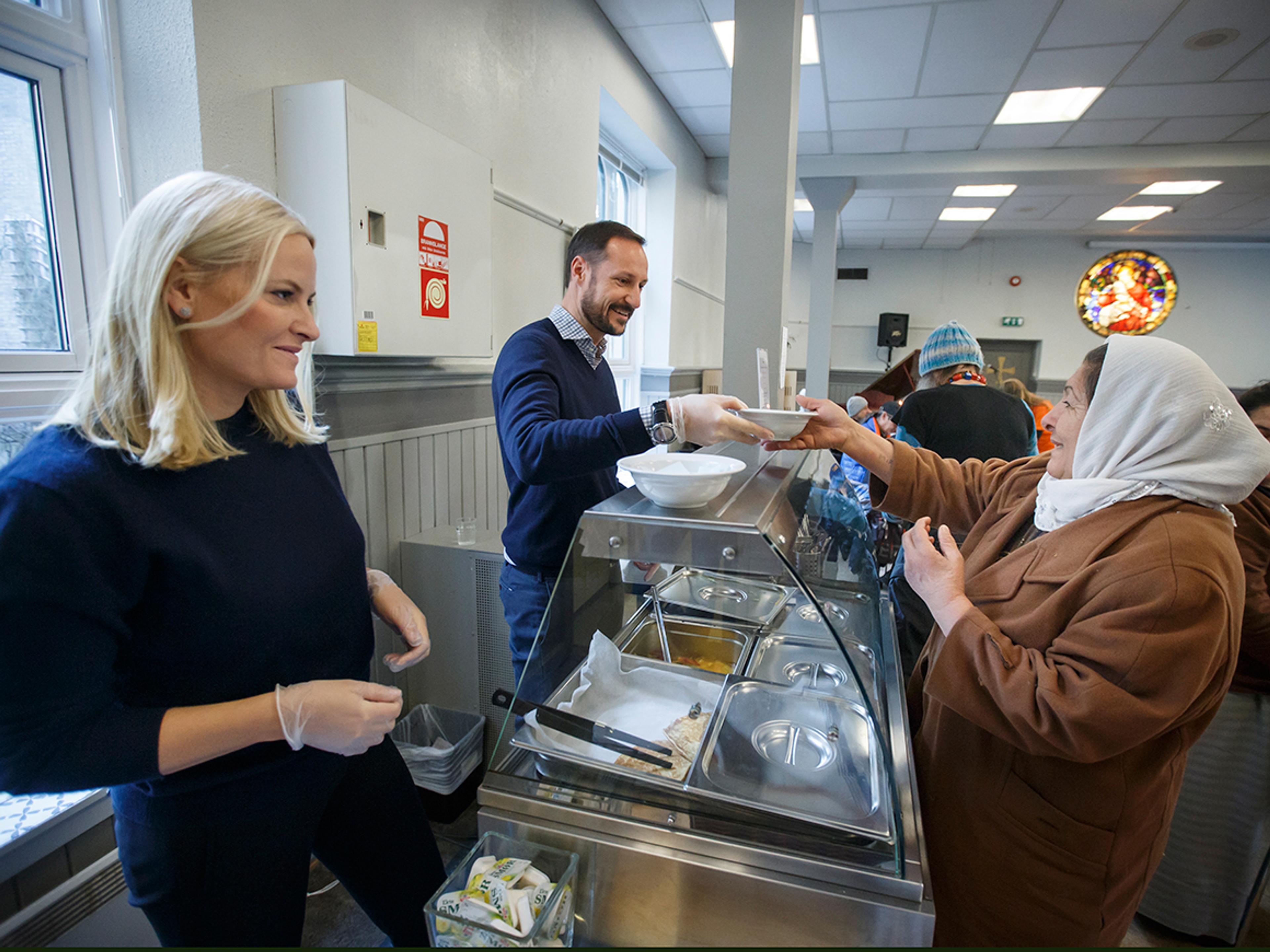 På Tøyen i Oslo inviterer Kirkens Bymisjon til frokost for fattige og hjemløse. De fleste tilreisende fra Europa. I dag tidlig sto Kronprinsparet for serveringen.