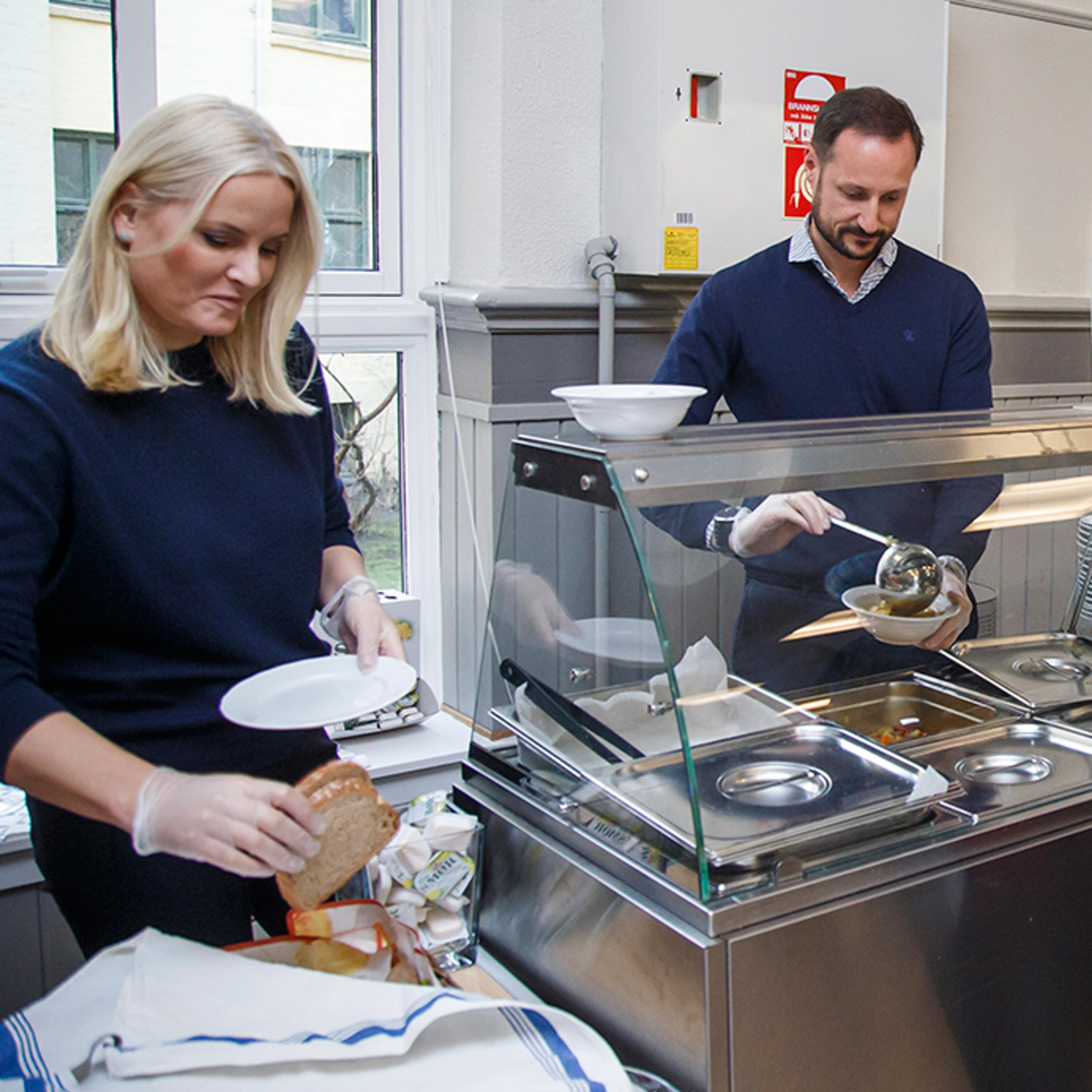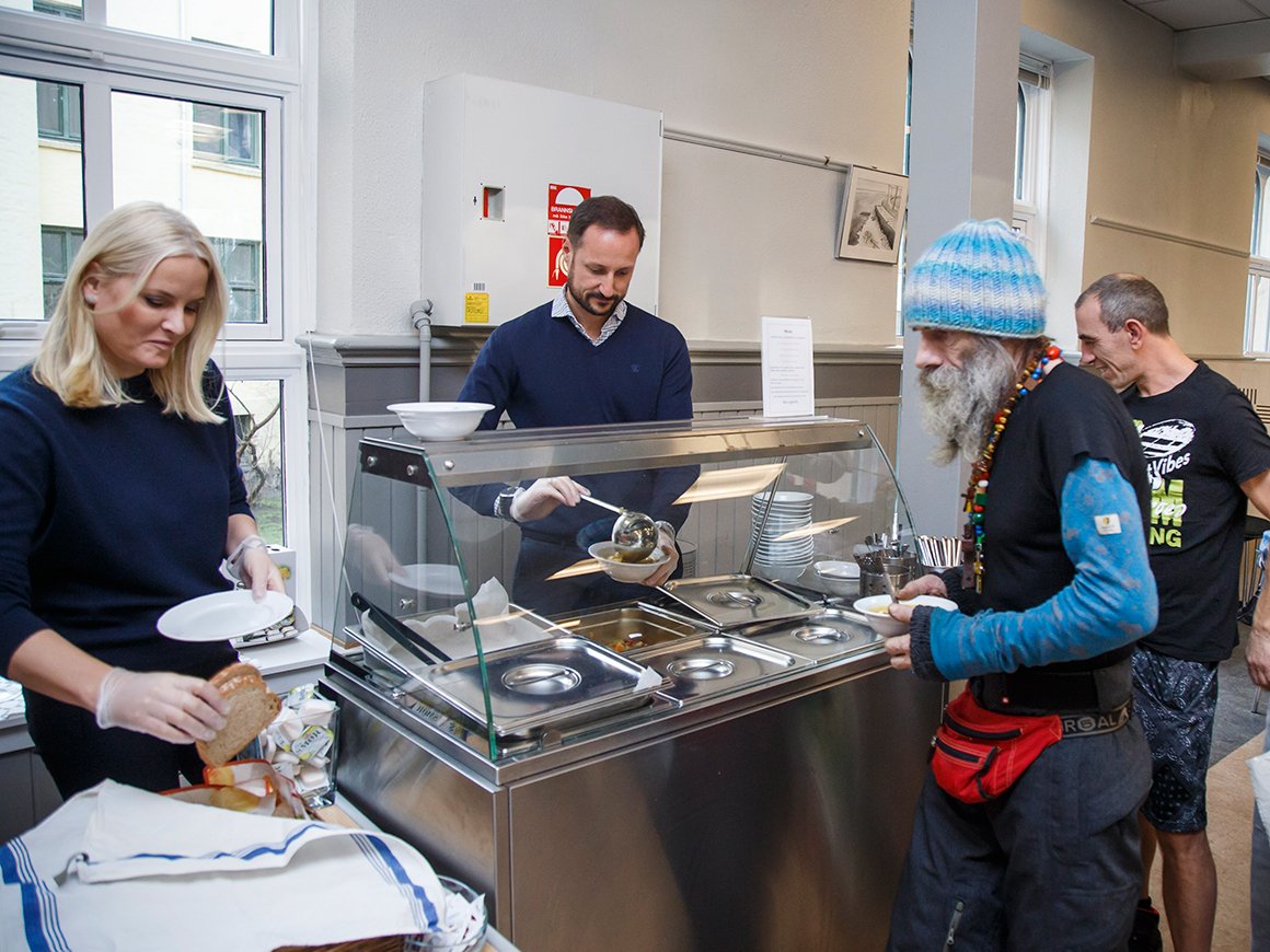 Kronprinsparet ble raskt satt i gang med å servere dagens varme grønnsaksuppe med brød og smør. Smilene satt løst både hos frokostgjester og Kronprinspar. Ordfører Marianne Borgen fikk ansvaret for å servere kaffen. Denne mandagen var alle bordene fulle og det var mange som ville slå av en prat mens Kronprinsessen øste suppe og Kronprinsen serverte. Da alle hadde fått mat, fikk Kronprinsparet mulighet til å sitte sammen med noen av frokostgjestene og høre litt om hvordan de hadde det og hva dette tilbudet betydde for dem.