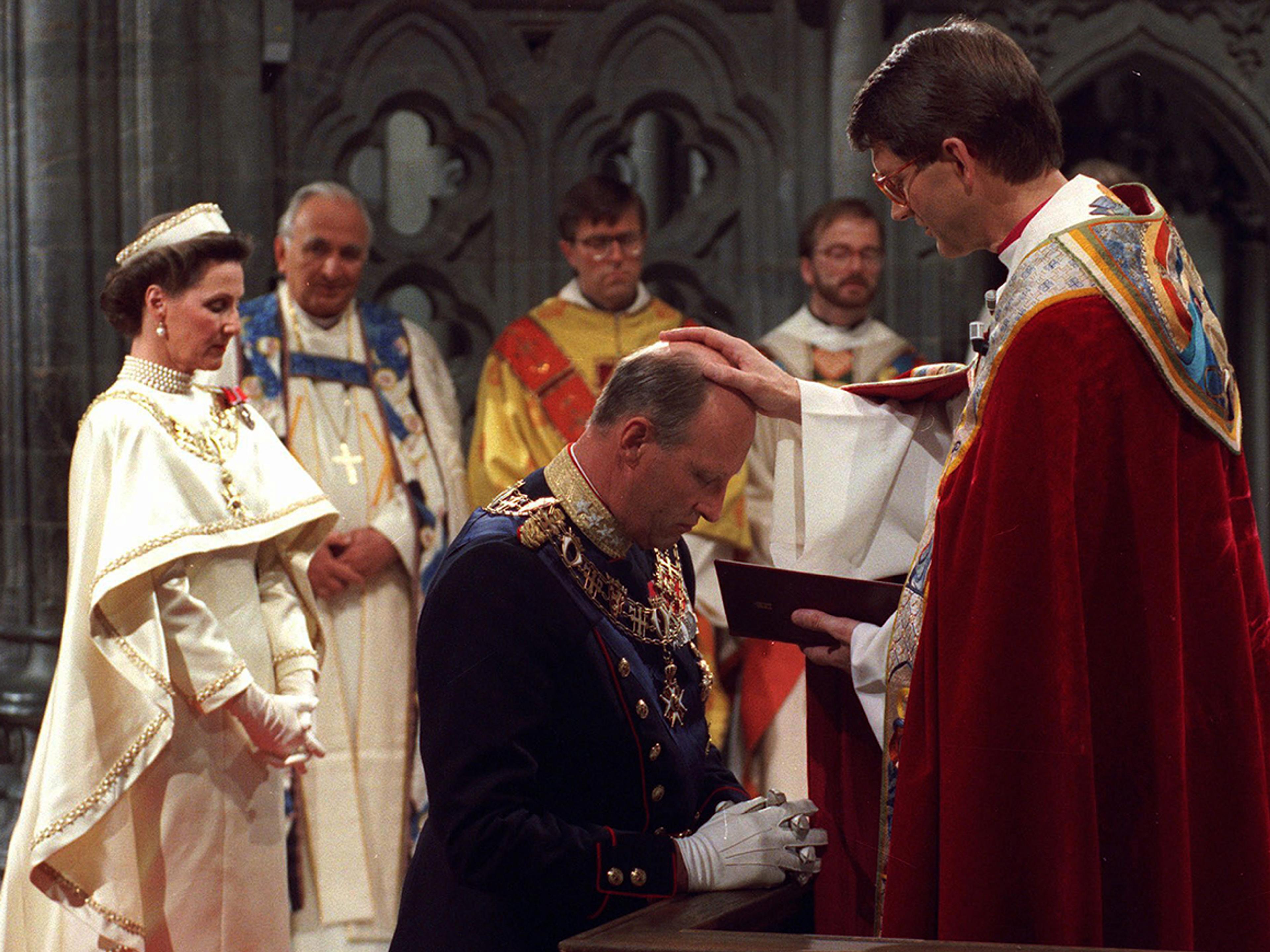 Kongekronen og Dronningkronen lå på alteret under signingen i 1991, som ved signingen av Kong Olav V i 1958, men plasseres ikke lenger på monarkens hode. Kong Haakon og Dronning Maud var siste Kongepar som ble kronet i Norge - 22. juni 1906.