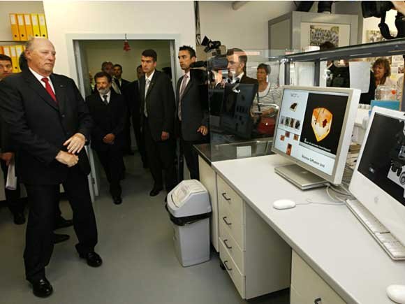 Radiumhospitalets tidligere direktør, Jan Vincent Johannessen, ga en orientering om det portugisisk - norske samarbeidet før Kongen fikk en omvisning i ett av forskningslaboratoriene.