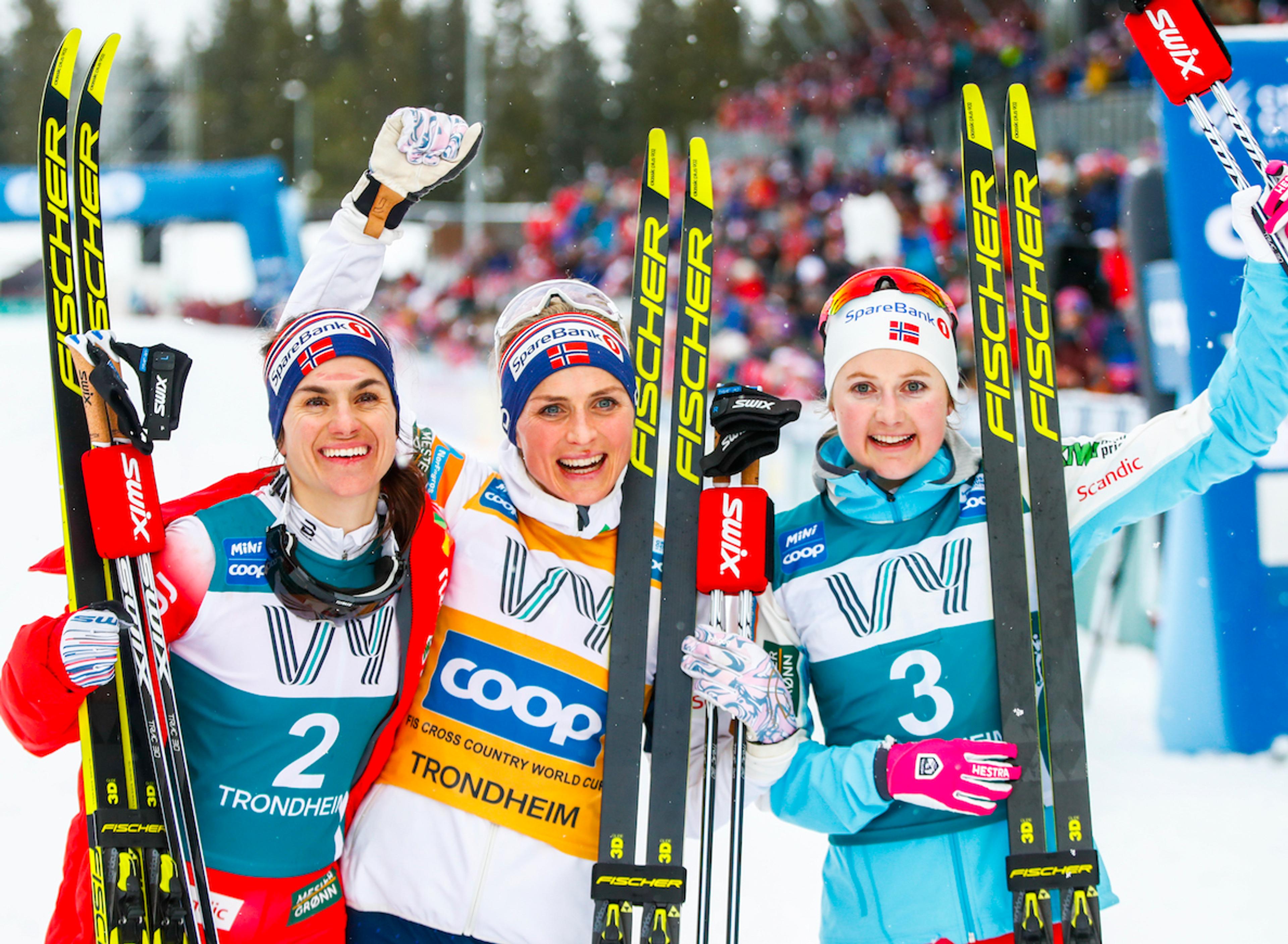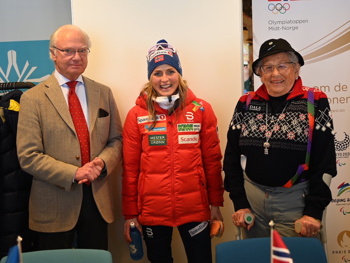 Prinsesse Astrid, fru Ferner og Hans Majestet Kong Carl Gustaf av Sverige har fulgt de avsluttende øvelsene i Ski Tour 2020 denne helgen. De kunne gratulere Therese Johaug med seier i Granåsen.
