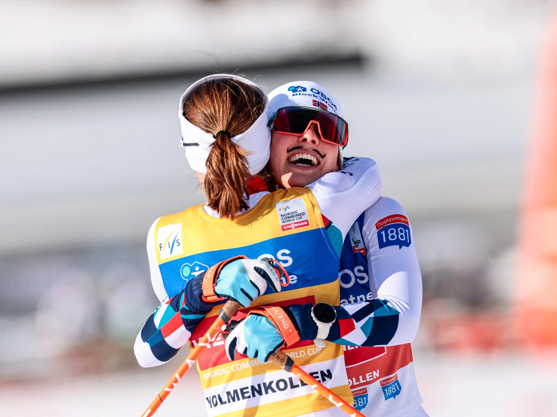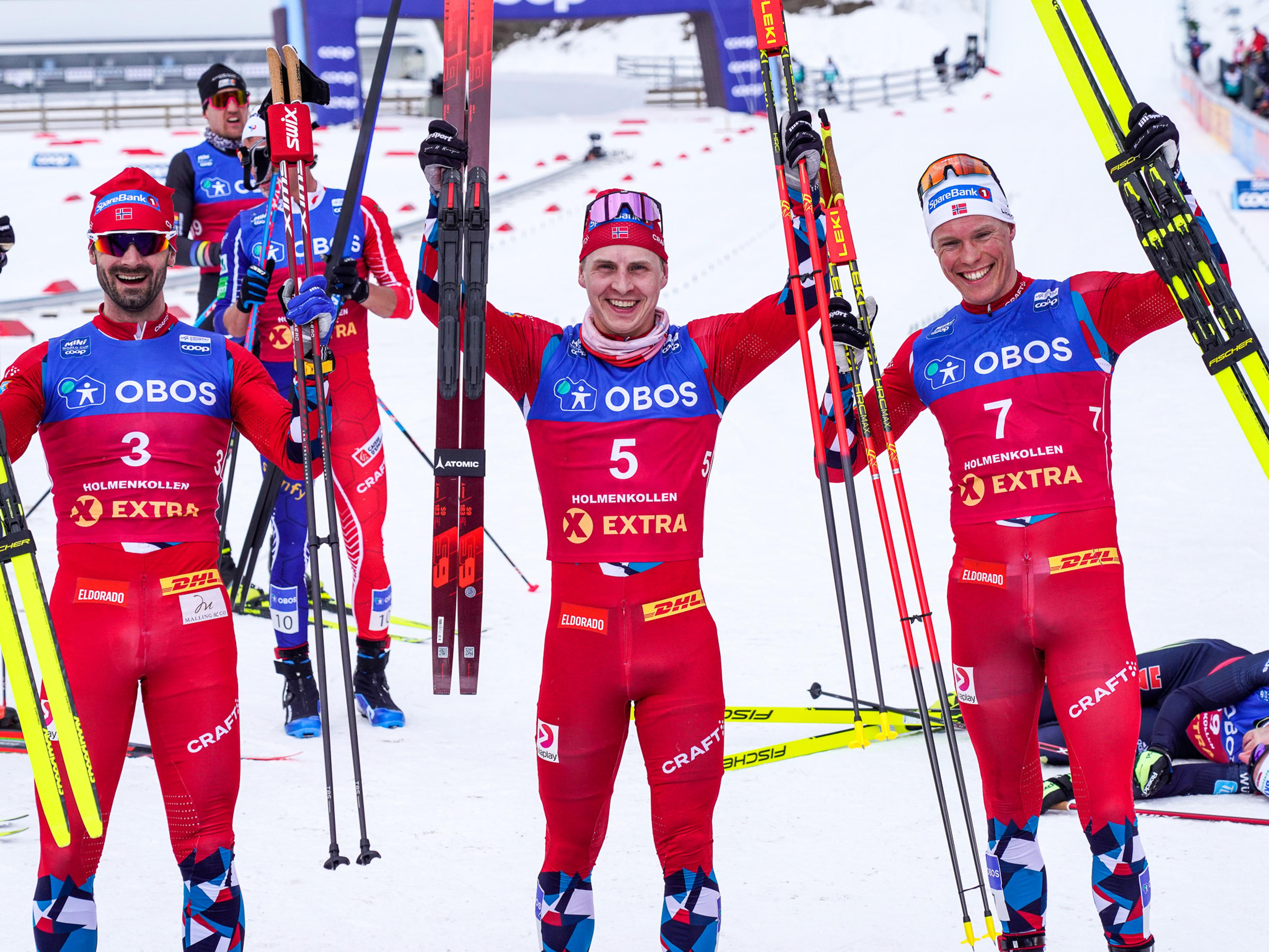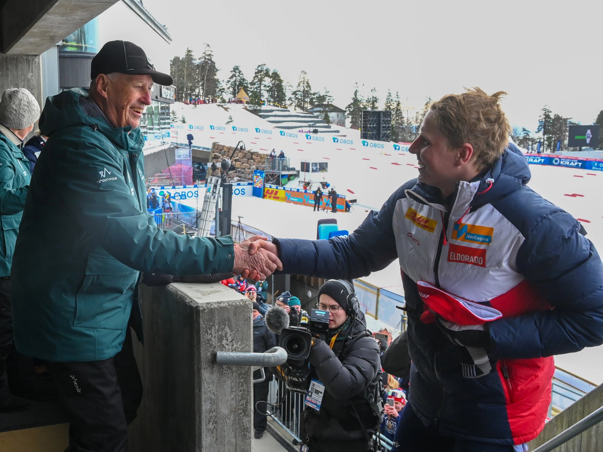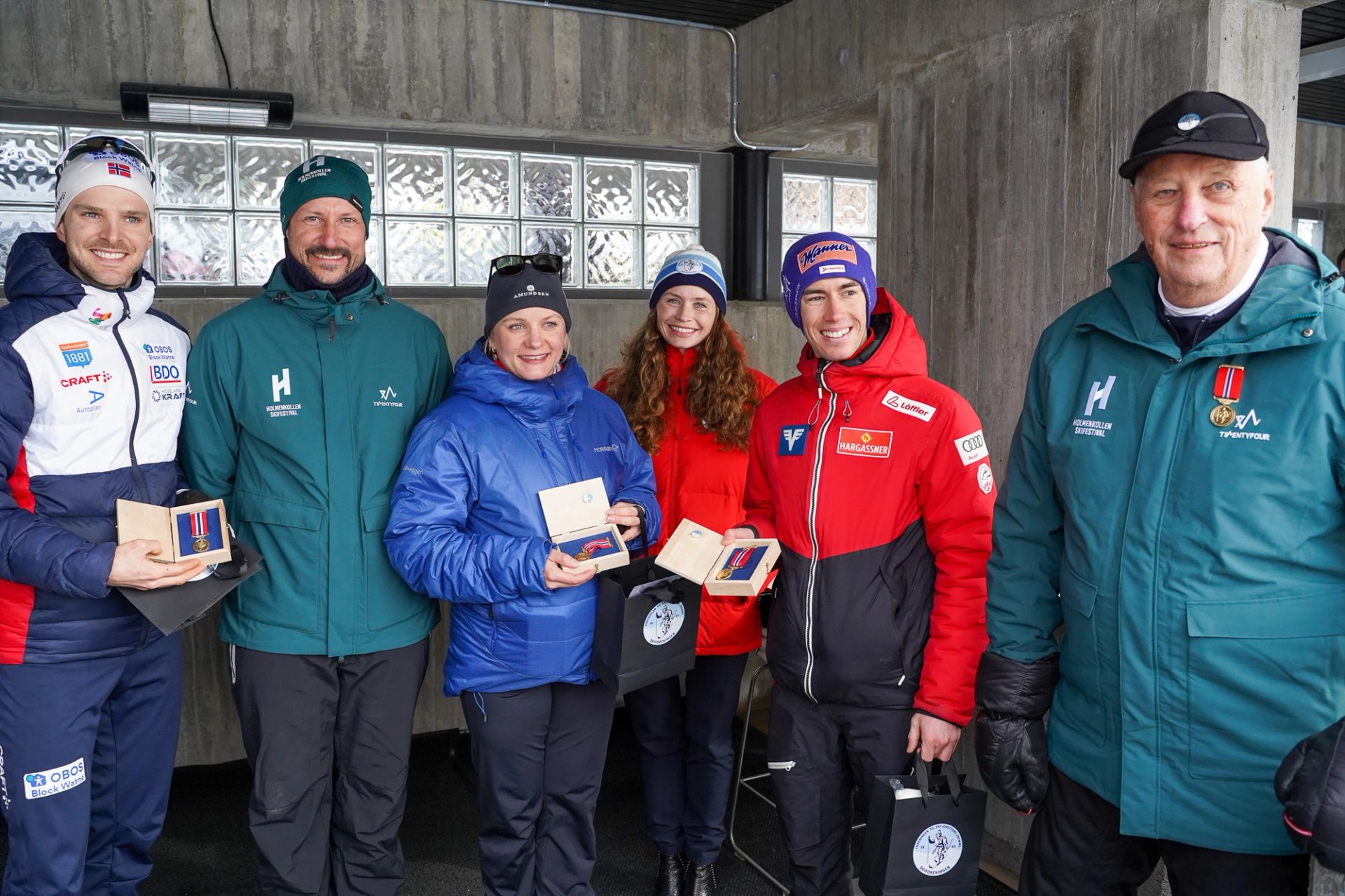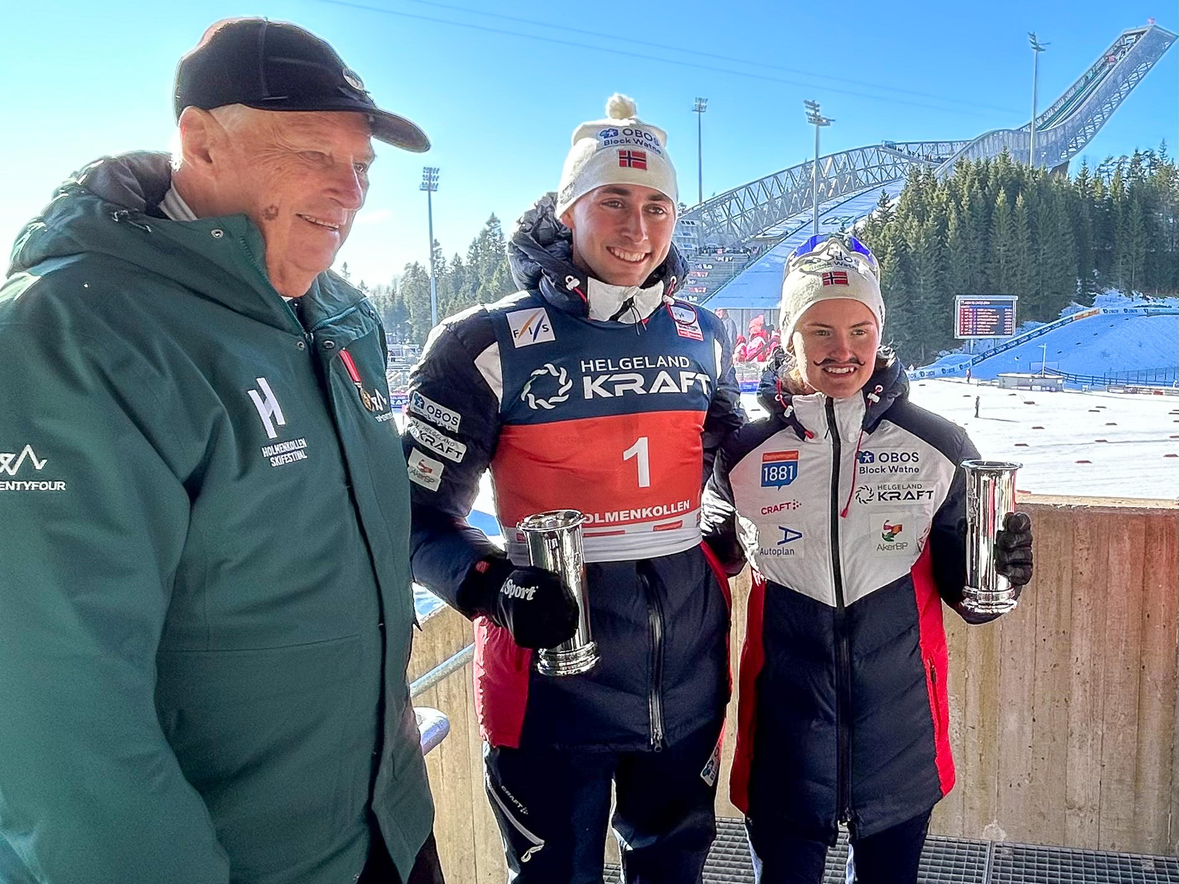 Kongen og Prinsesse Astrid gratulerte Jarl Magnus Riiber og Gyda Westvold Hansen med kombinertseier og kongepokal lørdag. Tidligere på dagen vant Simen Hegstad Krüger femmila i Holmenkollen foran ni andre nordmenn. Det ble med andre ord en norsk jubeldag i strålende sol.