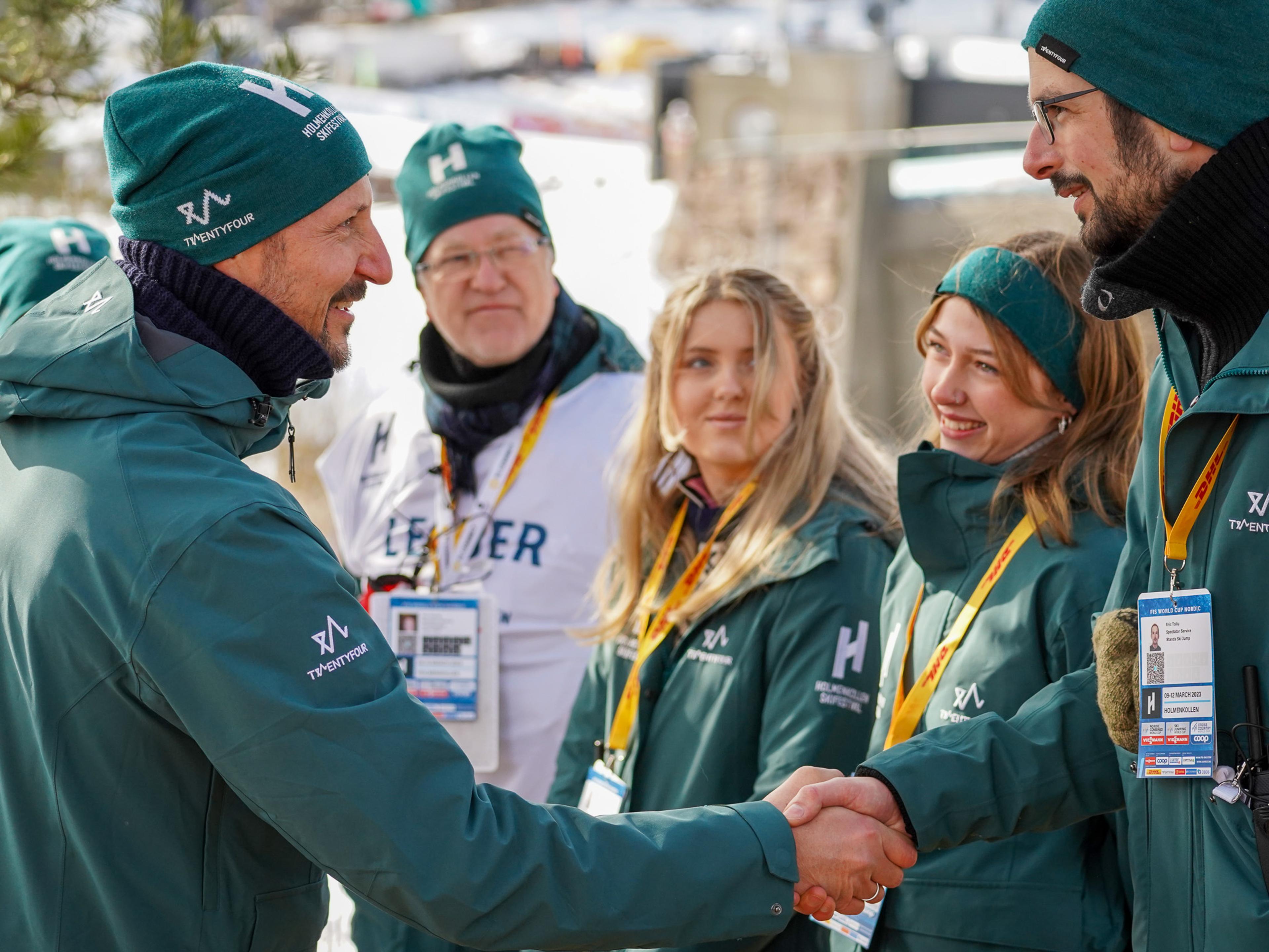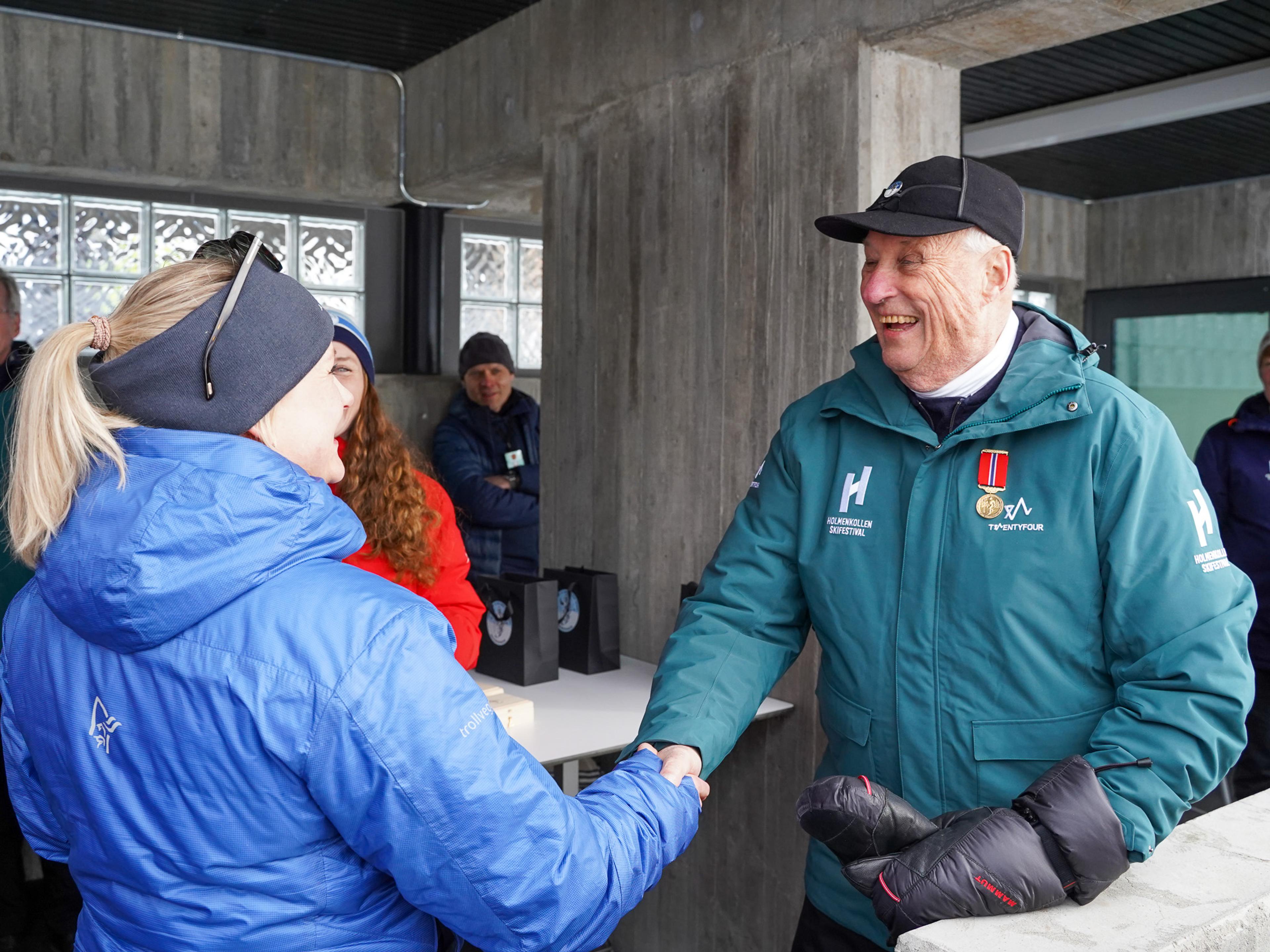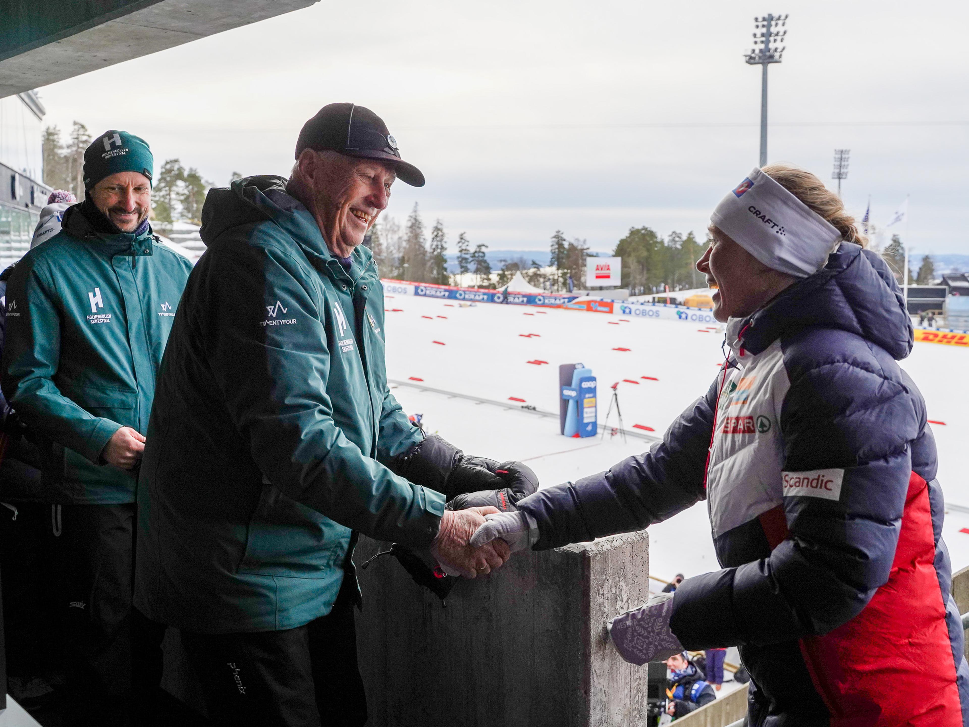 Stemningen var på topp på Kongetribunen etter seieren, og Ragnhild Haga fikk gratulasjoner både fra Hans Majestet Kongen, Hans Kongelige Høyhet Kronprinsen og Prinsesse Astrid, fru Ferner.