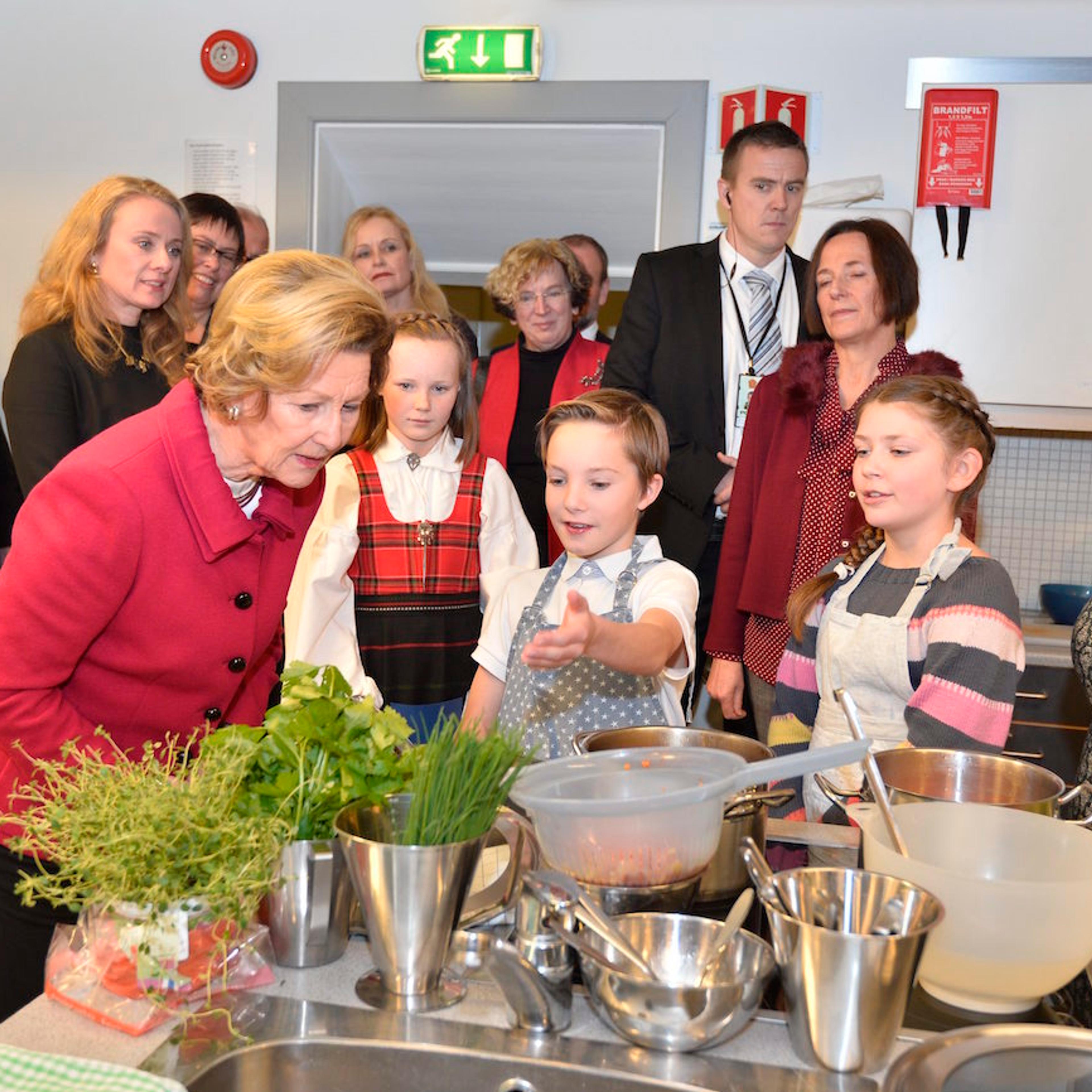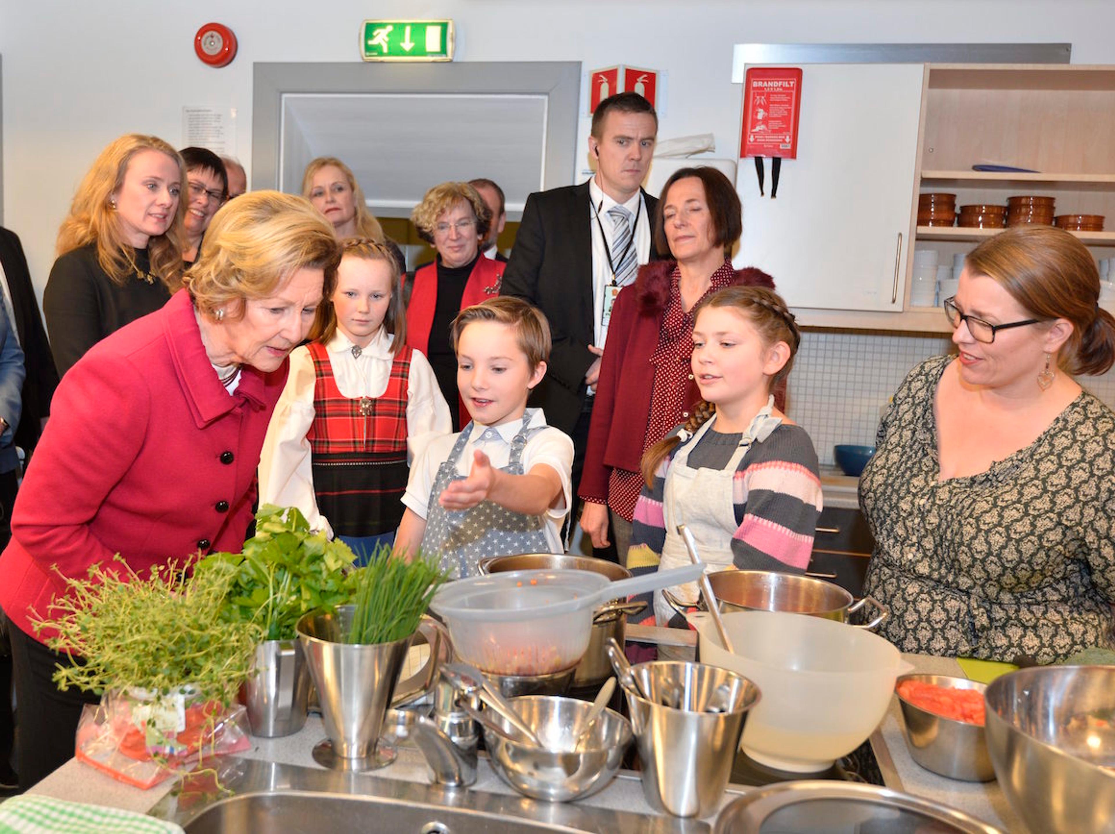 To av førsteklassingane ved skolen, Tora Marstrand Hasle og Dan Samson Girma, møtte Dronninga med blomster da ho kom til skolen. Deretter fekk Dronninga ei omvising på skolen i følgje med rektor Trude Mathisen og elevrådsleiar Frøy Ramsfjell. Da fekk Dronning Sonja besøkje både ein klasse med rettleidd skriving og ein klasse med norskopplæring på PC.