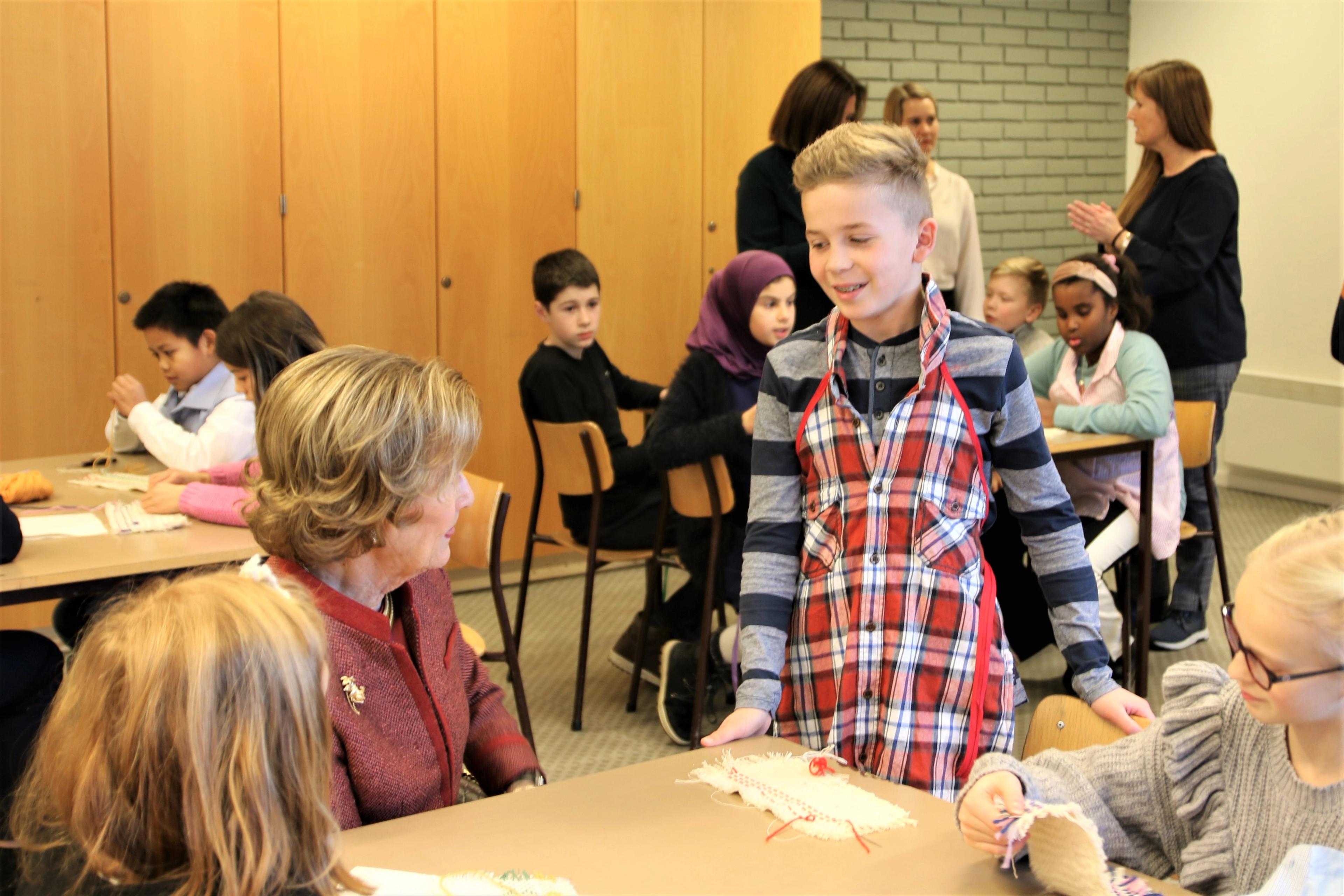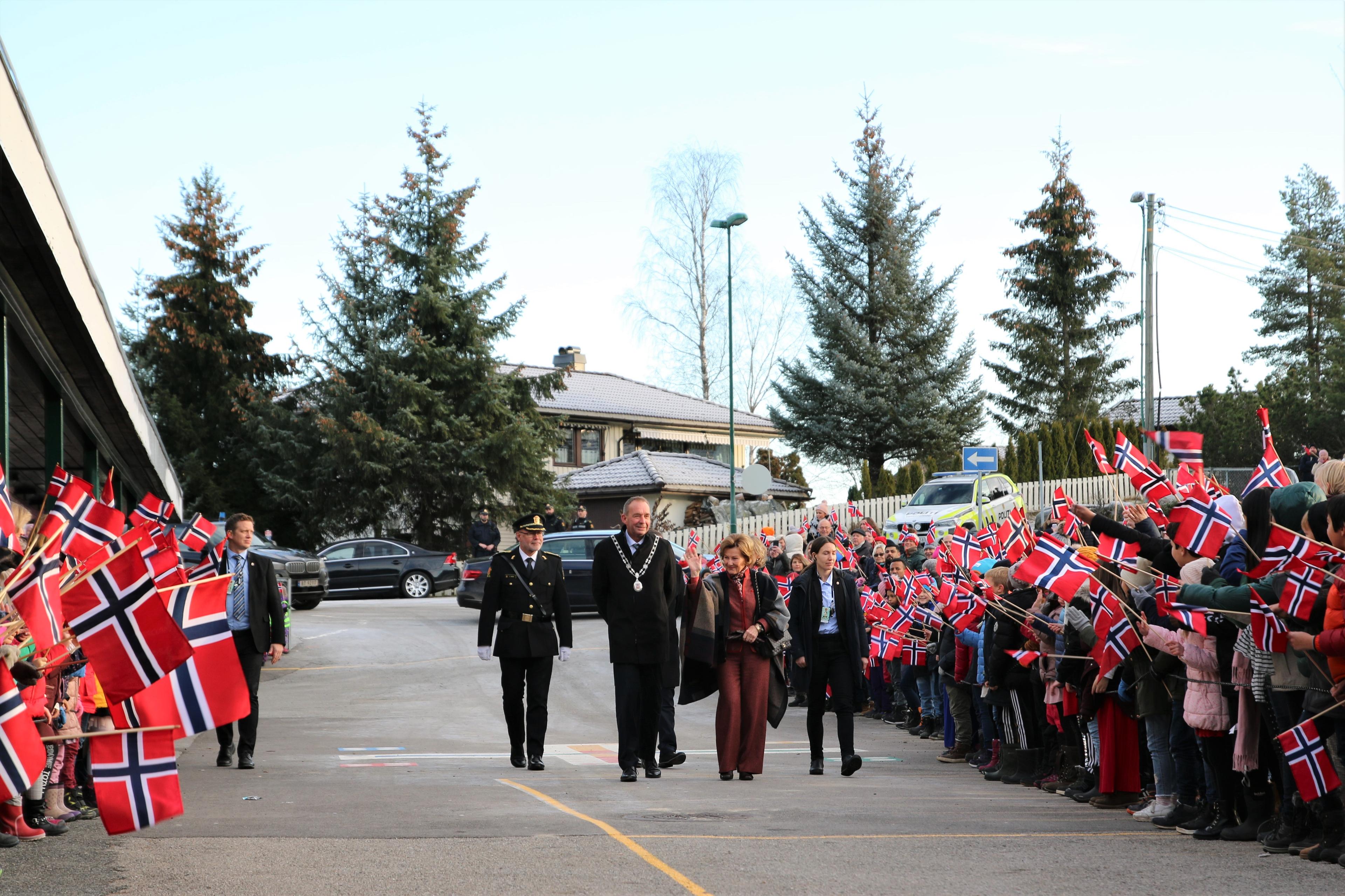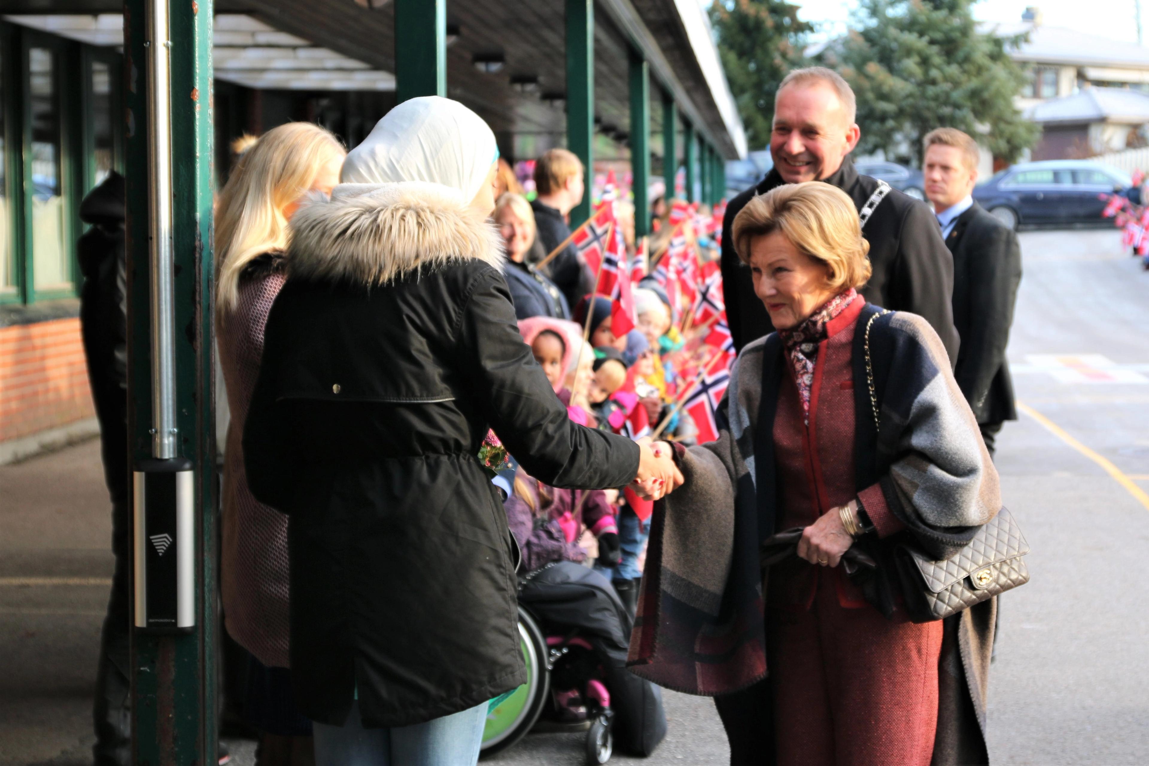 Dronningen ble tatt i mot av rektor Kim Aas, skoleinspektør Dorthe Naur og Elevrådslederne Jørgen Bjerkøen og Maram Alayoubi. Kunnskapsminister Jan Tore Sanner og juryleder for Dronning Sonjas skolepris, Inga Bostad var også på plass på Stigeråsen skole.