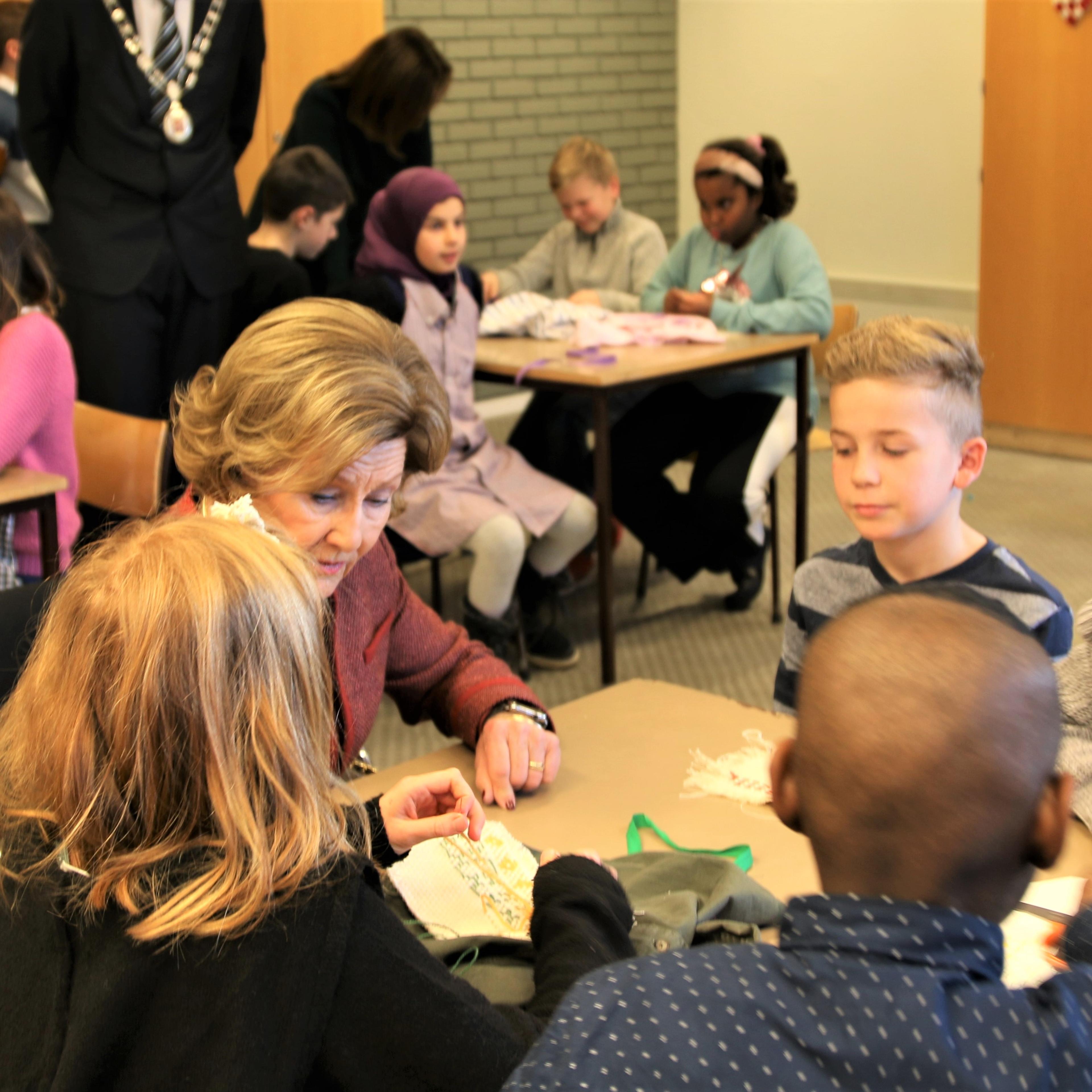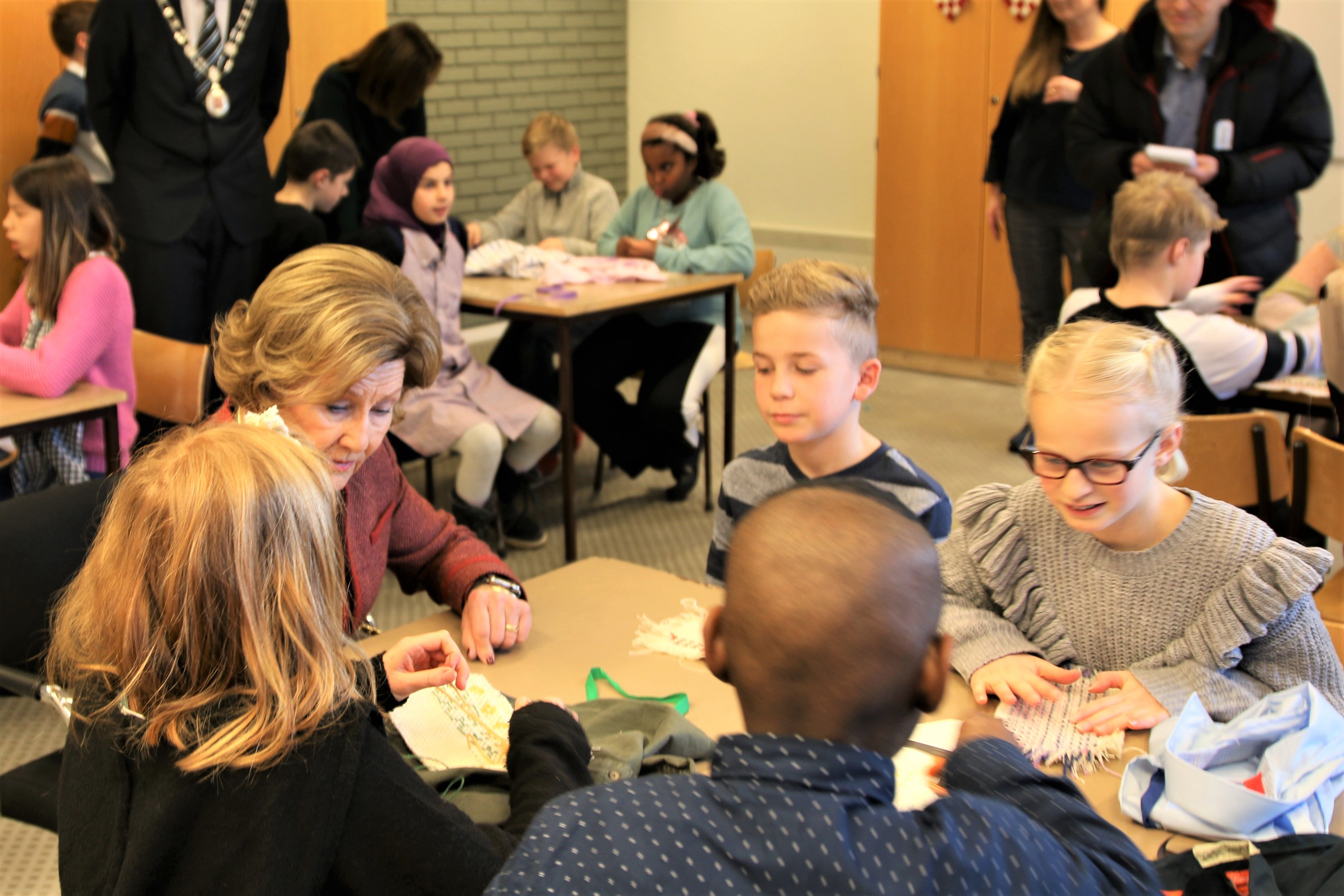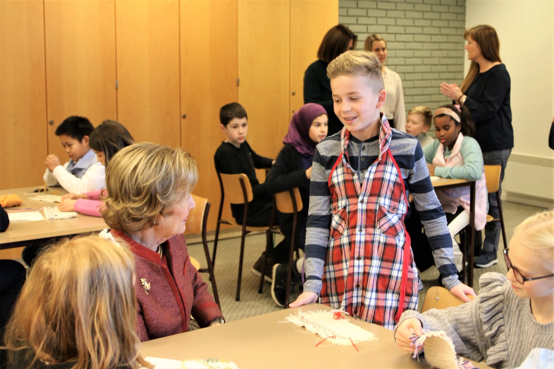 Dronningen ble tatt i mot av rektor Kim Aas, skoleinspektør Dorthe Naur og Elevrådslederne Jørgen Bjerkøen og Maram Alayoubi. Kunnskapsminister Jan Tore Sanner og juryleder for Dronning Sonjas skolepris, Inga Bostad var også på plass på Stigeråsen skole.